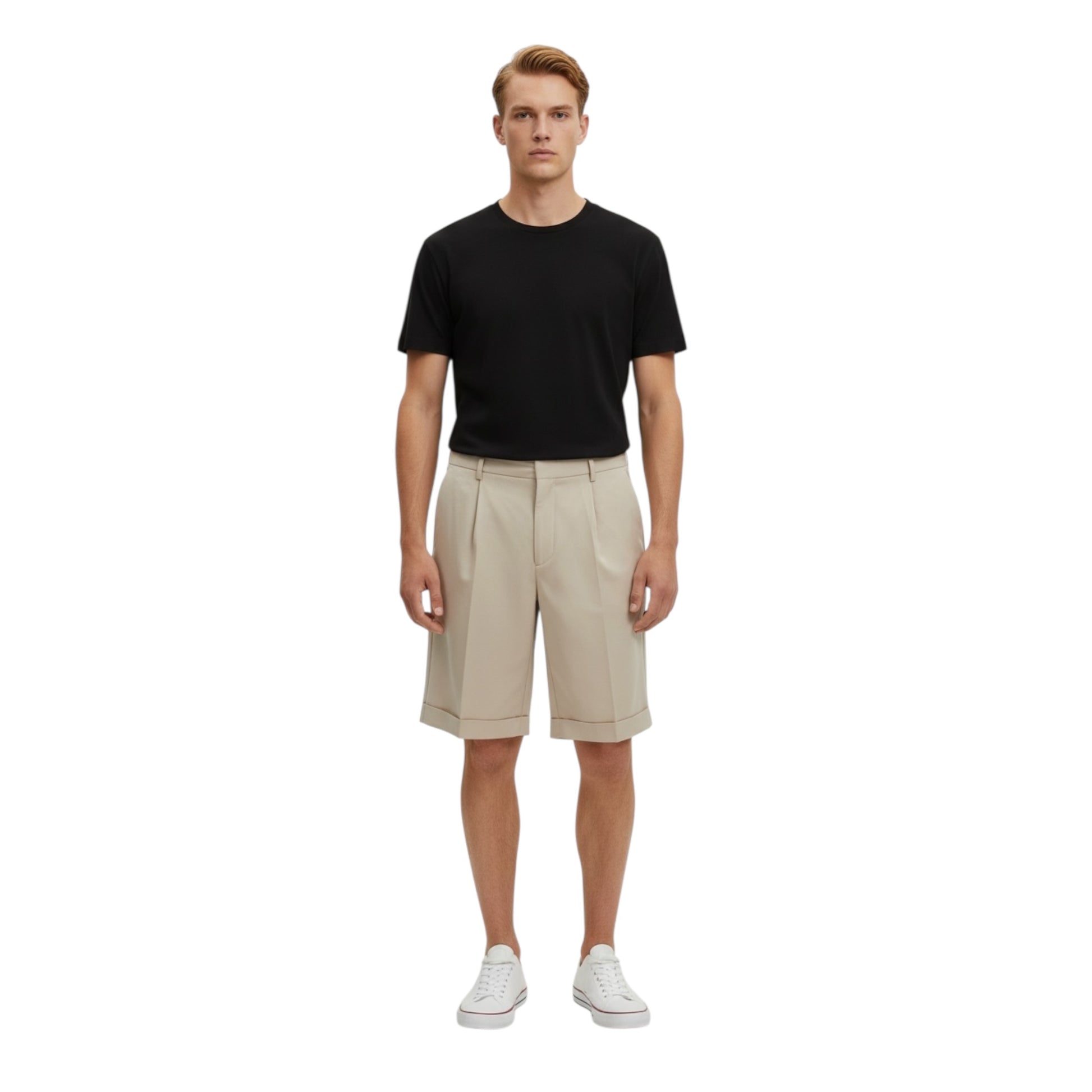 Bermuda da uomo in tonalità sabbia, caratterizzato da una linea pulita e contemporanea che unisce eleganza e praticità. Il design minimal con pence frontali dona struttura al capo, garantendo una vestibilità confortevole e raffinata.