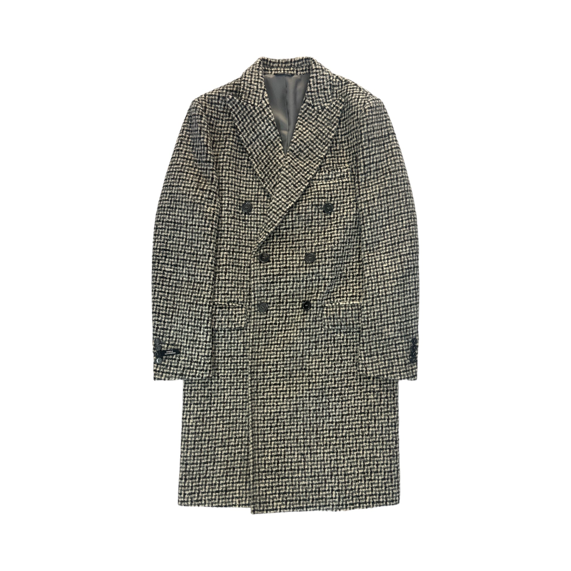 Cappotto doppiopetto con collo con reverberino a punta. Maniche lunghe con bottoni sul polsino tasche con patta sui fianchi. Orlo con spacco centrale posteriore.