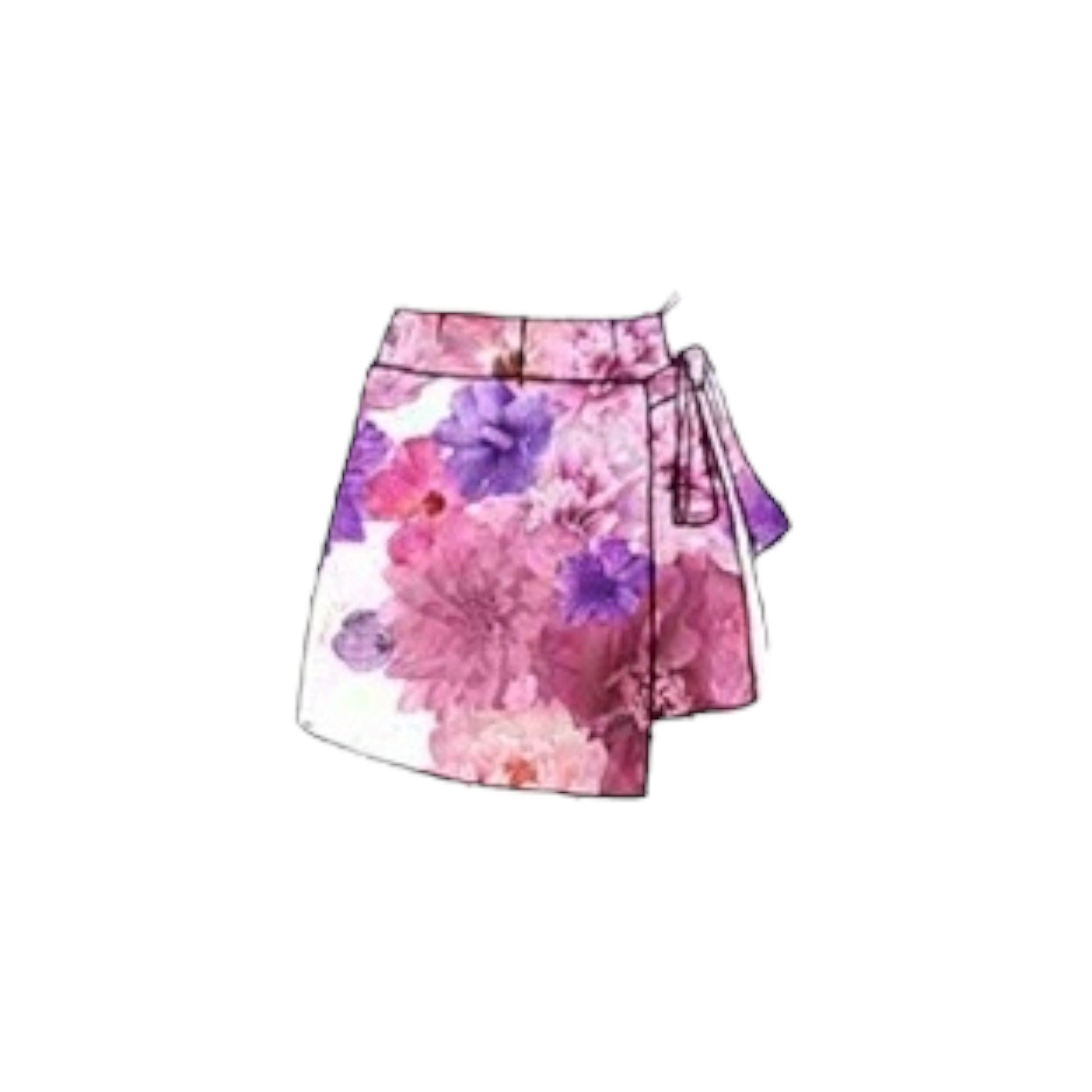 Gonna a pantaloncino in raso stampato. Chiusura con zip laterale. drappo asimmetrico anteriore con chiusura con nodo laterale.