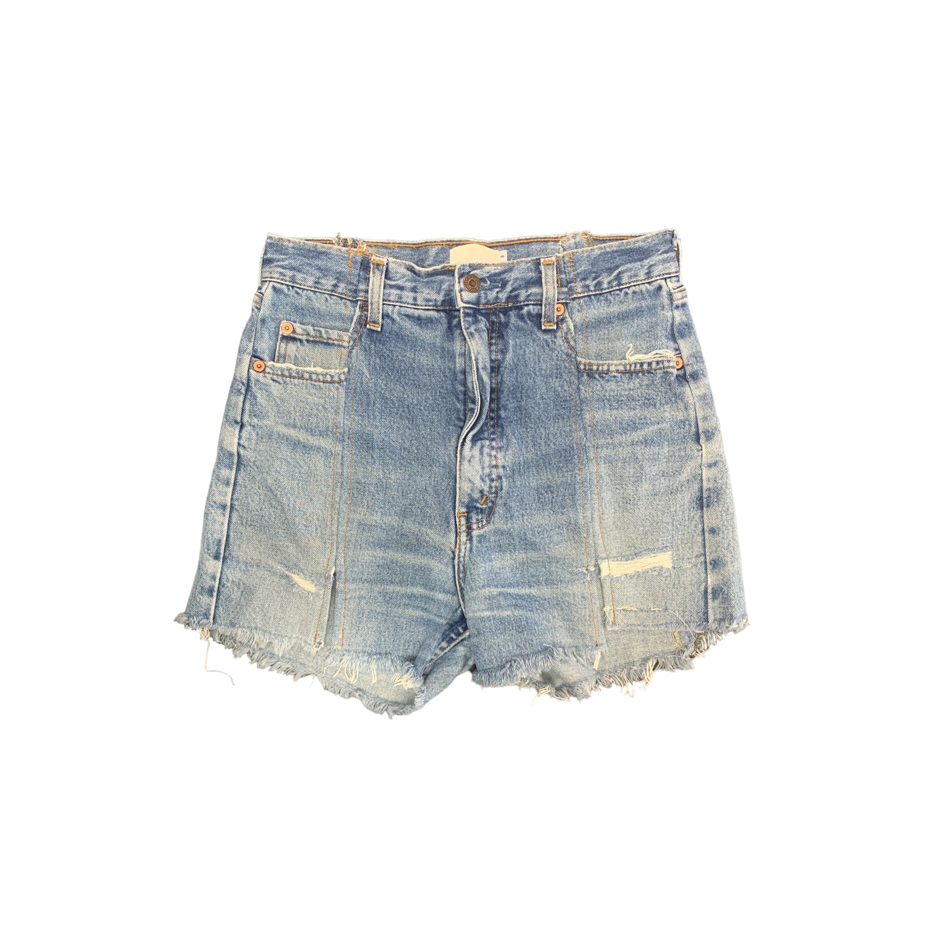 Shorts in denim realizzato su tela Levi's, rigenerata e ricostruita interamente. Il capo è realizzato con due spacchetti nella parte anteriore. Vita regolare. Abbottonatura con zip e bottone.