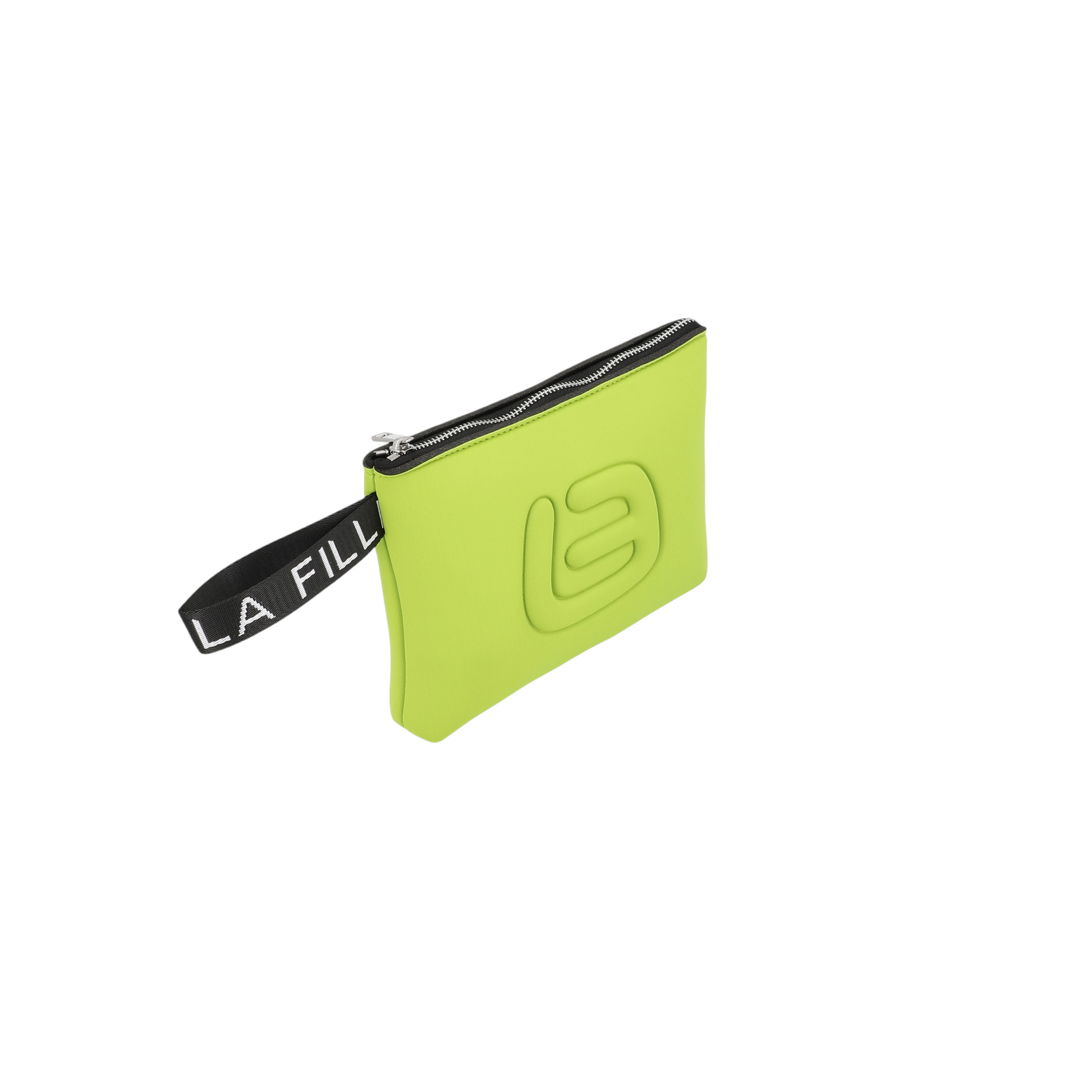 Mini pochette dal design compatto realizzata in materiale effetto neoprene, ideale per custodire piccoli oggetti essenziali con stile. Il design minimal è impreziosito dal logo frontale in rilievo e dal cinturino laterale con scritta a contrasto, che aggiunge un tocco distintivo.