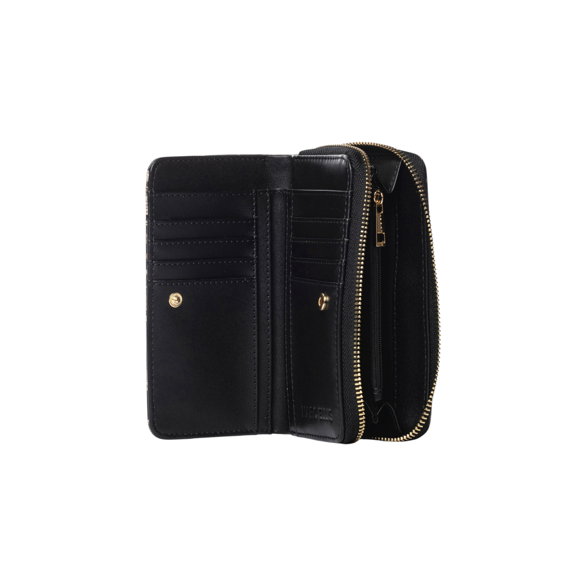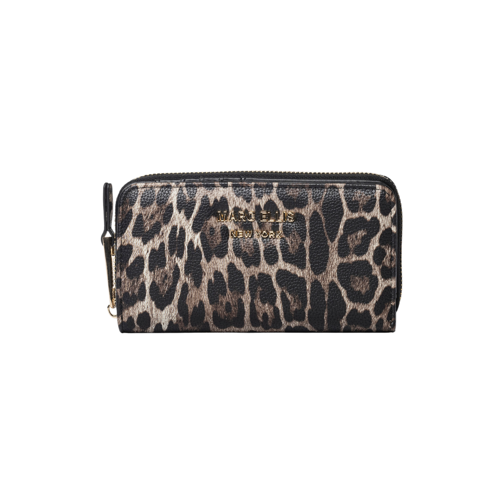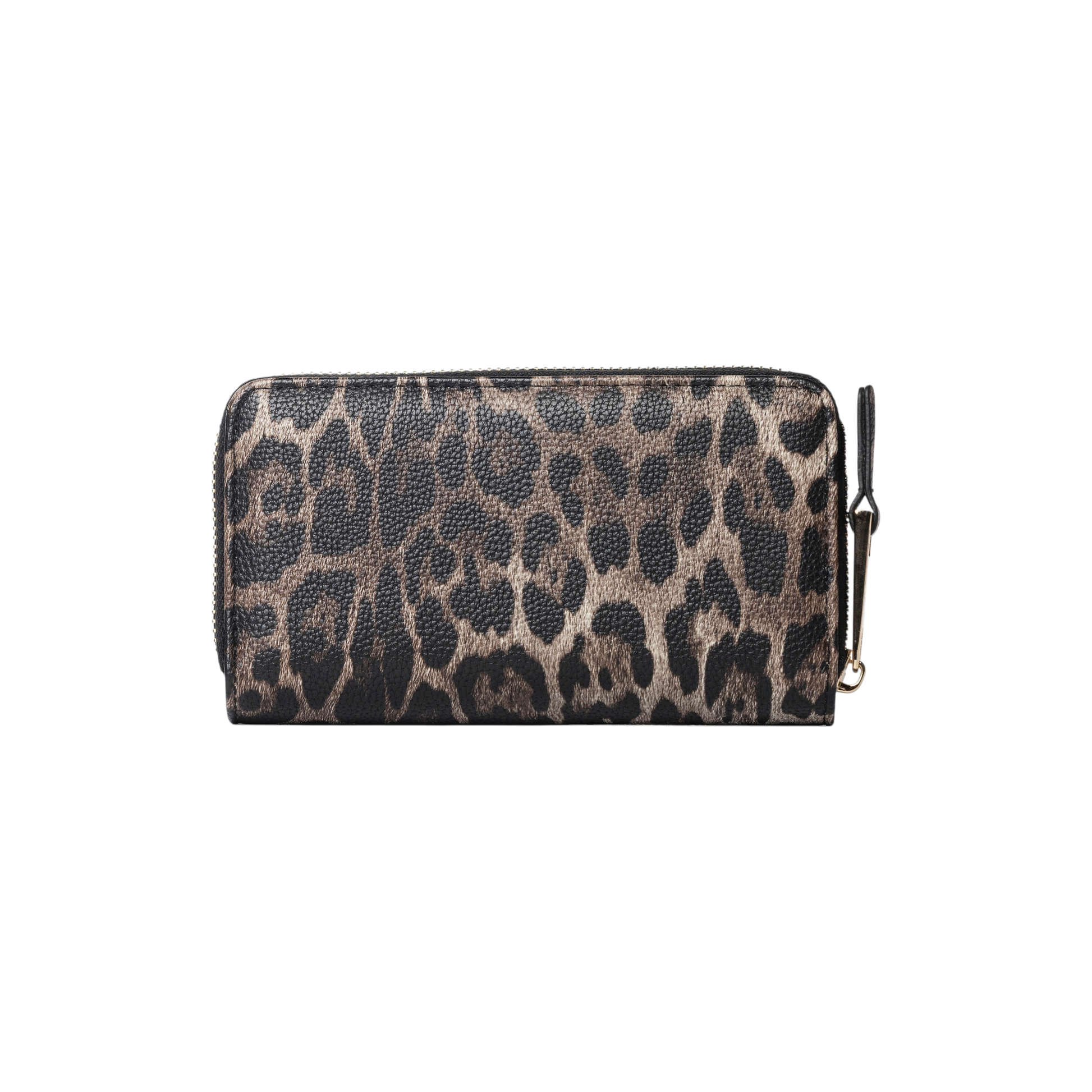 Portafoglio Julia con lavorazione con stampa leopardata, dal design moderno e sofisticato. Presenta chiusura a patta con bottone e cerniera, logo frontale. L'interno è organizzato con numerosi scomparti per carte, banconote e un pratico portamonete con zip centrale. Perfetto da usare anche come mini pochette.