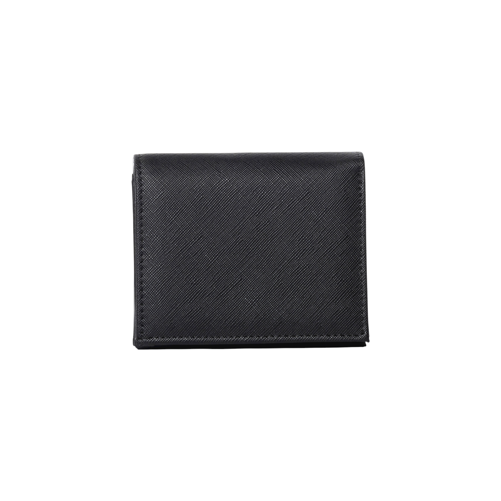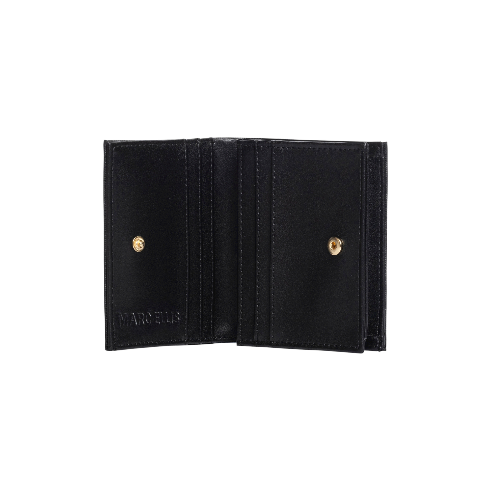 Elegante mini portafoglio Marc Ellis in ecopelle nera effetto saffiano, impreziosito dal logo lettering in metallo frontale color oro. Compatto e funzionale, offre scomparto per banconote, portamonete e 5 slot per carte. Con le sue dimensioni ridotte è ideale per chi cerca stile e praticità in ogni occasione.