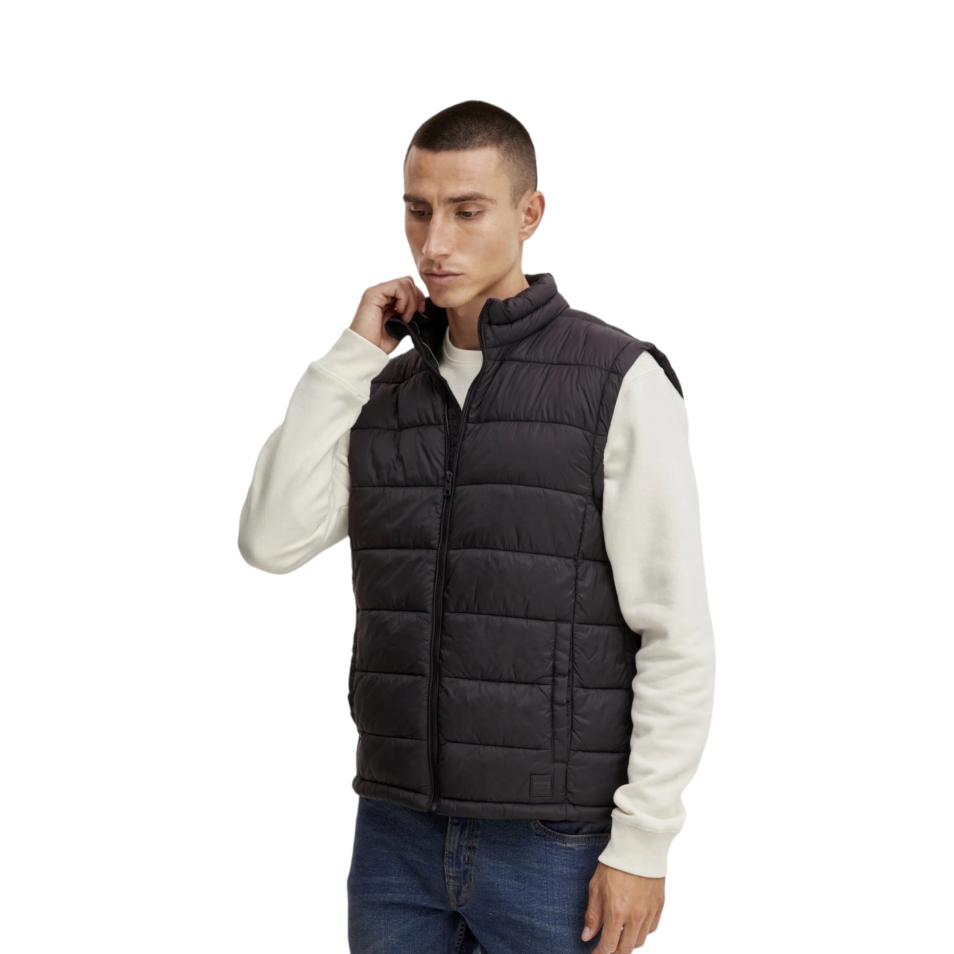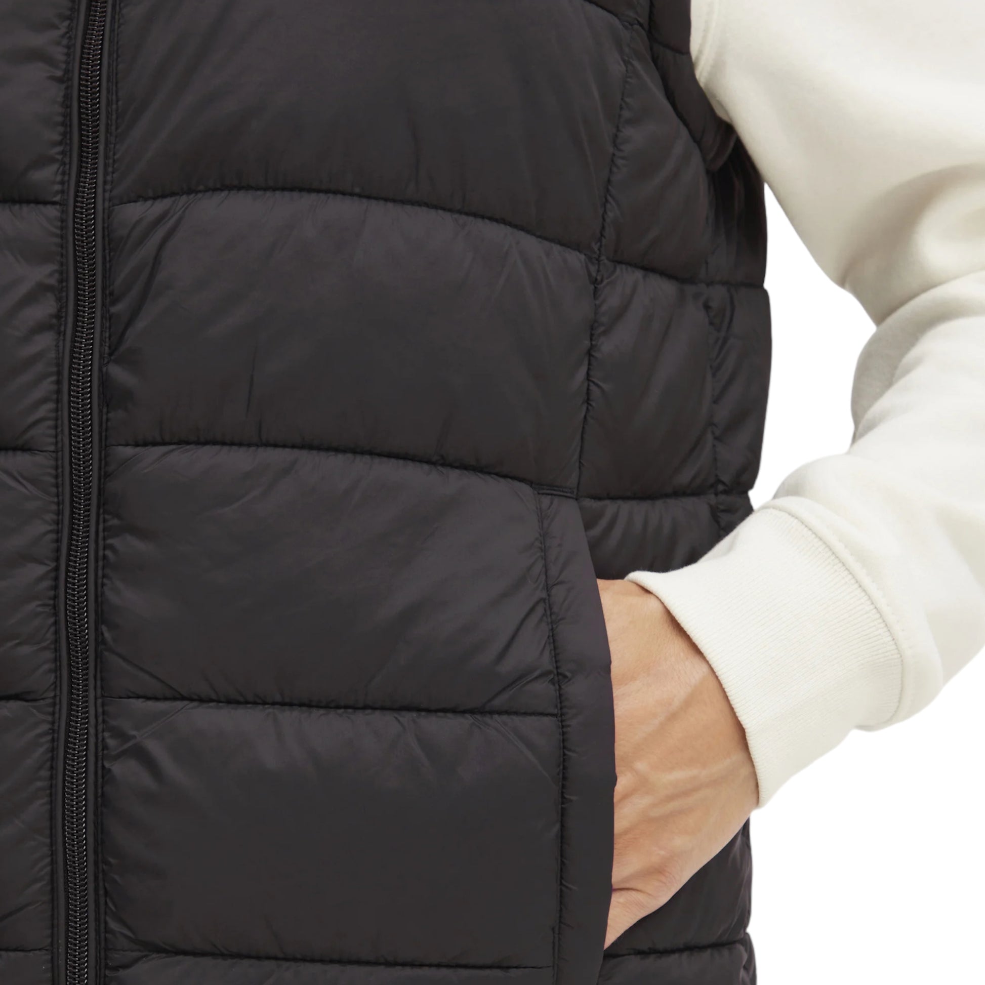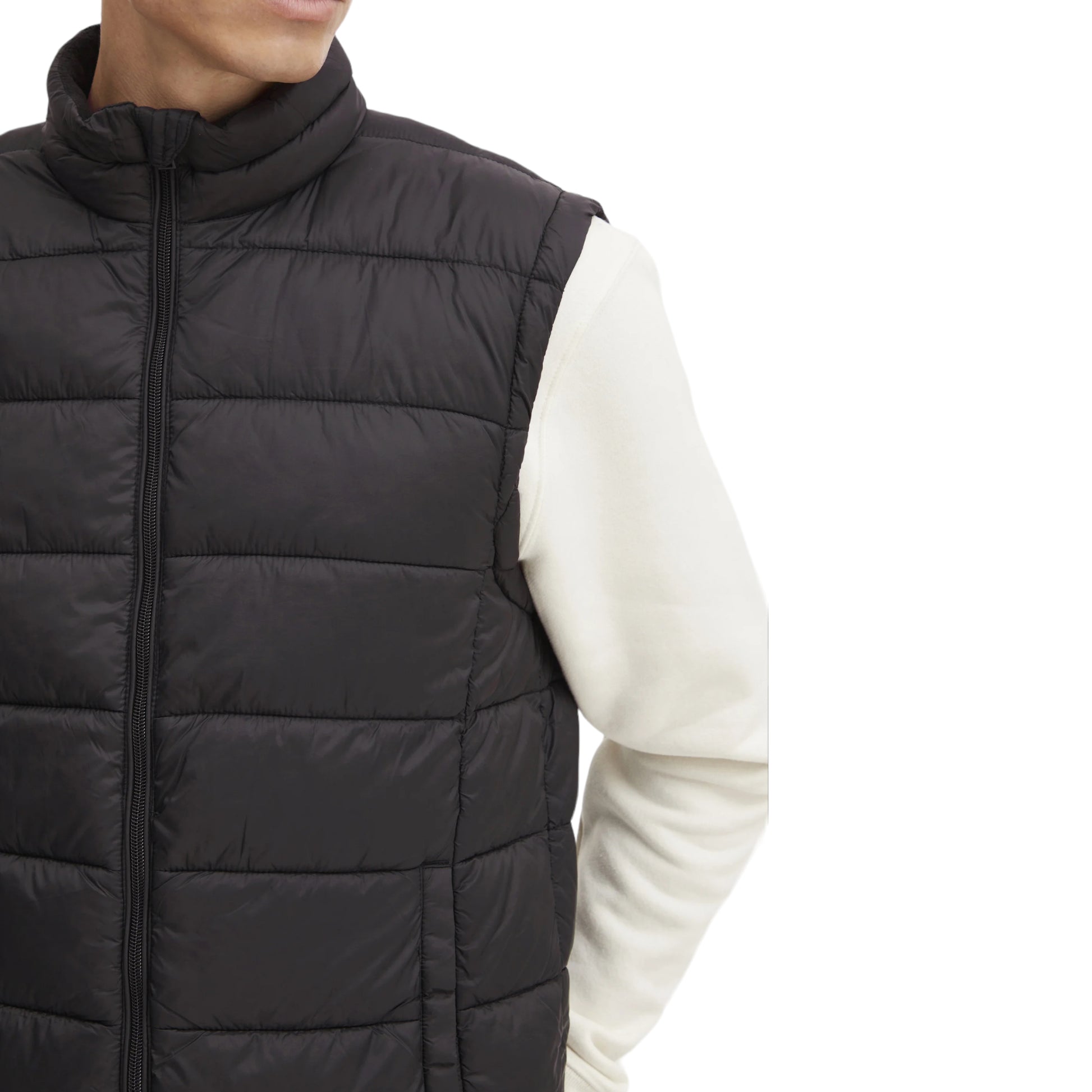 Piumino smanicato con chiusura a zip.