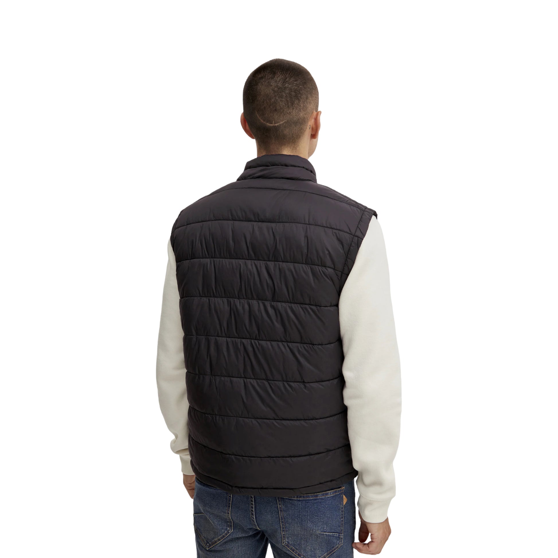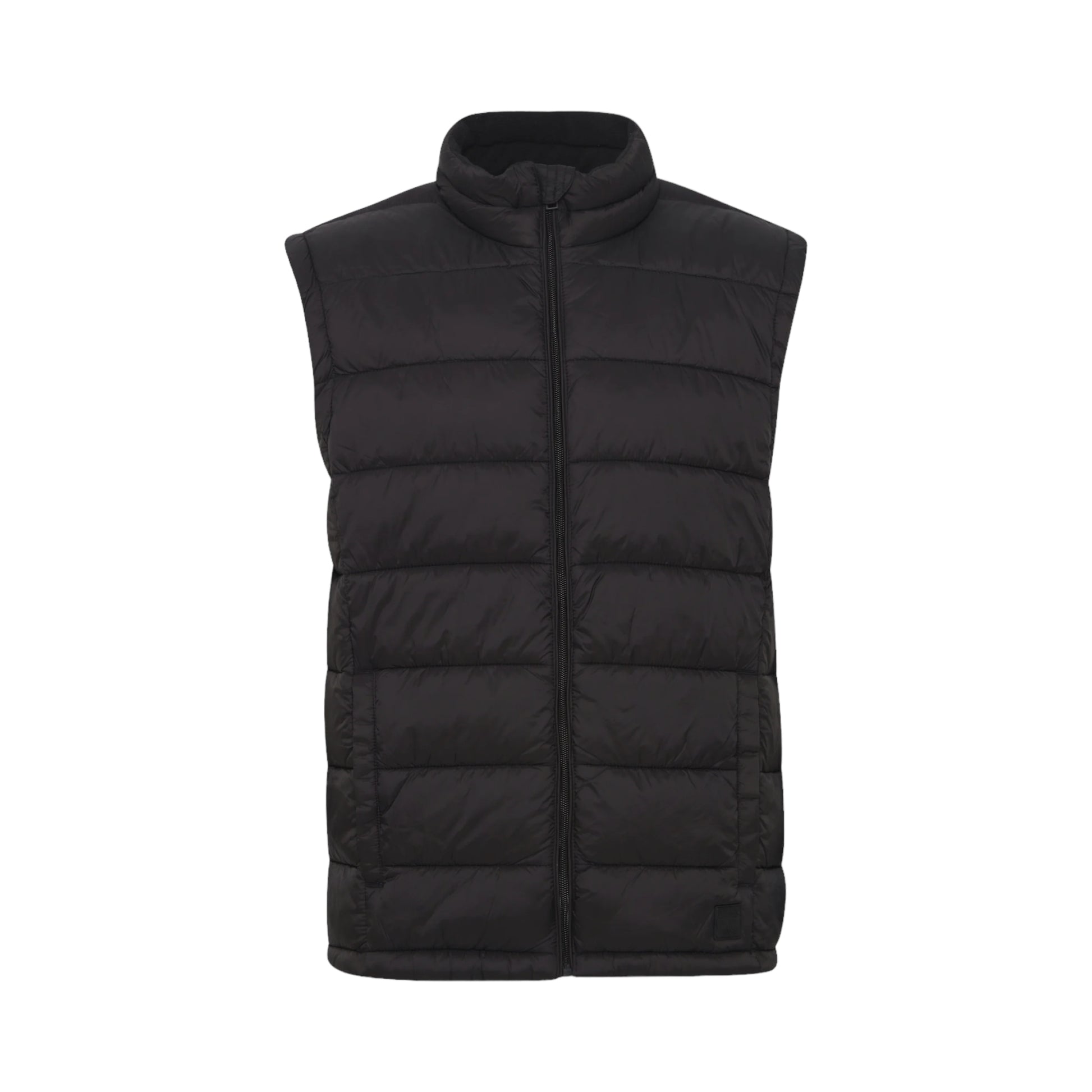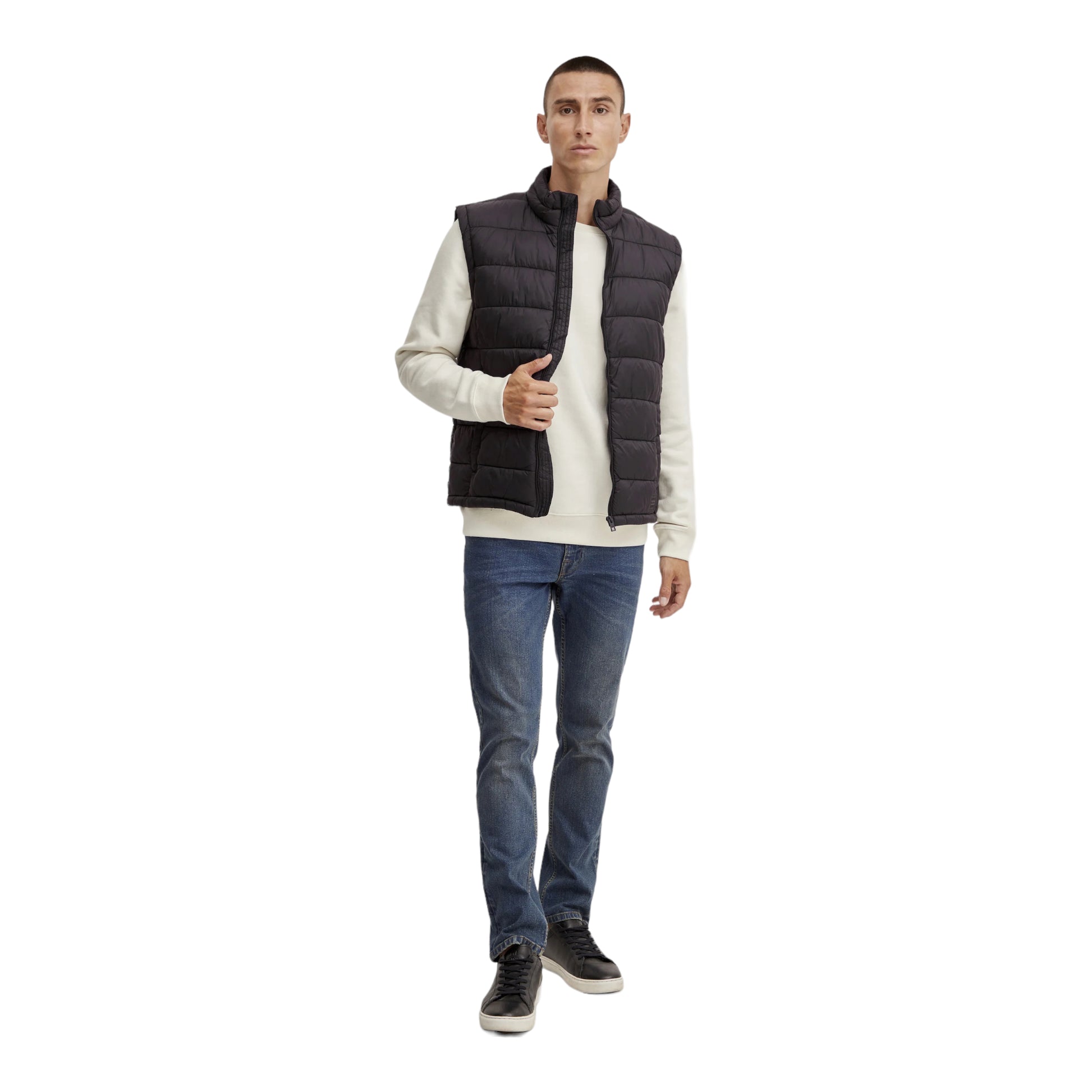 Piumino smanicato con chiusura a zip.