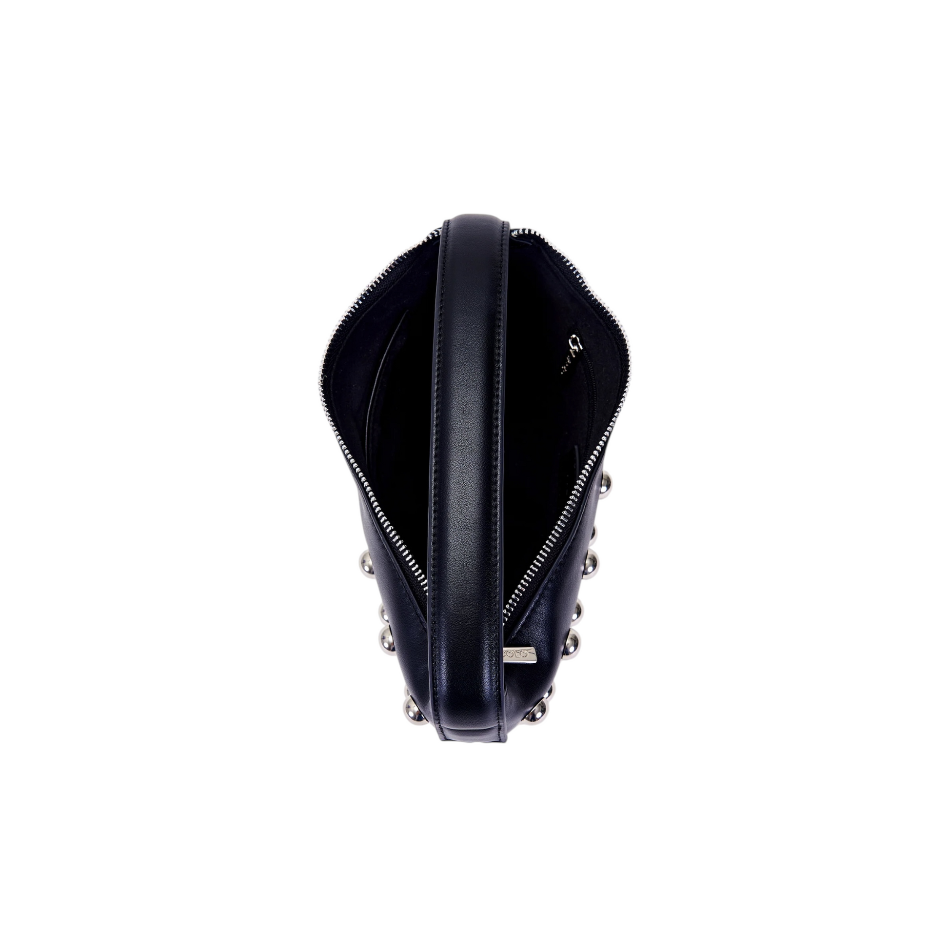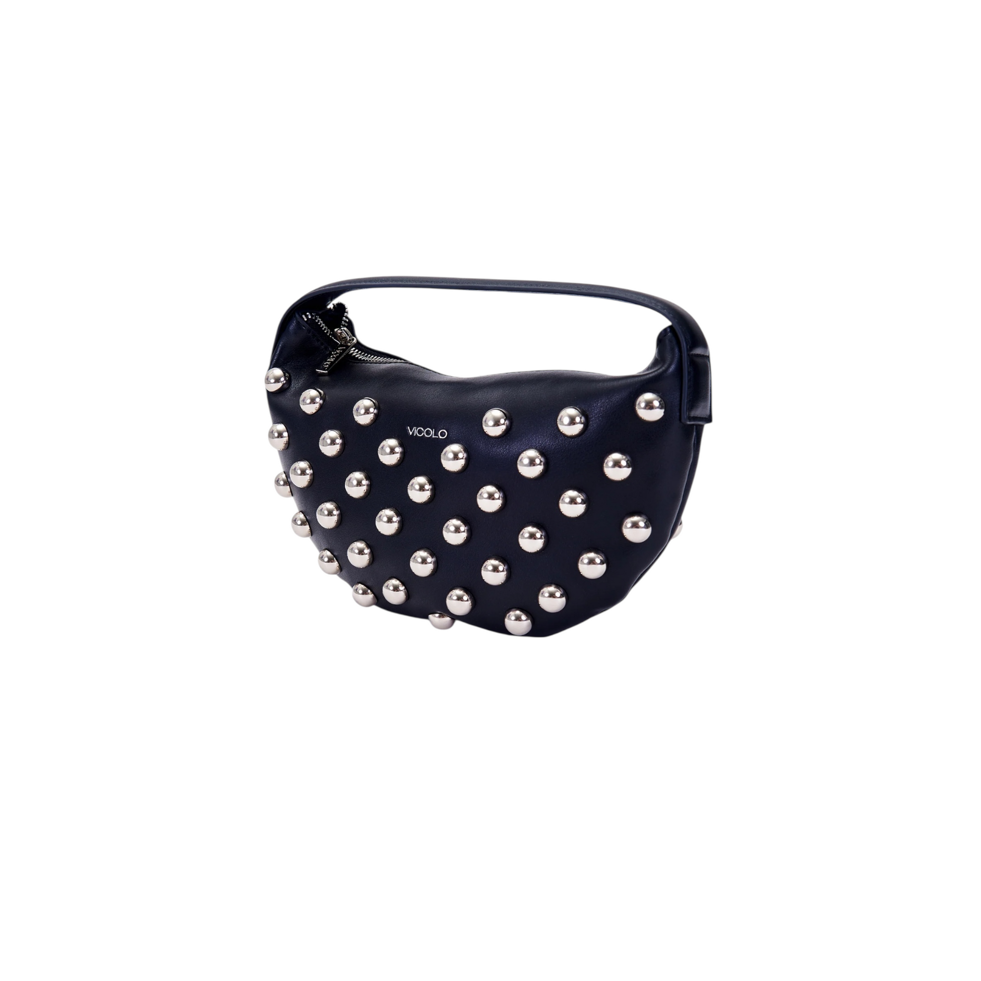 Borsa Croissant a mano in ecopelle con borchie in metallo lucido applicate. Chiusura con cerniera. Dettaglio logo Vicolo laserato. Finiture anticate color argento. Tasca interna con cerniera e taschina piatta.
