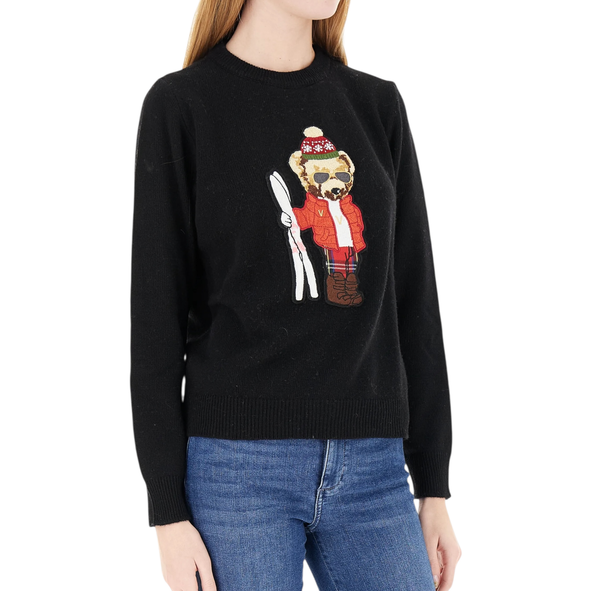 Aggiungi un tocco di divertimento ai tuoi look invernali con la maglia girocollo Vicolo. Realizzata in lana morbidissima, presenta un adorabile ricamo di un orso con gli sci. Resta caldo e alla moda con questo articolo unico.