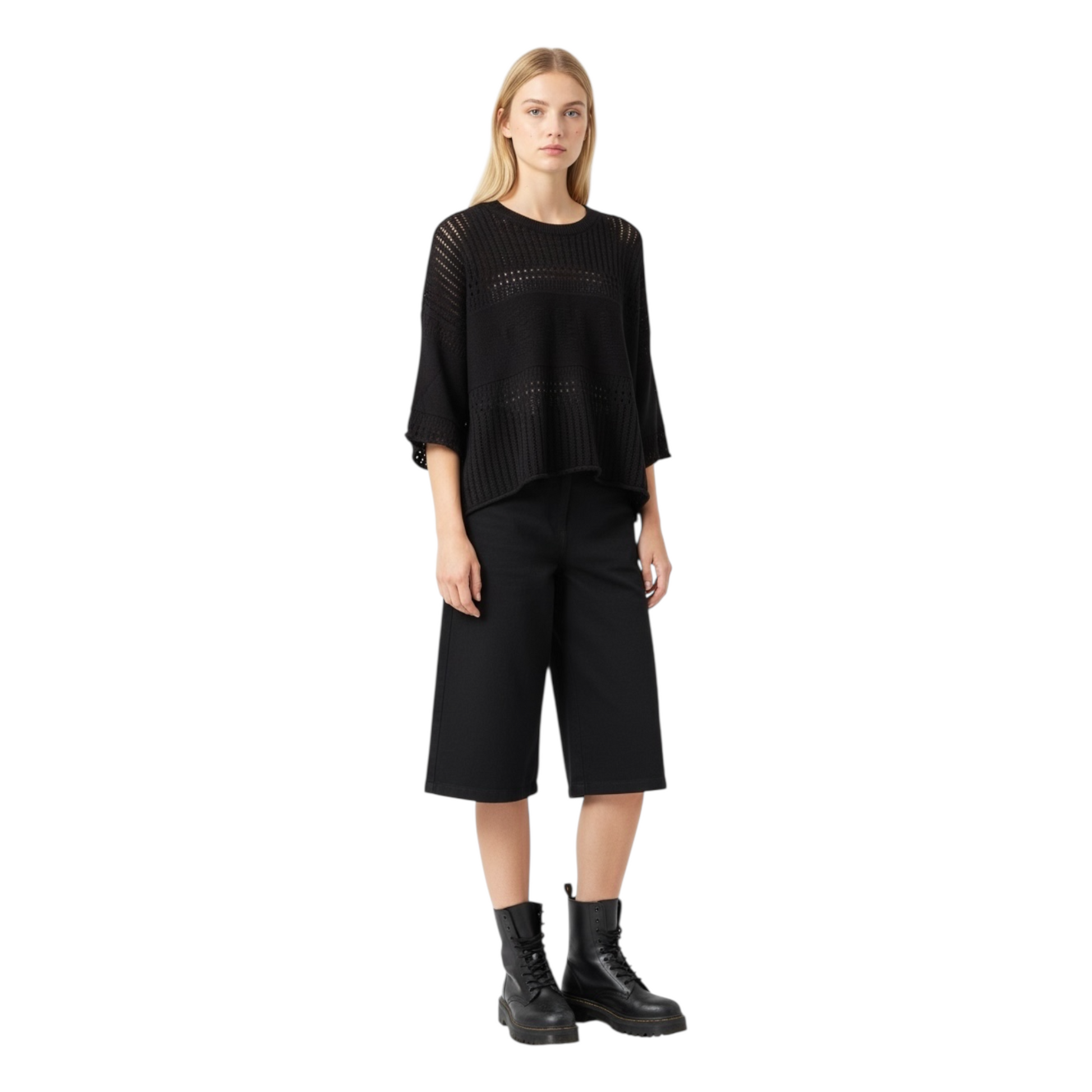 Maglia crop con lavorazione traforata, maniche a mezza lunghezza e taglio box fit che garantisce una silhouette contemporanea e raffinata. Il logo embossed sul davanti rappresenta un dettaglio di design esclusivo e riconoscibile. La trama traforata crea un effetto visivo sofisticato e leggero, ideale per un look casual-chic da indossare nella vita quotidiana. Un capo versatile che si abbina facilmente a diversi stili, perfetto per chi ricerca qualità costruttiva e design curato.