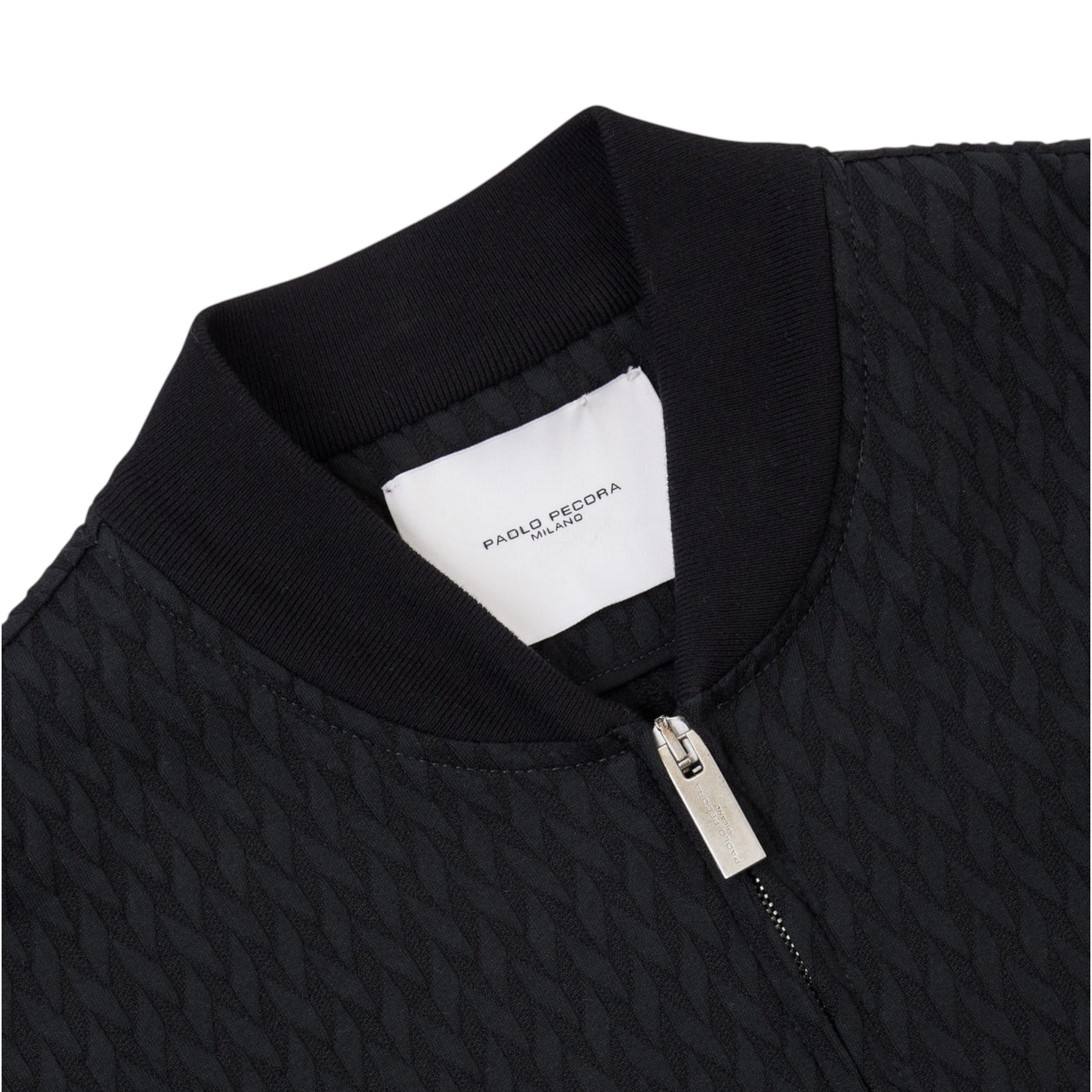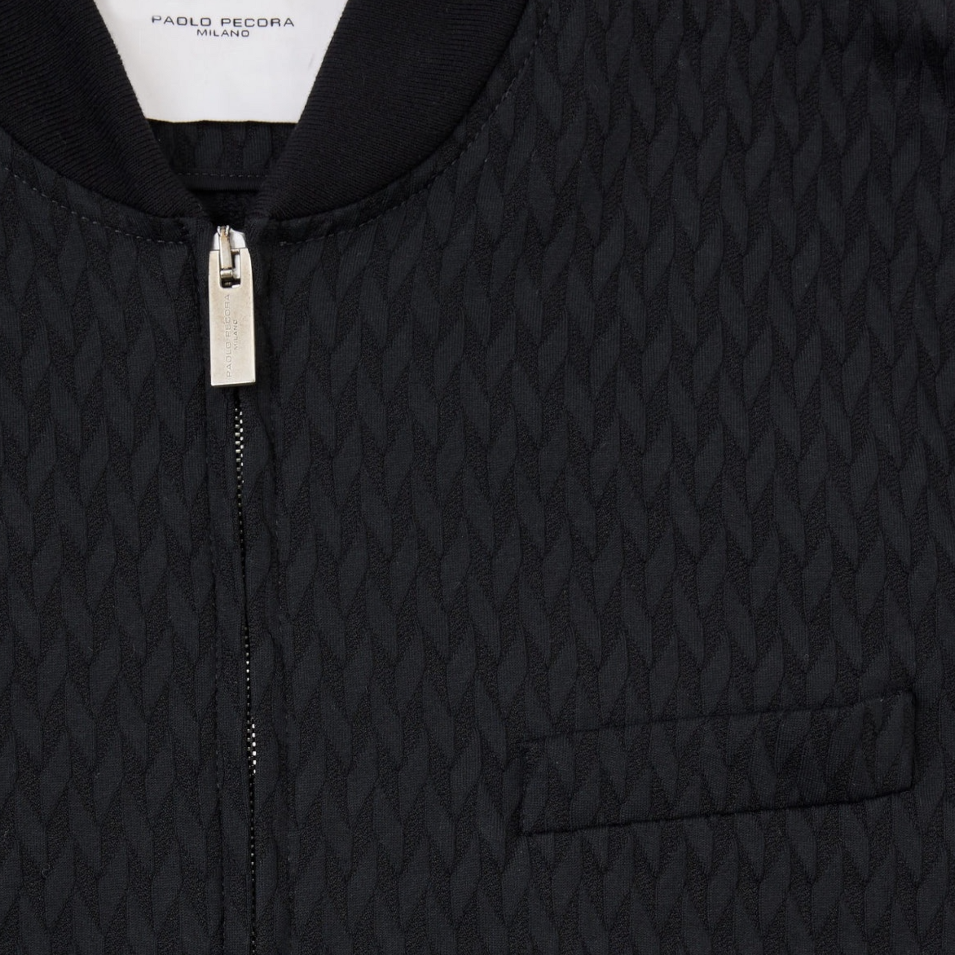 Giubbotto varsity con collo bomber è realizzato in un morbido e avvolgente jersey effetto maglia di colore nero. Un capo pronto a seguire ogni spostamento quotidiano con tutto lo stile di Paolo Pecora.