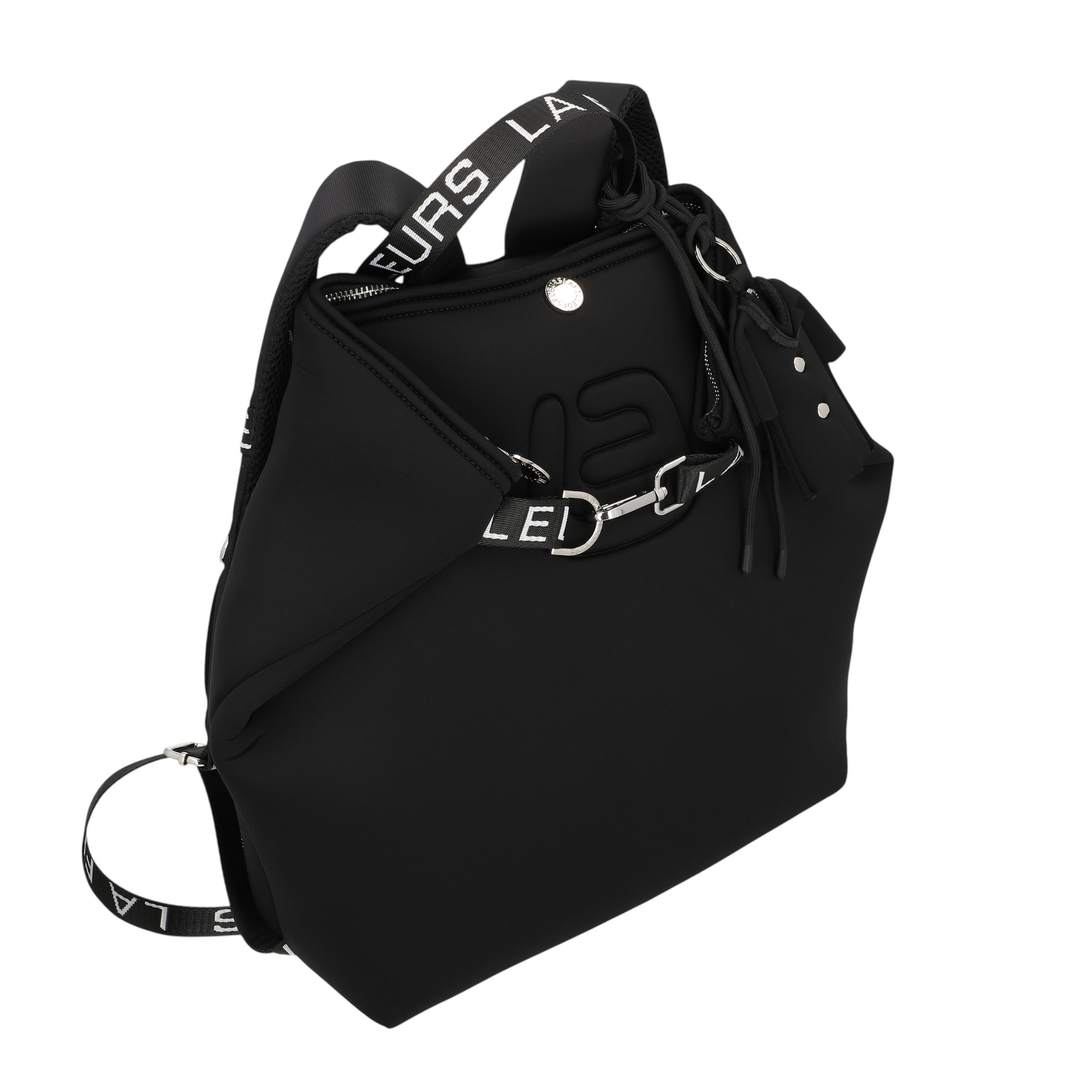 Borsa a spalla dal design contemporaneo realizzata in materiale effetto neoprene di colore nero. La silhouette morbida e strutturata offre ampio spazio interno, ideale per l’uso quotidiano. Dotata di manici resistenti con logo a contrasto, chiusura con gancio metallico e dettagli decorativi laterali con lacci e borchie. Il look minimal è arricchito da finiture lucide che donano un tocco sofisticato. Perfetta per outfit casual e urbani.