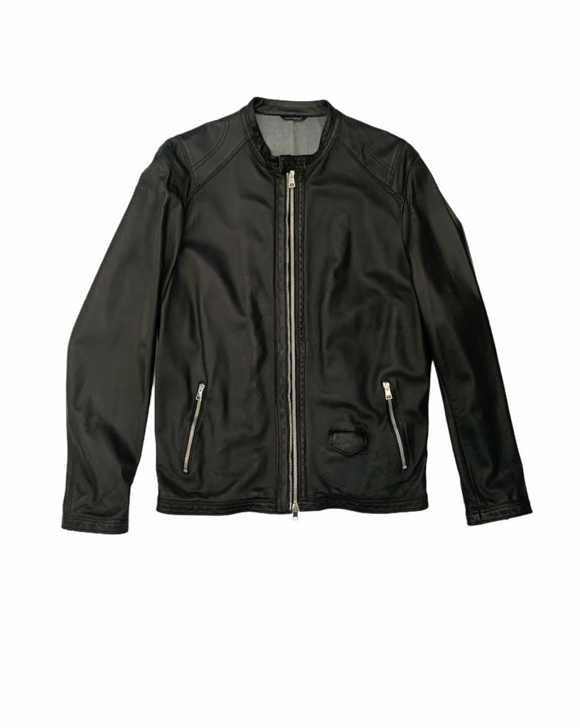 Cazadora de piel con cremallera frontal y bolsillos laterales.
