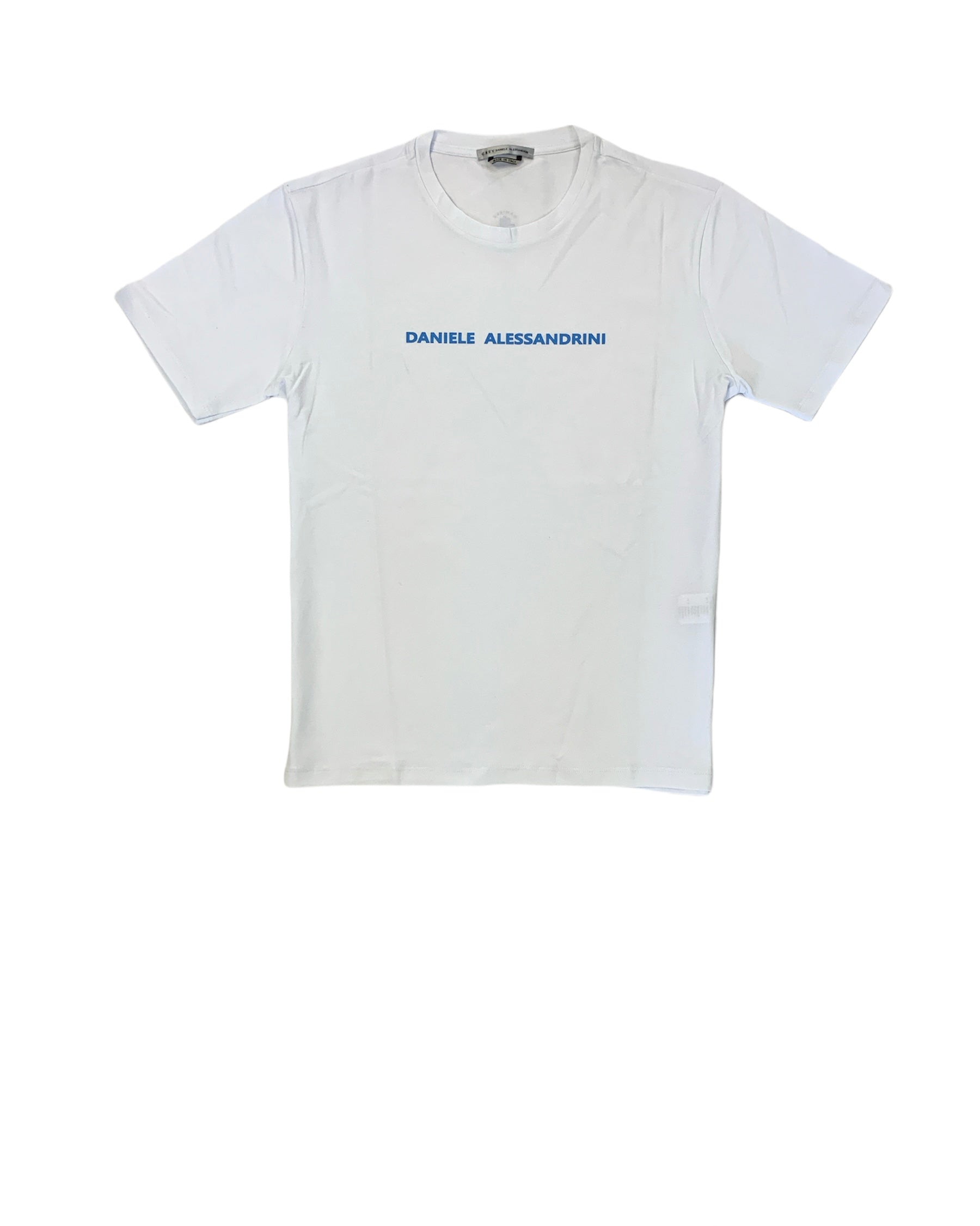 Camiseta de media manga y cuello redondo con estampado "Daniele Alessandrini" azul claro.