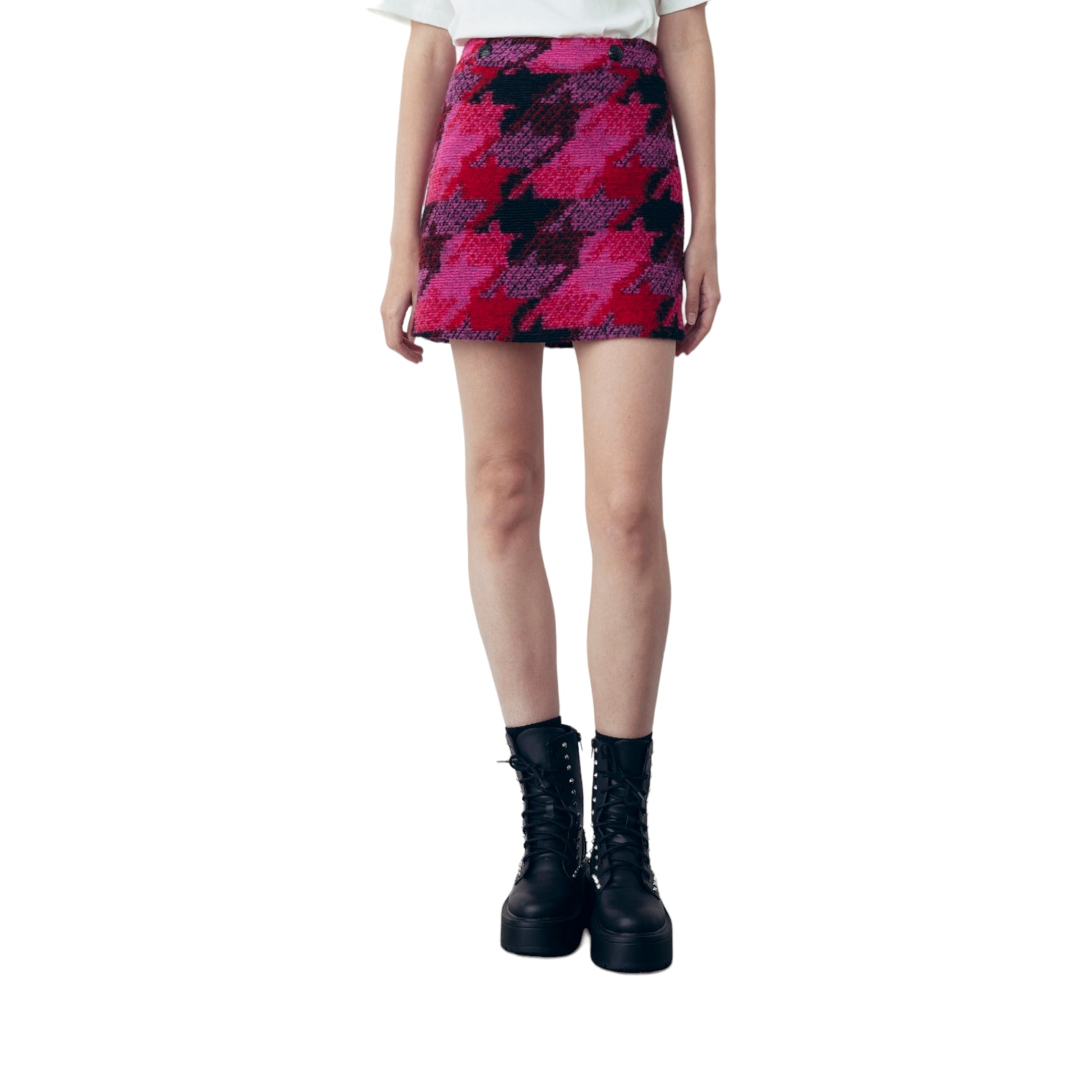 Falda de tela de talle alto con cierre de cremallera lateral y botones decorativos en la cintura