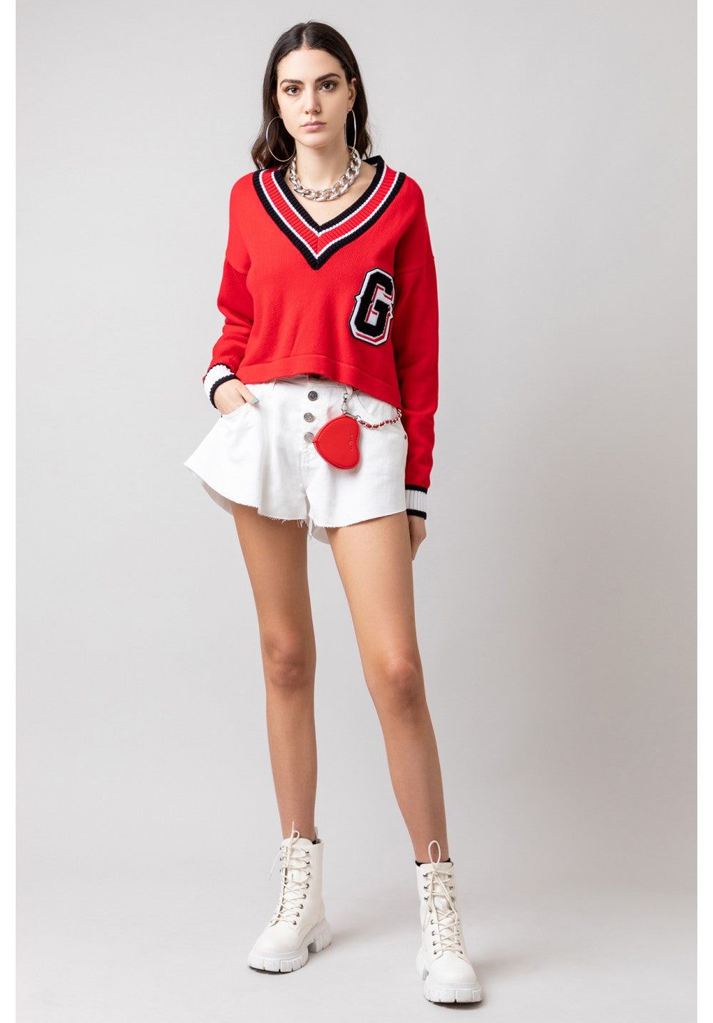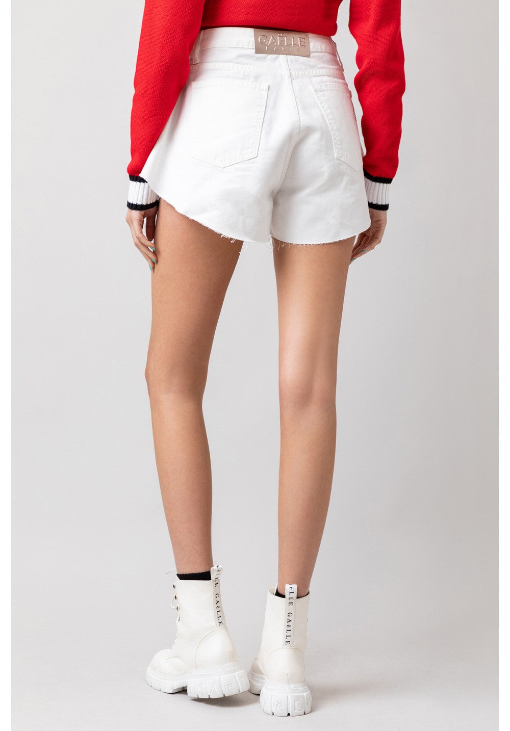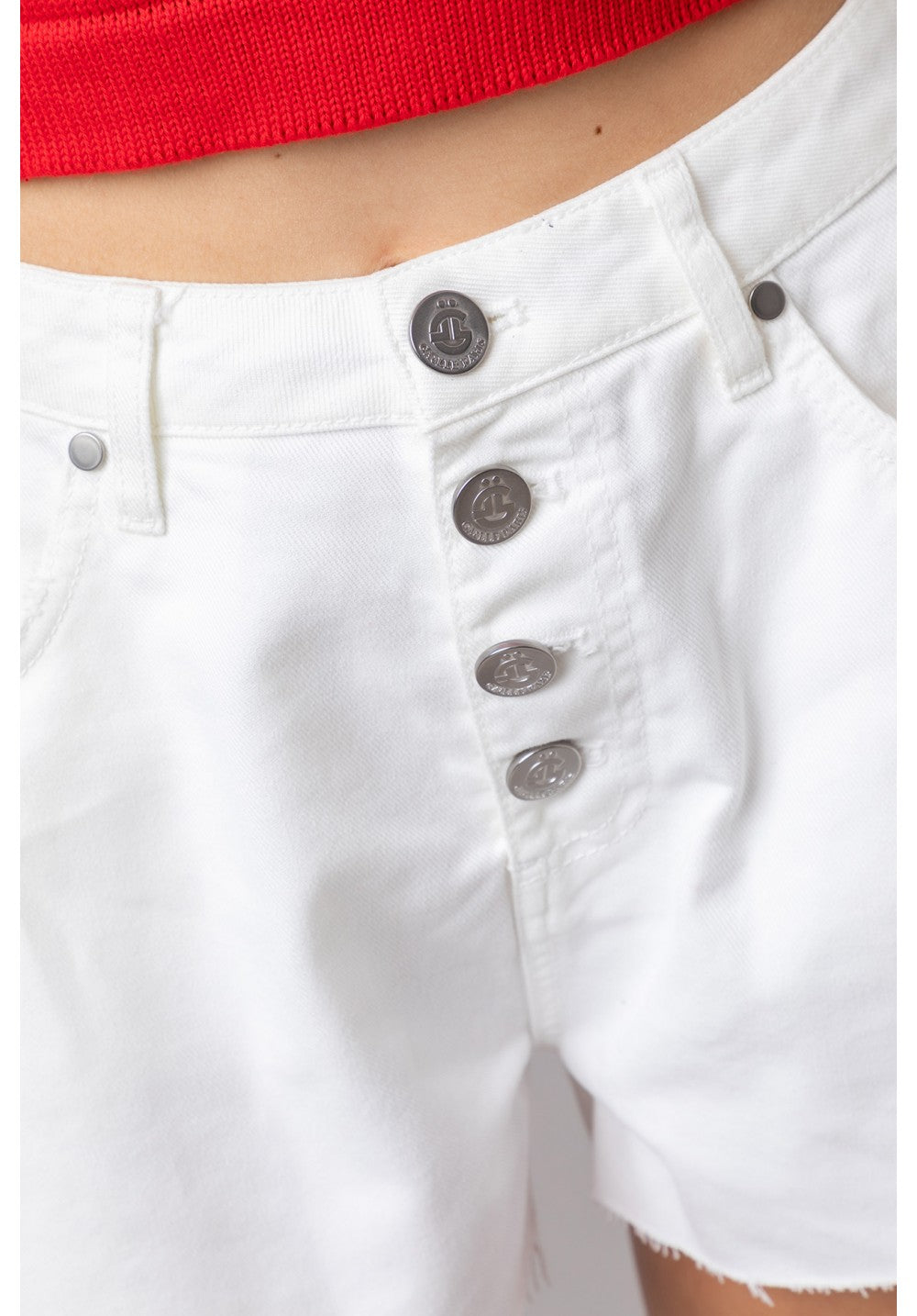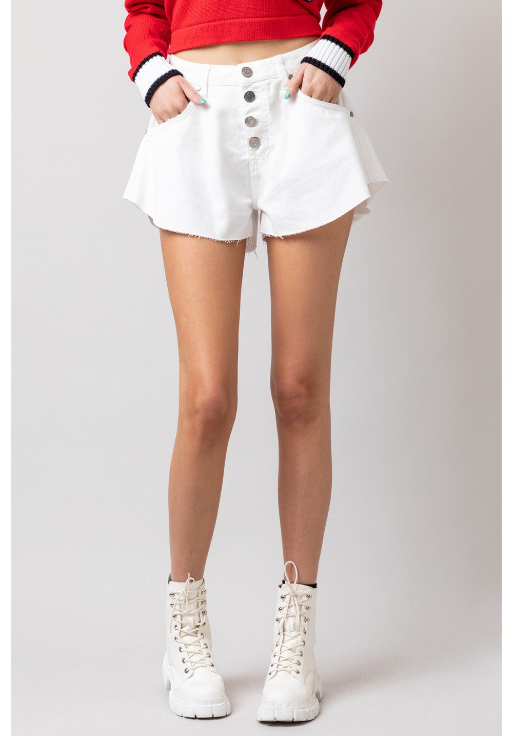 Falda corta en denim estampado con maxilazo de piel sintética.