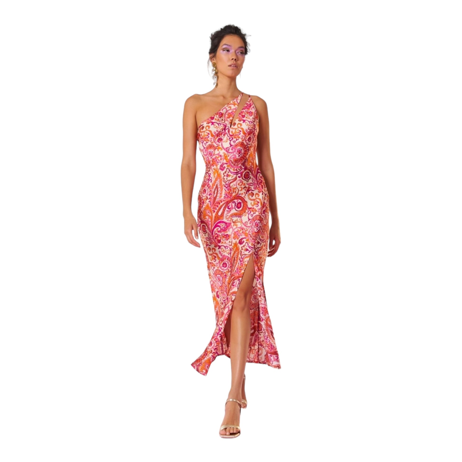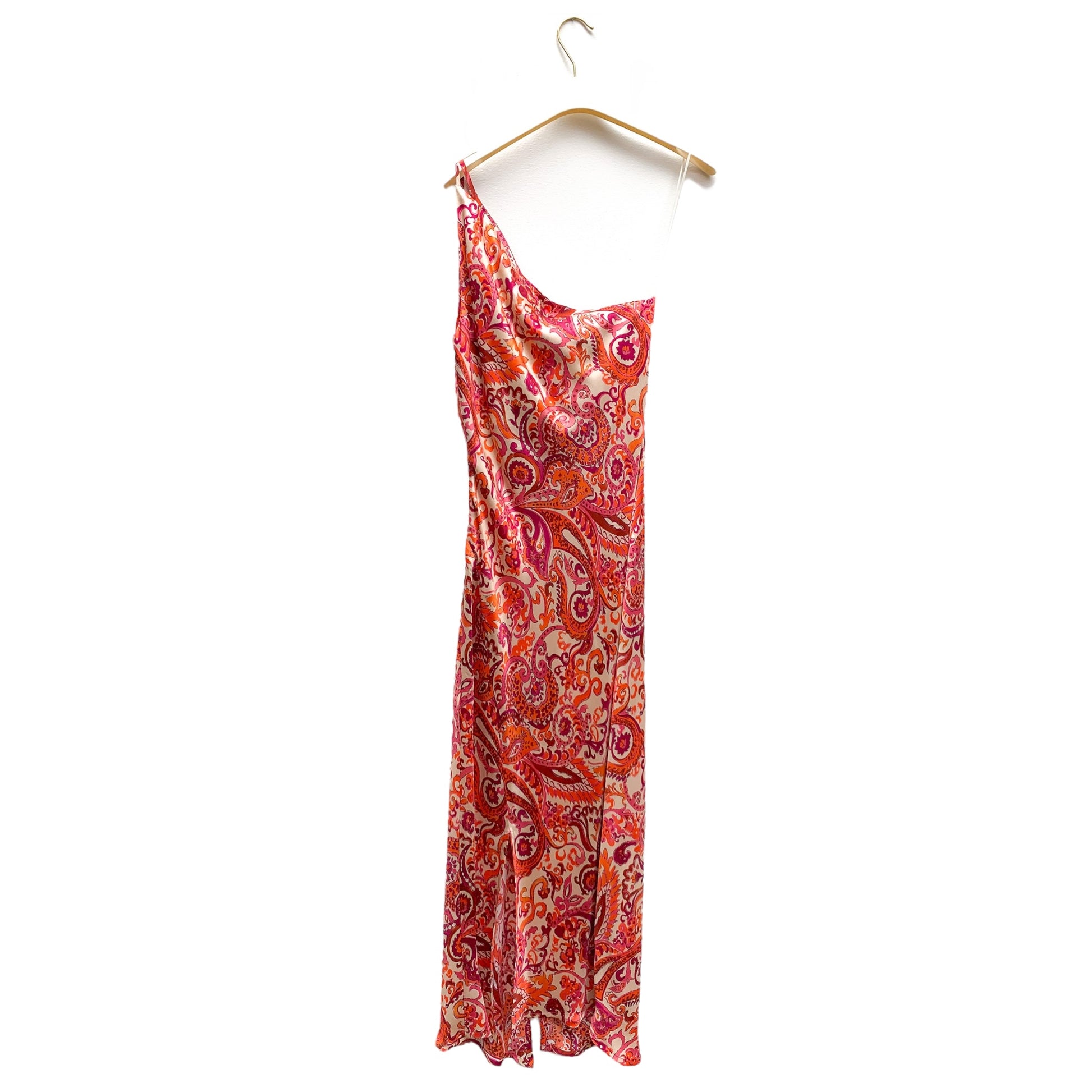 Vestido largo asimétrico con doble tirante en el lado izquierdo. Cierre de cremallera lateral oculta en la costura. Aberturas tanto delanteras como traseras.