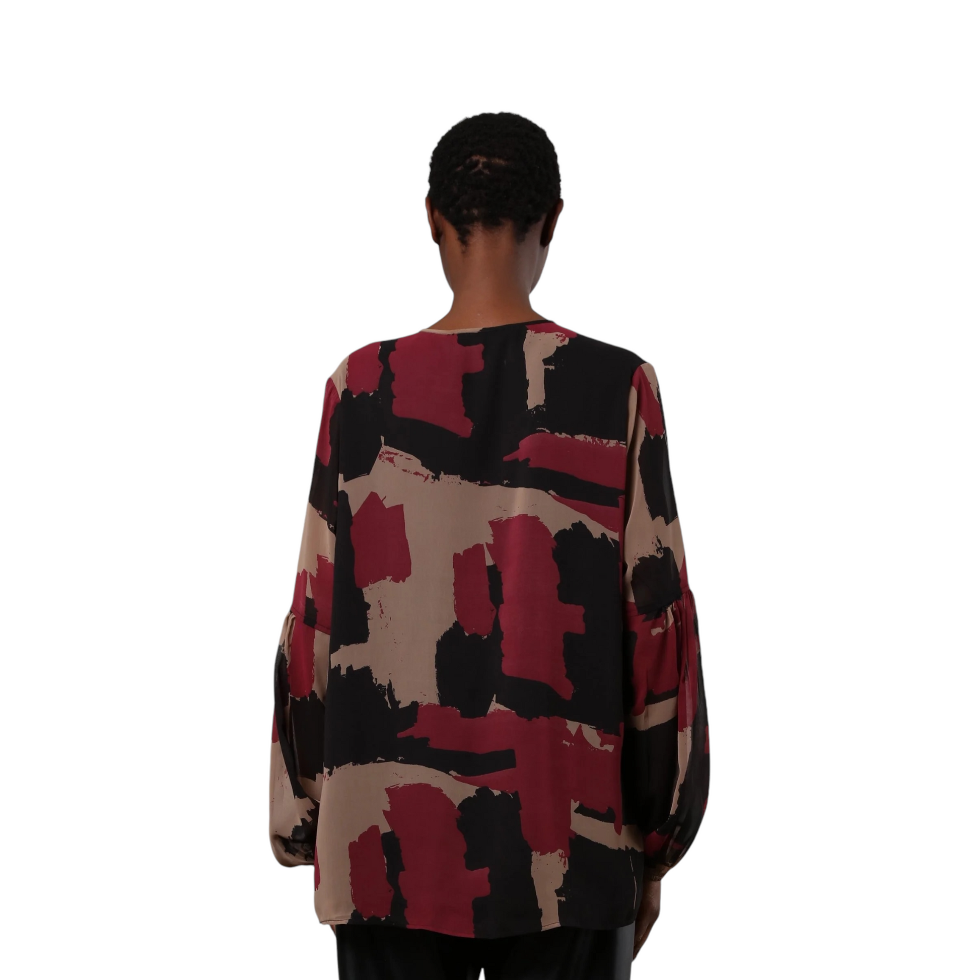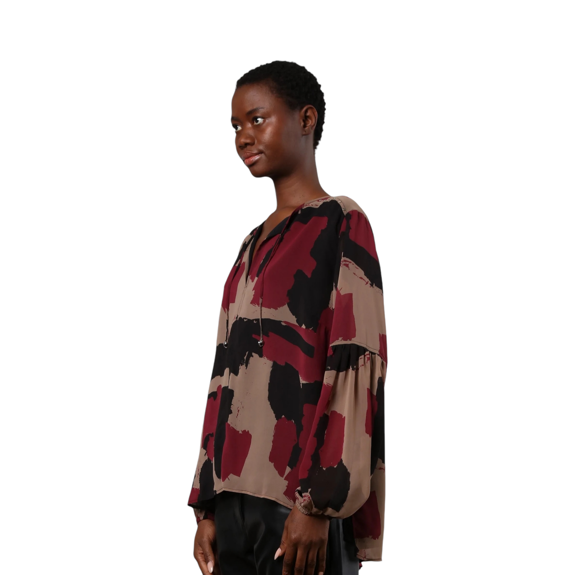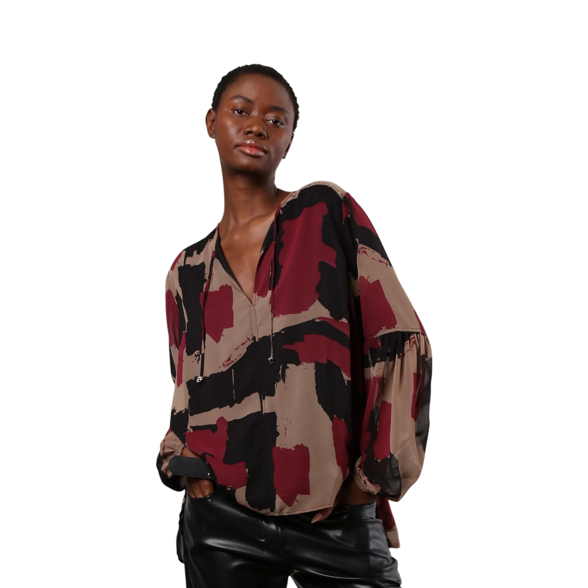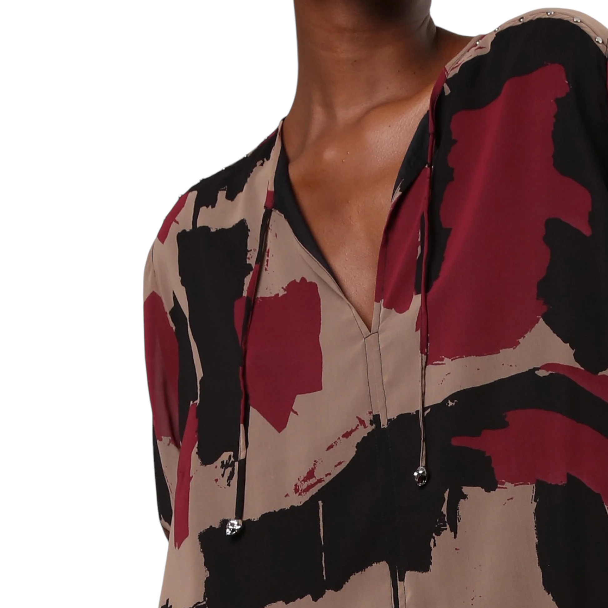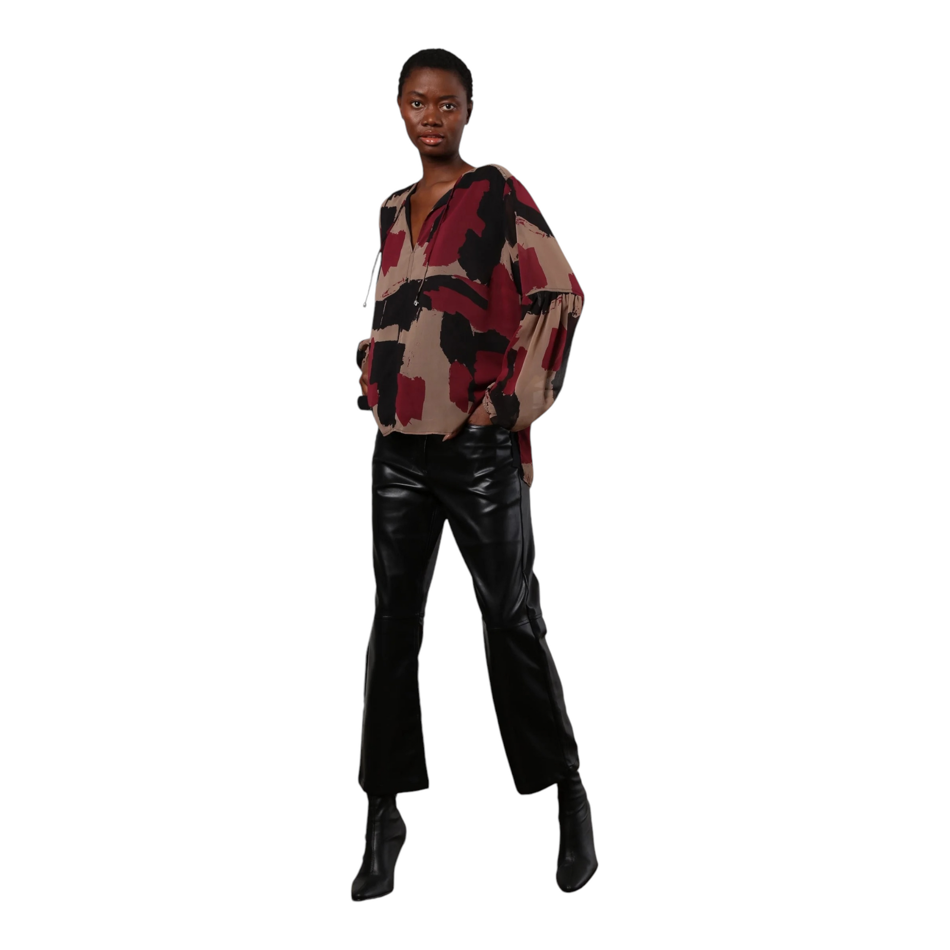 Scoprite la blusa Succesion, realizzata a mano in seta vegana con la classica stampa Religion astratta dipinta a mano nei toni del nero e del bordeaux. Con maniche lunghe a campana e un design facile da indossare, questa blusa lunga fino ai fianchi slancia la figura. La scollatura a cravatta, con le estremità in corda di teschio ele biccole borchie piatte applicatesulle spalle aggiungono un tocco rock. Abbinatelo ai vostri jeans preferiti per un look casual da tutti i giorni. La modella indossa la taglia S, lunghezza: 63 cm, circonferenza toracica: 116 cm.