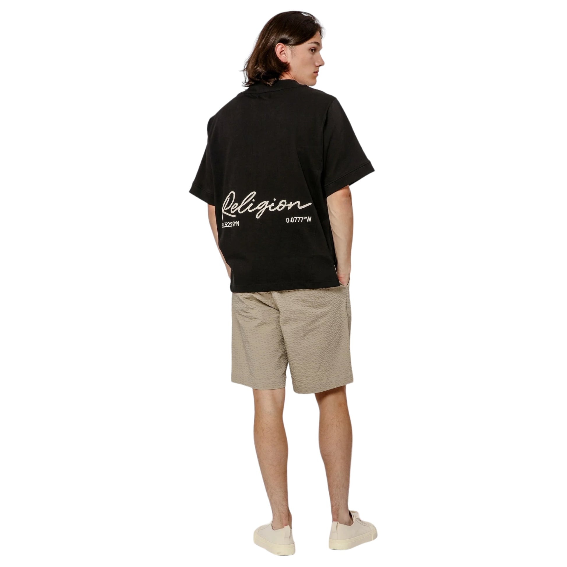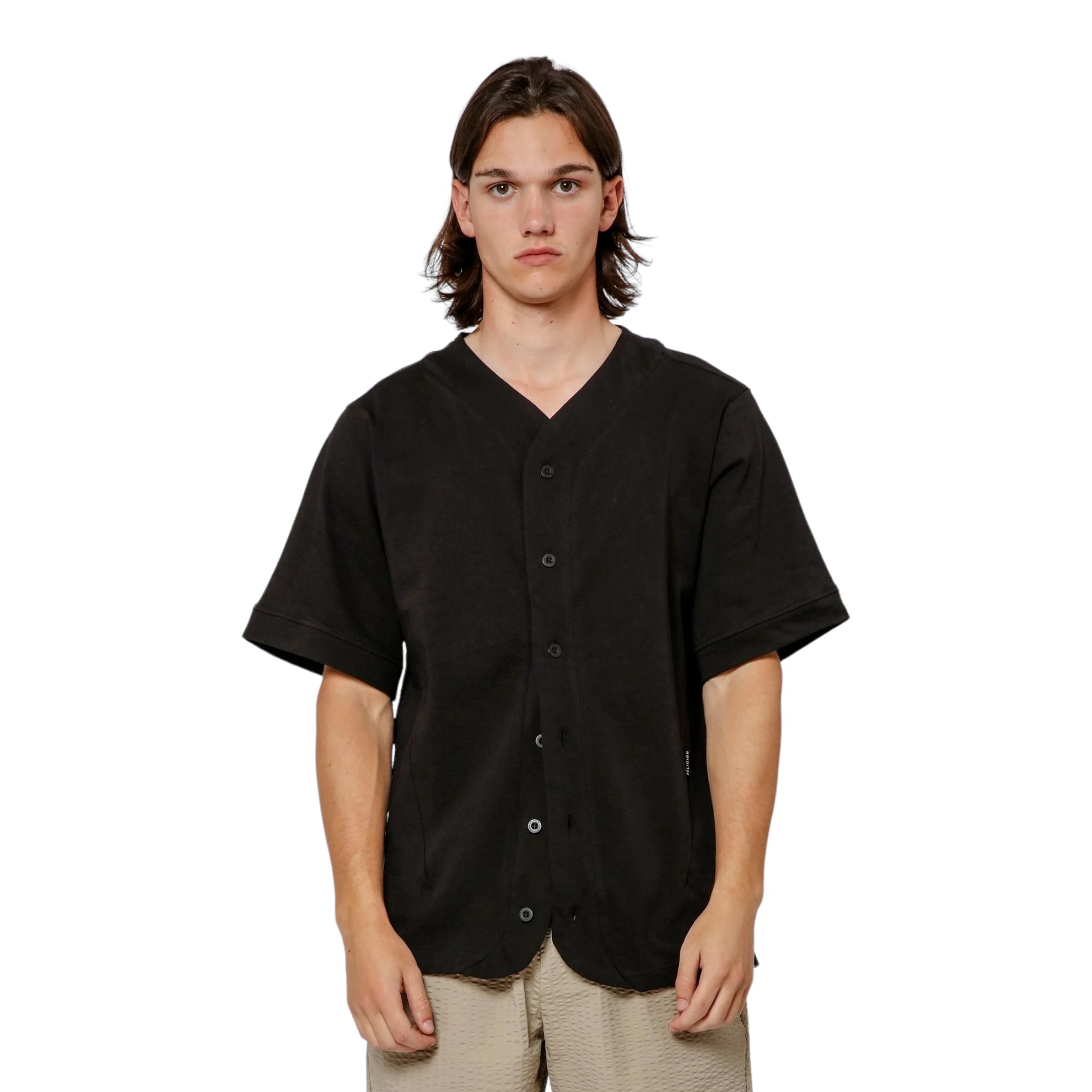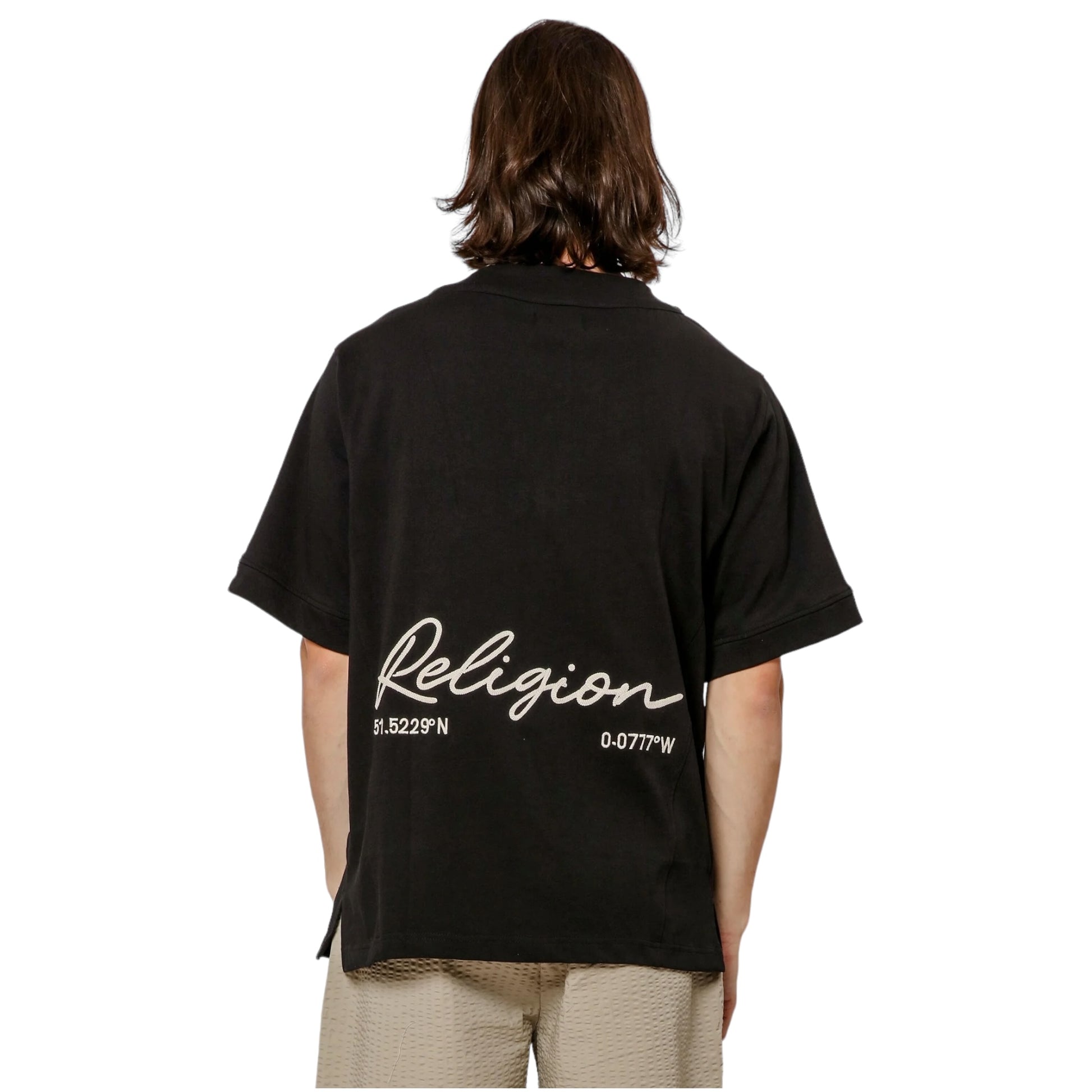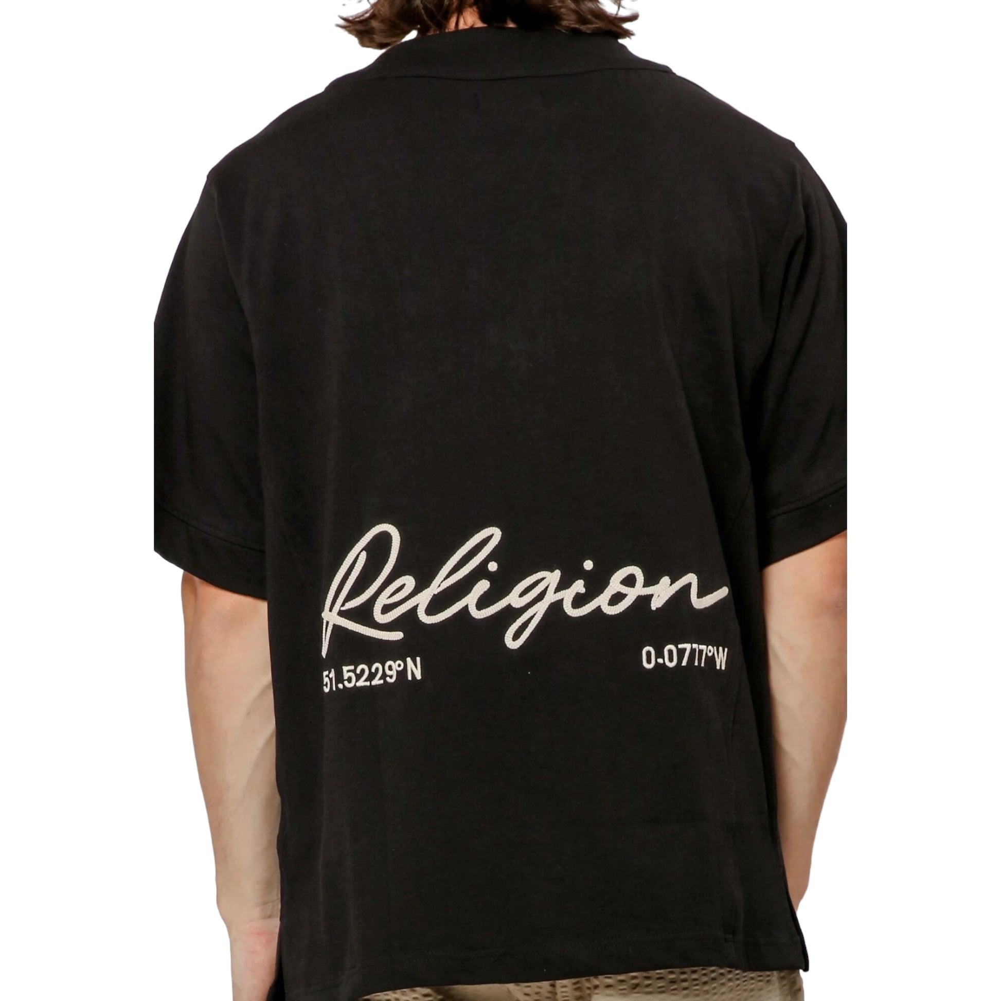 Mejora tu estilo con la camiseta de béisbol bordada en color negro con un ajuste relajado y cuello en V. Presenta un bordado en la parte inferior de la espalda con " RELIGION " y detalle de coordinadas, un frente con botones y una etiqueta distintiva de la marca RELIGION en la pinza delantera. Eleva tu look con esta camisa única y versátil.