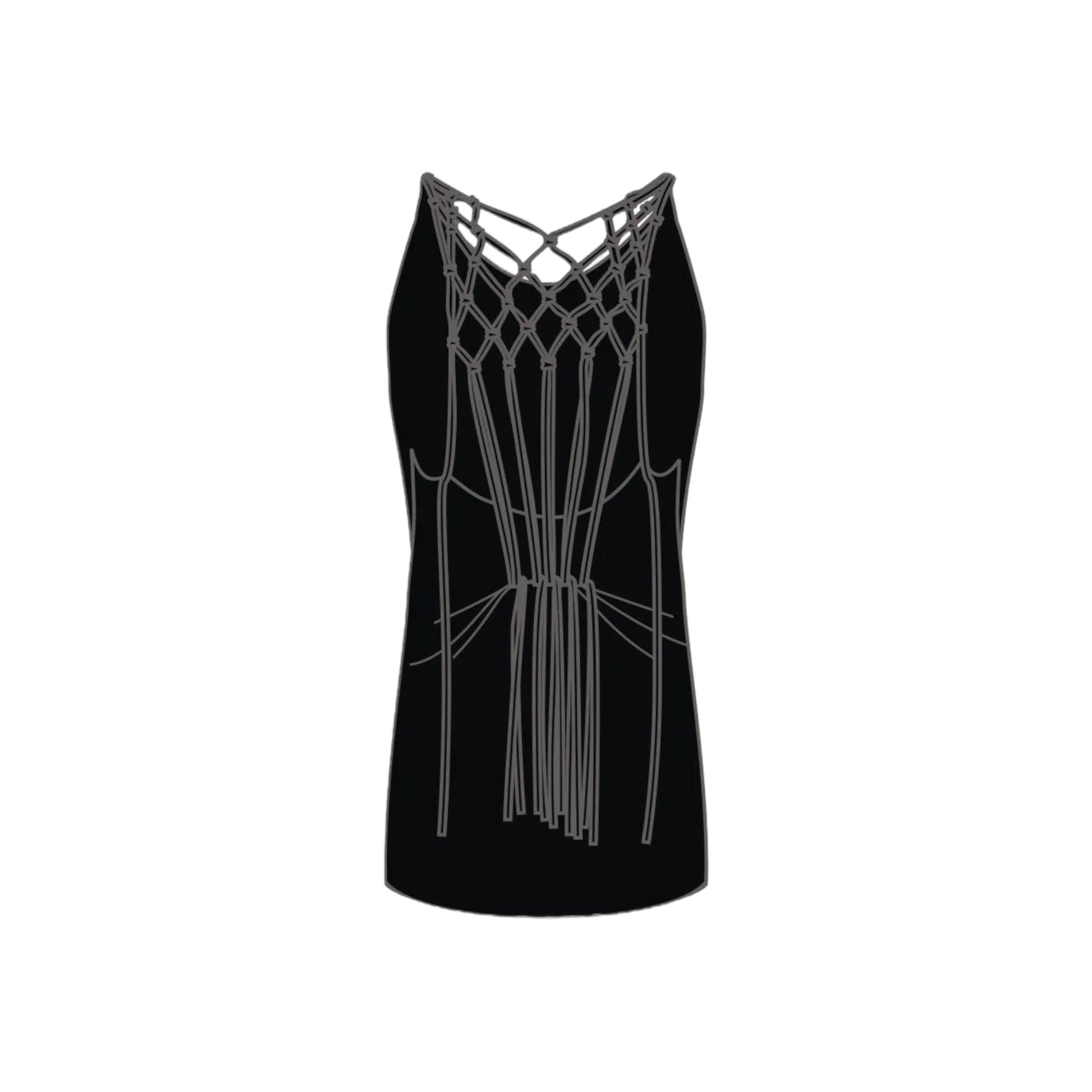 Presentamos nuestro vestido Triangle en negro, un minivestido sin mangas confeccionado con un cómodo tejido de punto de algodón. Presenta un elegante gráfico de niña en la parte delantera y una cautivadora espalda abierta de macramé. Perfecto para aquellos que anhelan un estilo sencillo con un toque vanguardista.