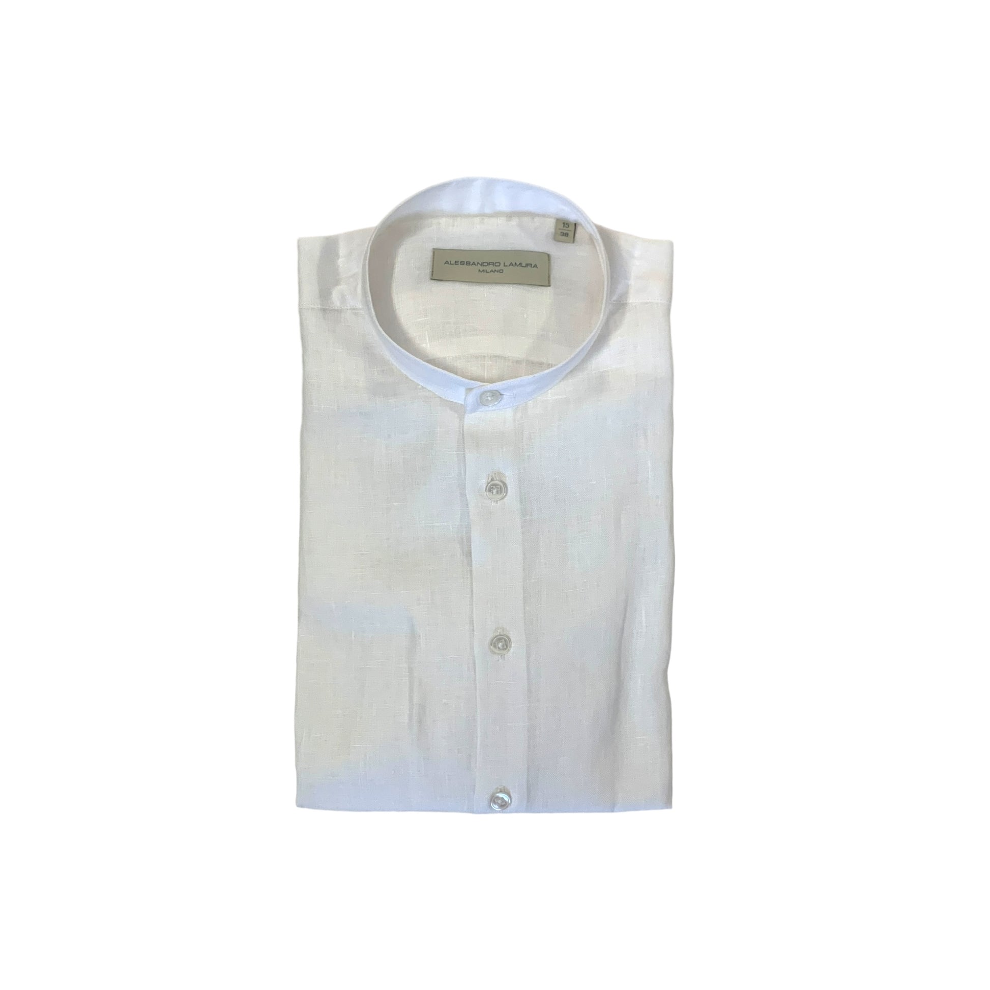 Camicia realizzata in tessuto di lino con maniche lunghe. Colletto coreano. Chiusura frontale con abbottonatura. Vestibilità slim.