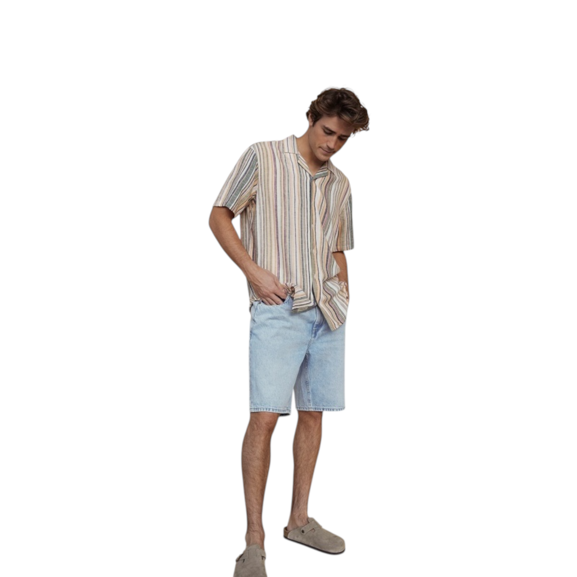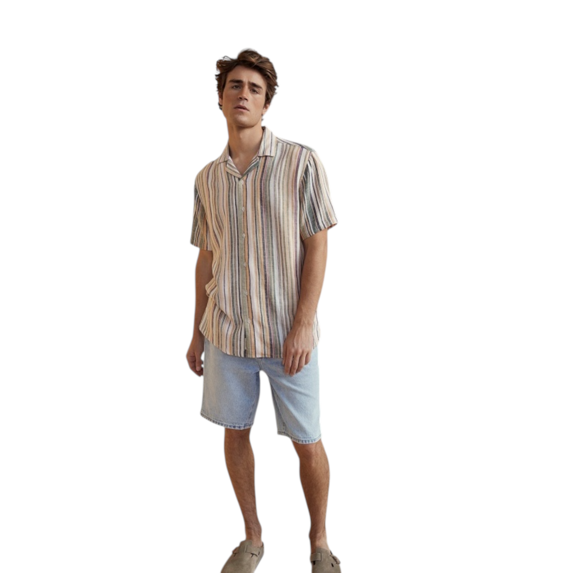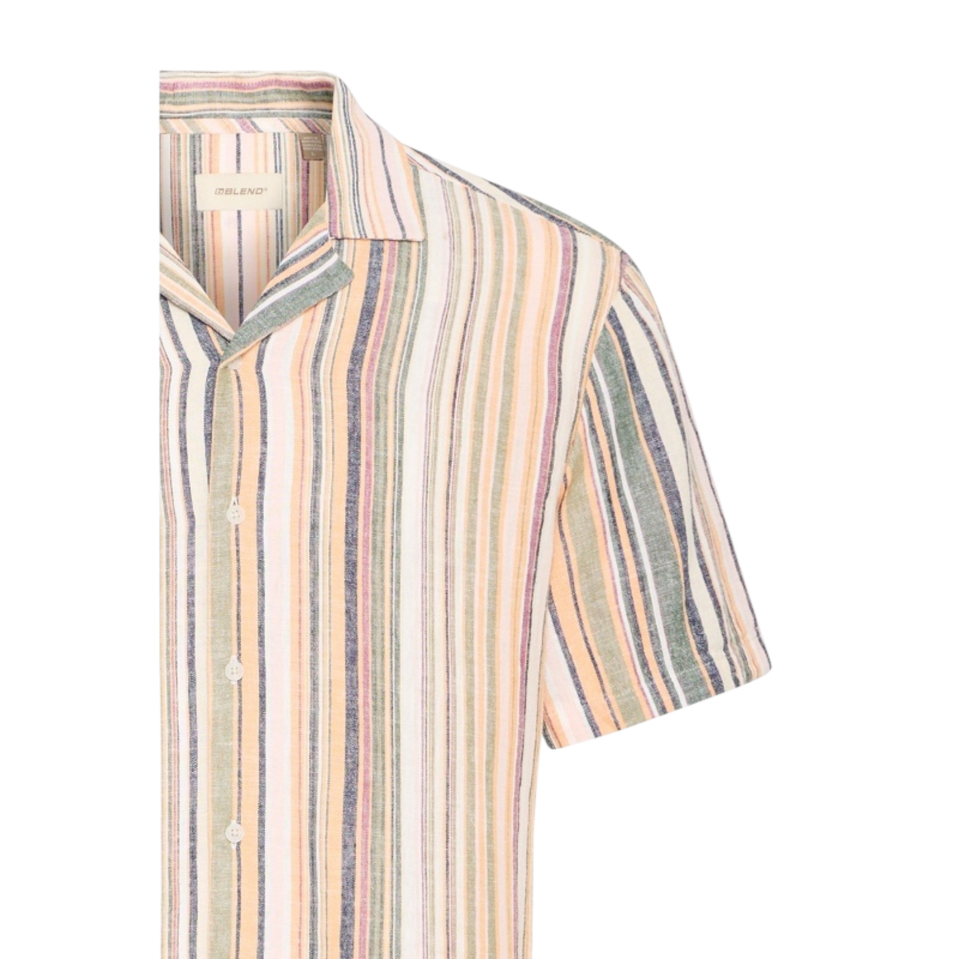 Camicia in lino con mezza manica e collo bowling. Vestibilità slim relax con abbottonatura frontale e bottoni. Perfetta per un look estivo elegante e confortevole.