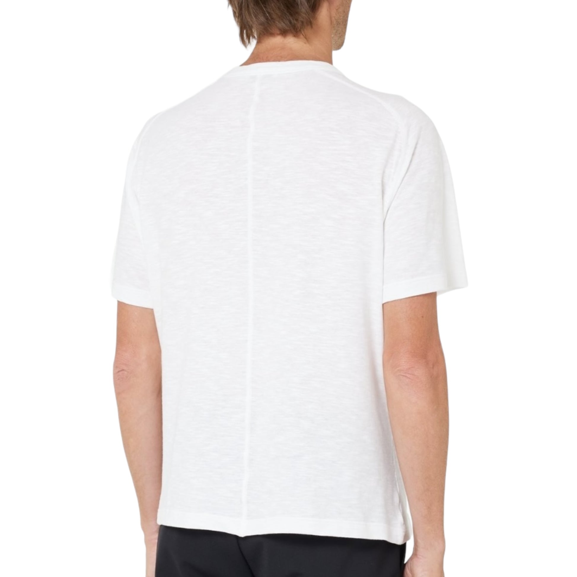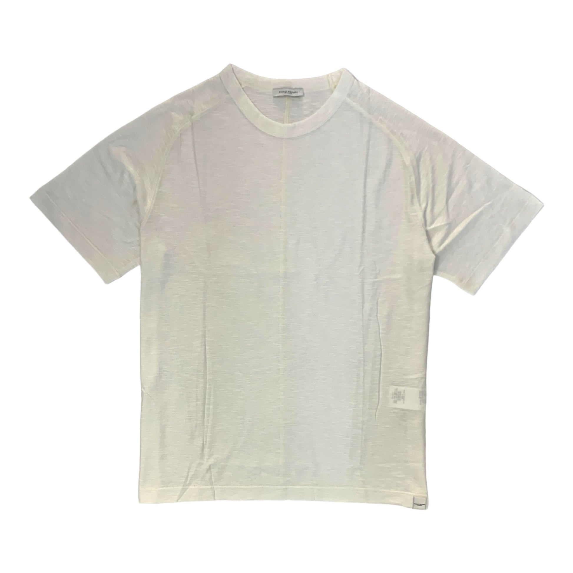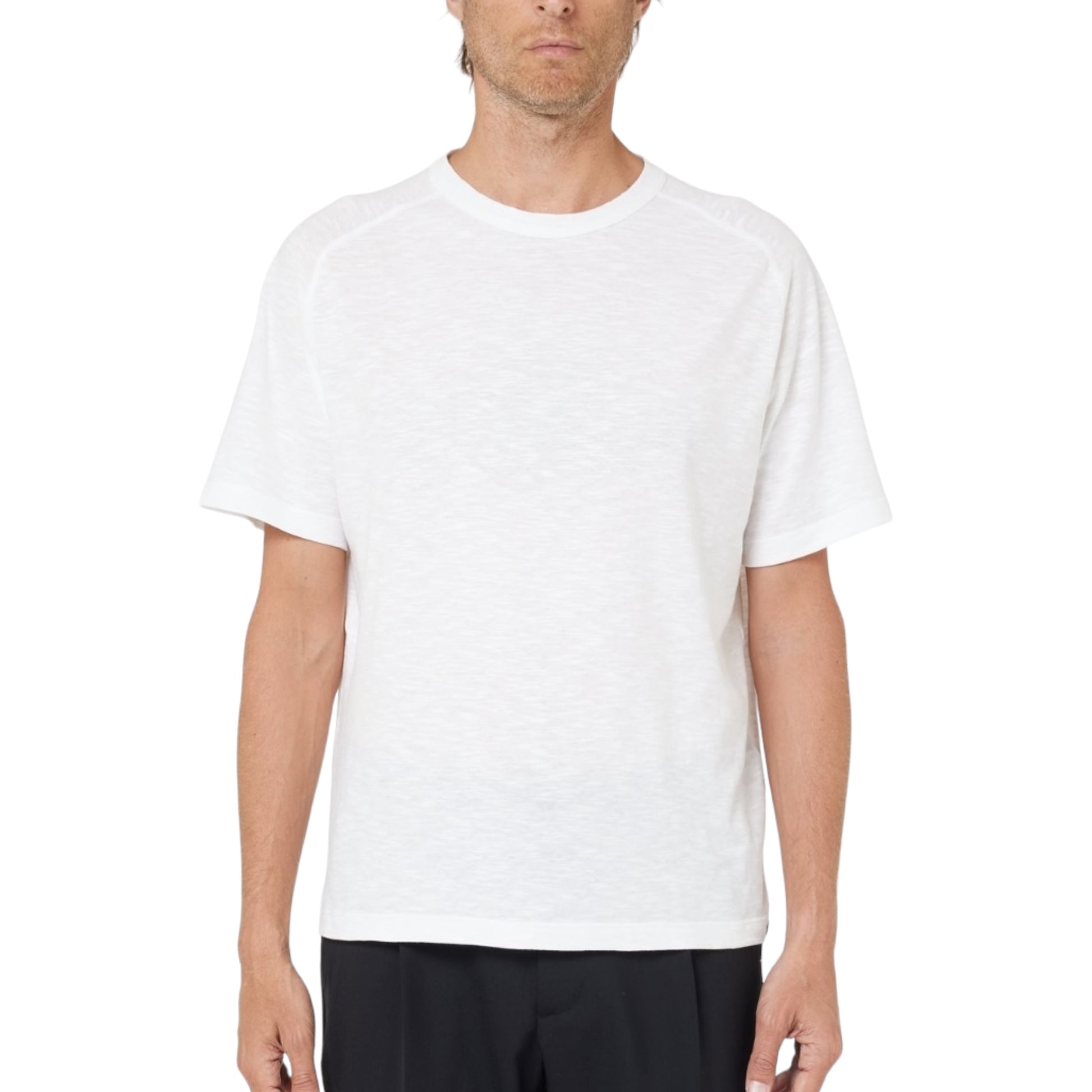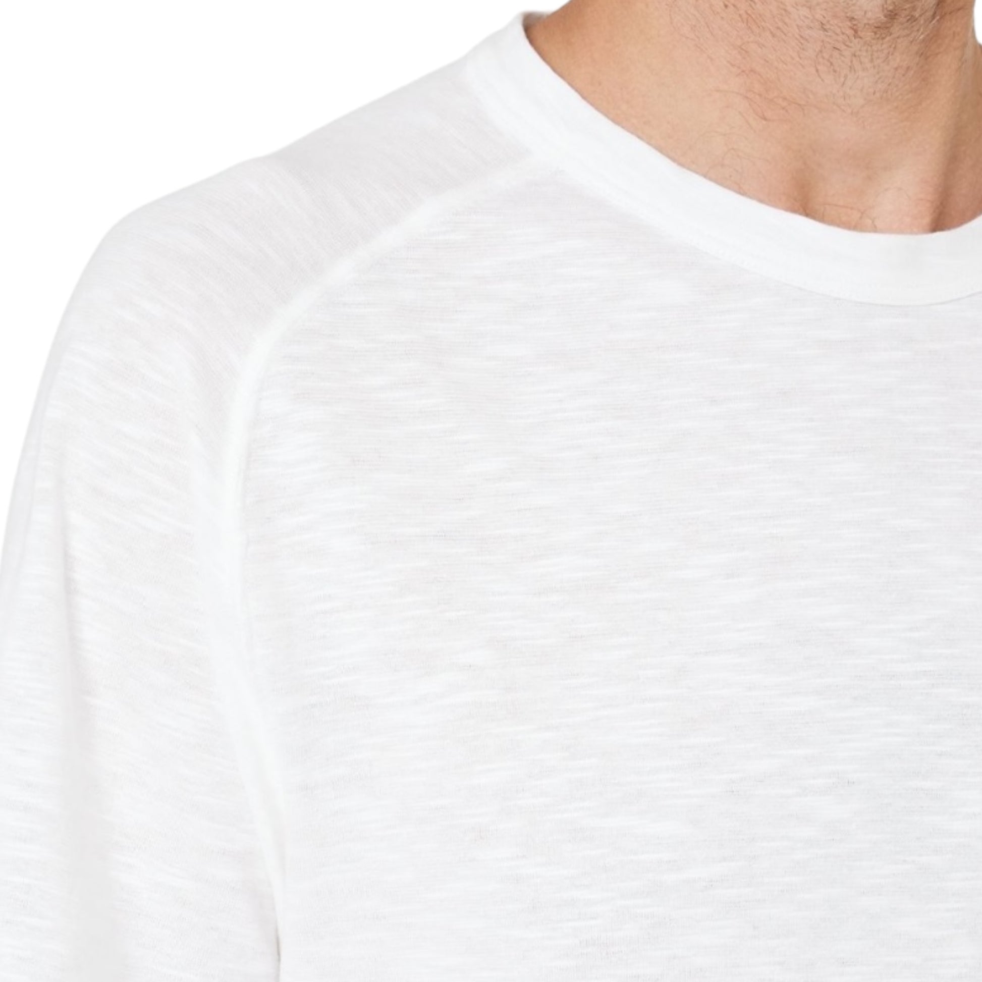 T-shirt manica raglan in jersey fiammato realizzata in cotone e lino con taglio verticale sul centro dietro. Etichetta con logo a bandierina cucita su fondo davanti.