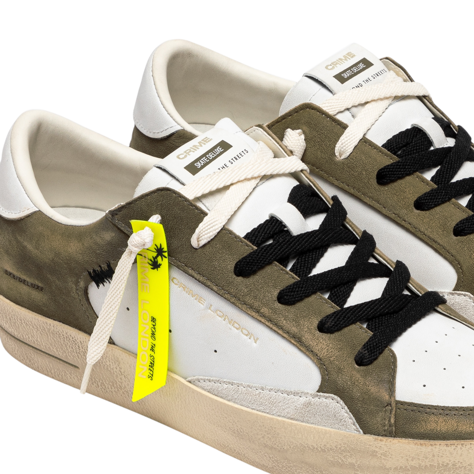 - Tomaia in nabuck verde militare, dettagli in suede bianco