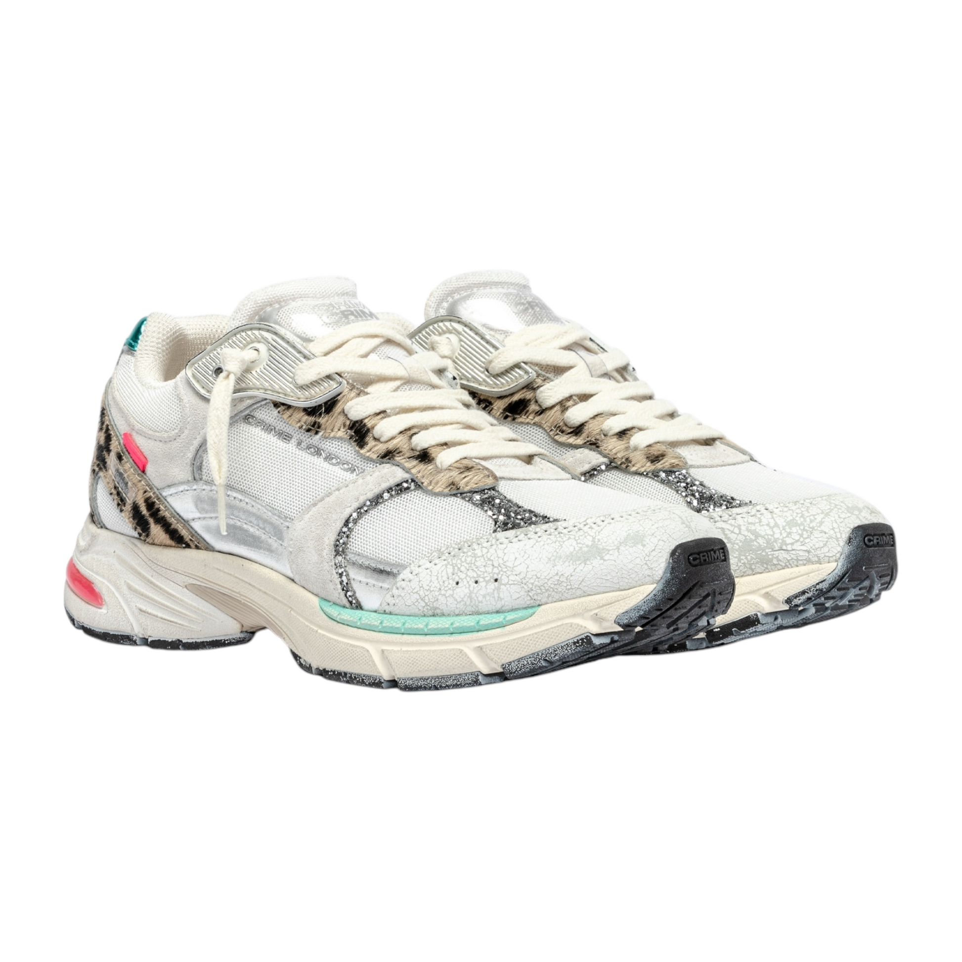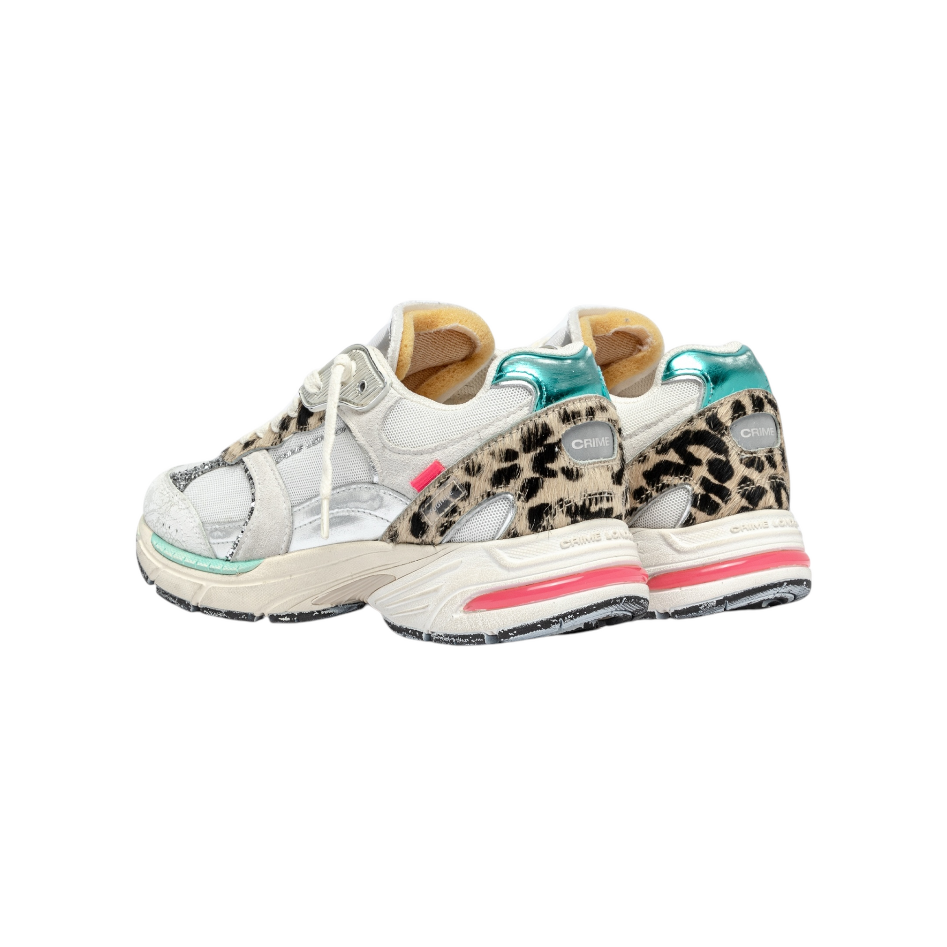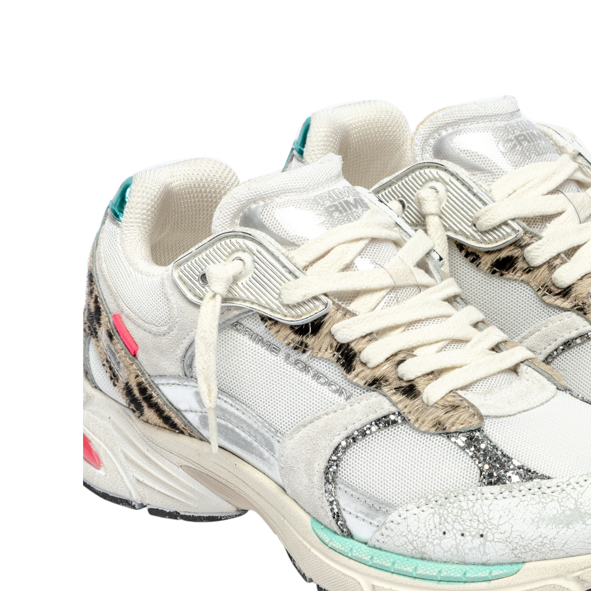 - Tomaia in tessuto, suede e cracklé bianca con cavallino leopardato, dettagli in lamina argento