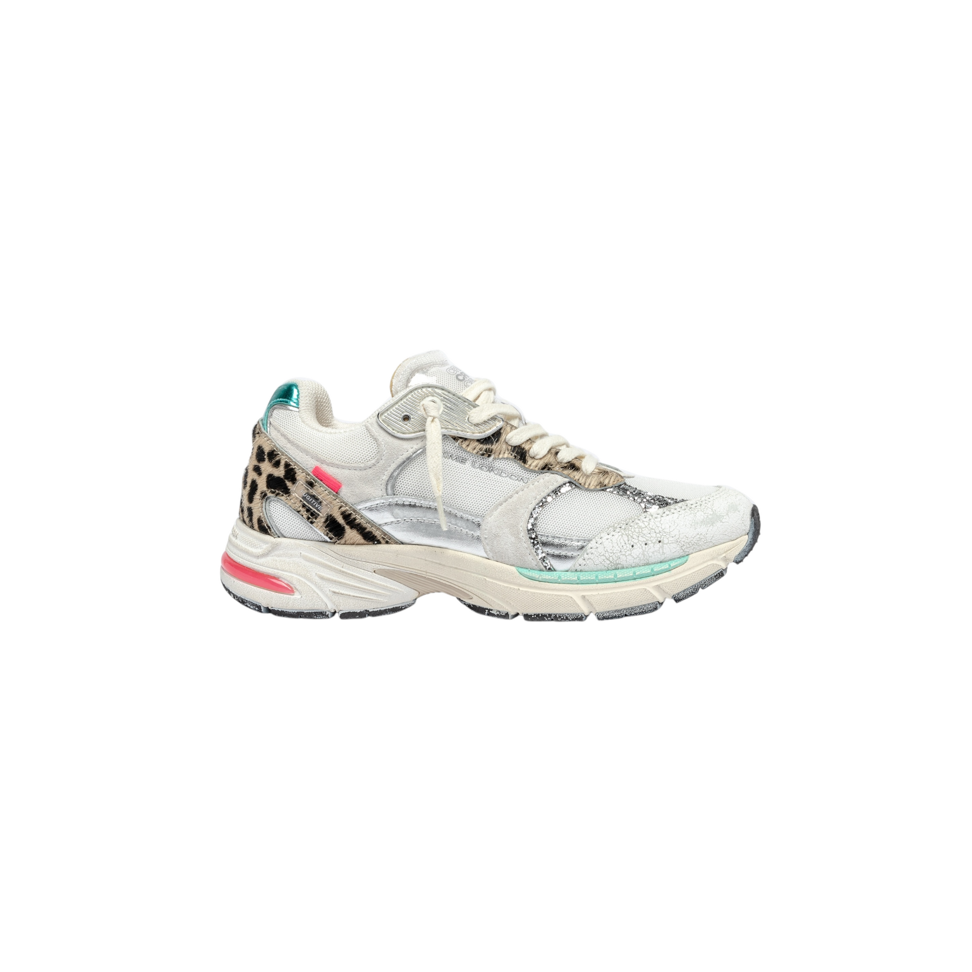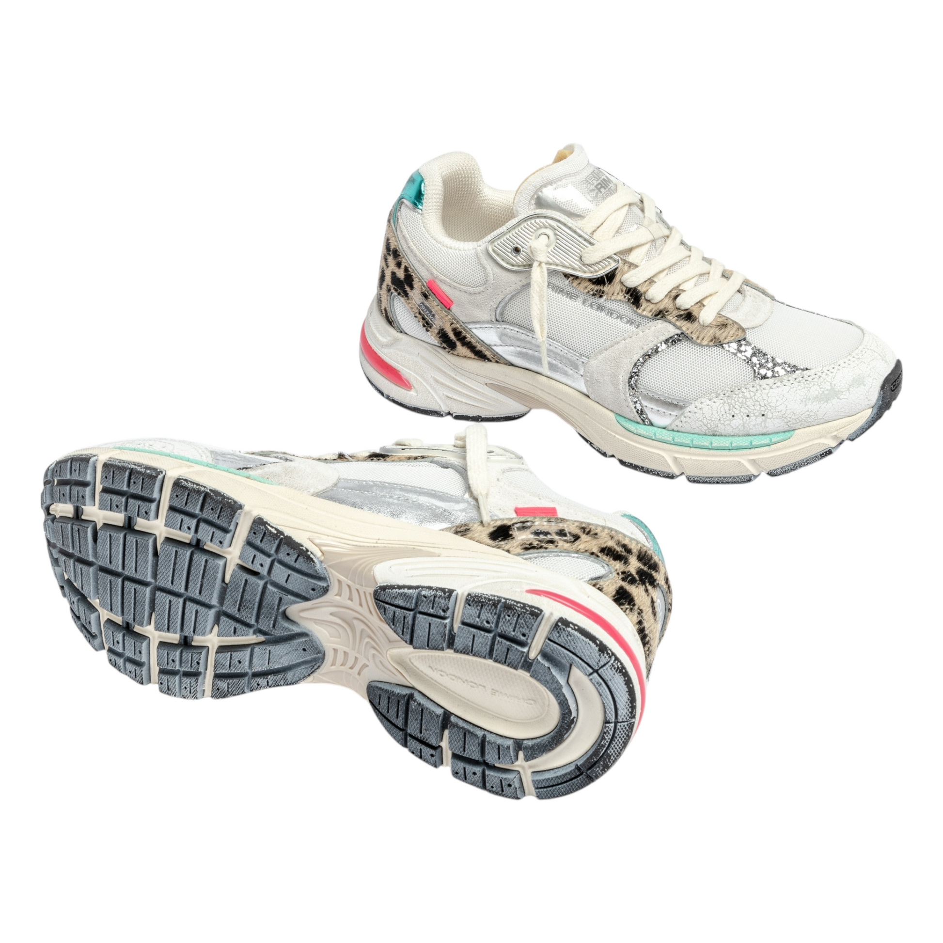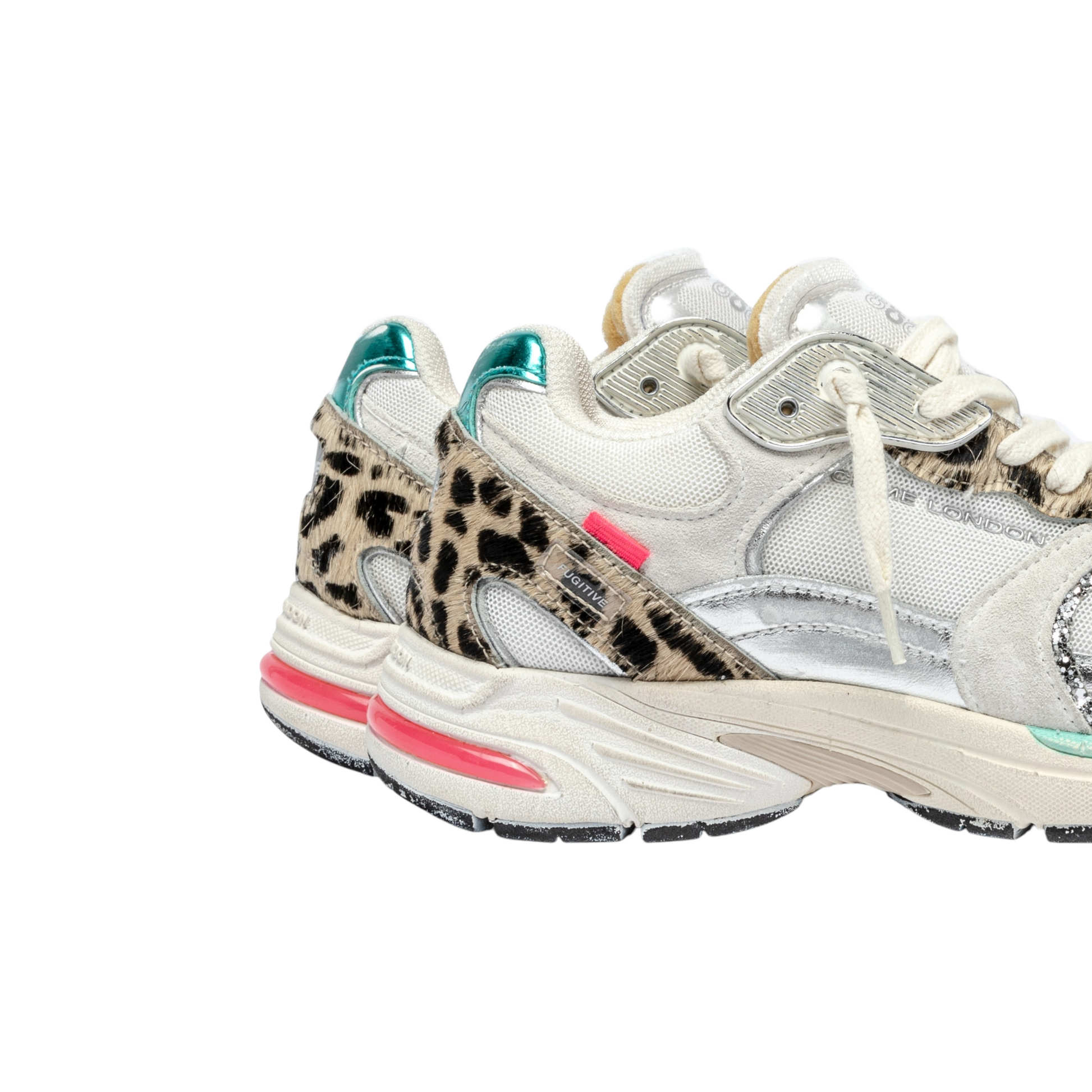 - Tomaia in tessuto, suede e cracklé bianca con cavallino leopardato, dettagli in lamina argento