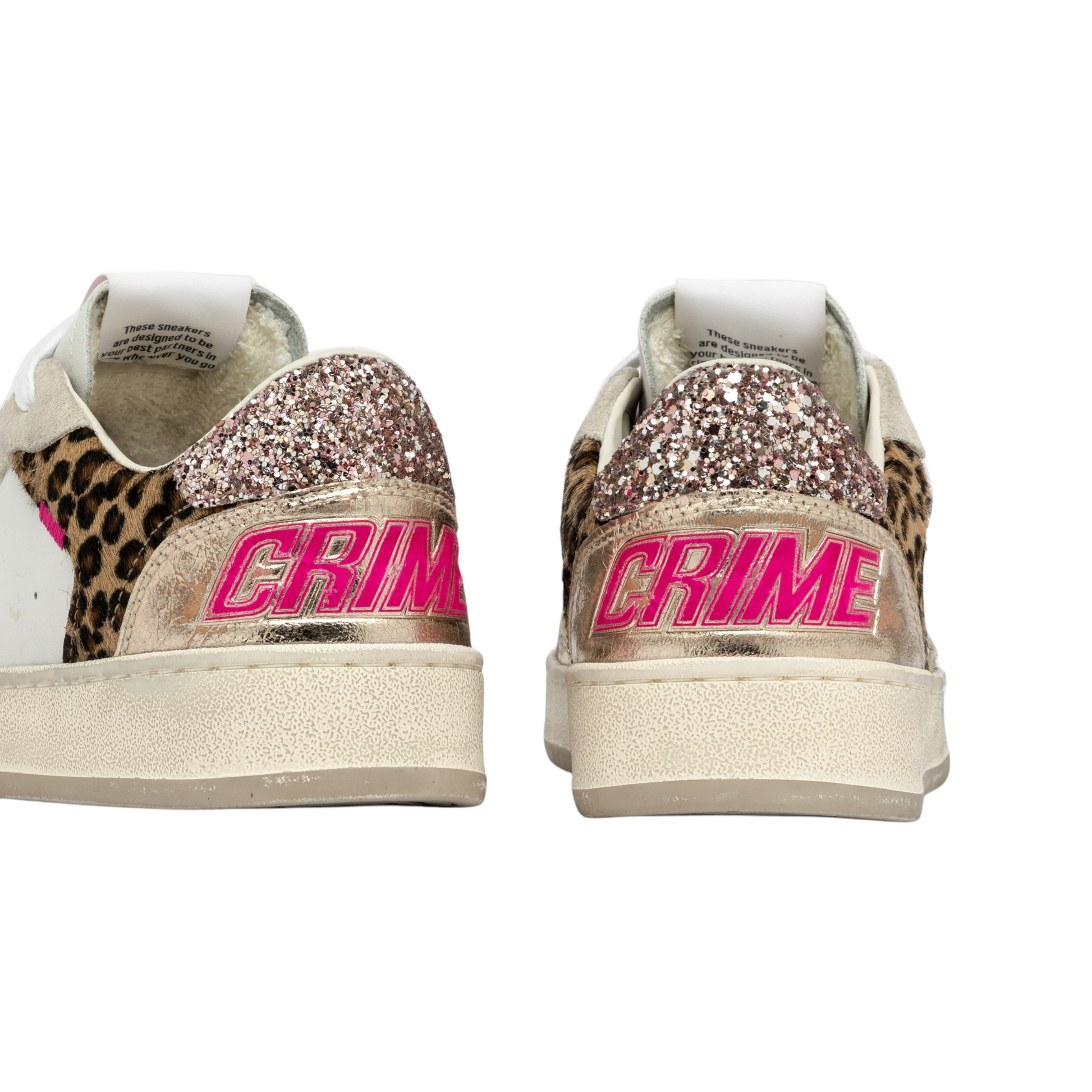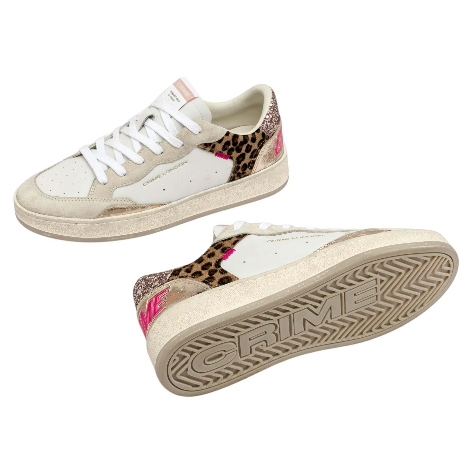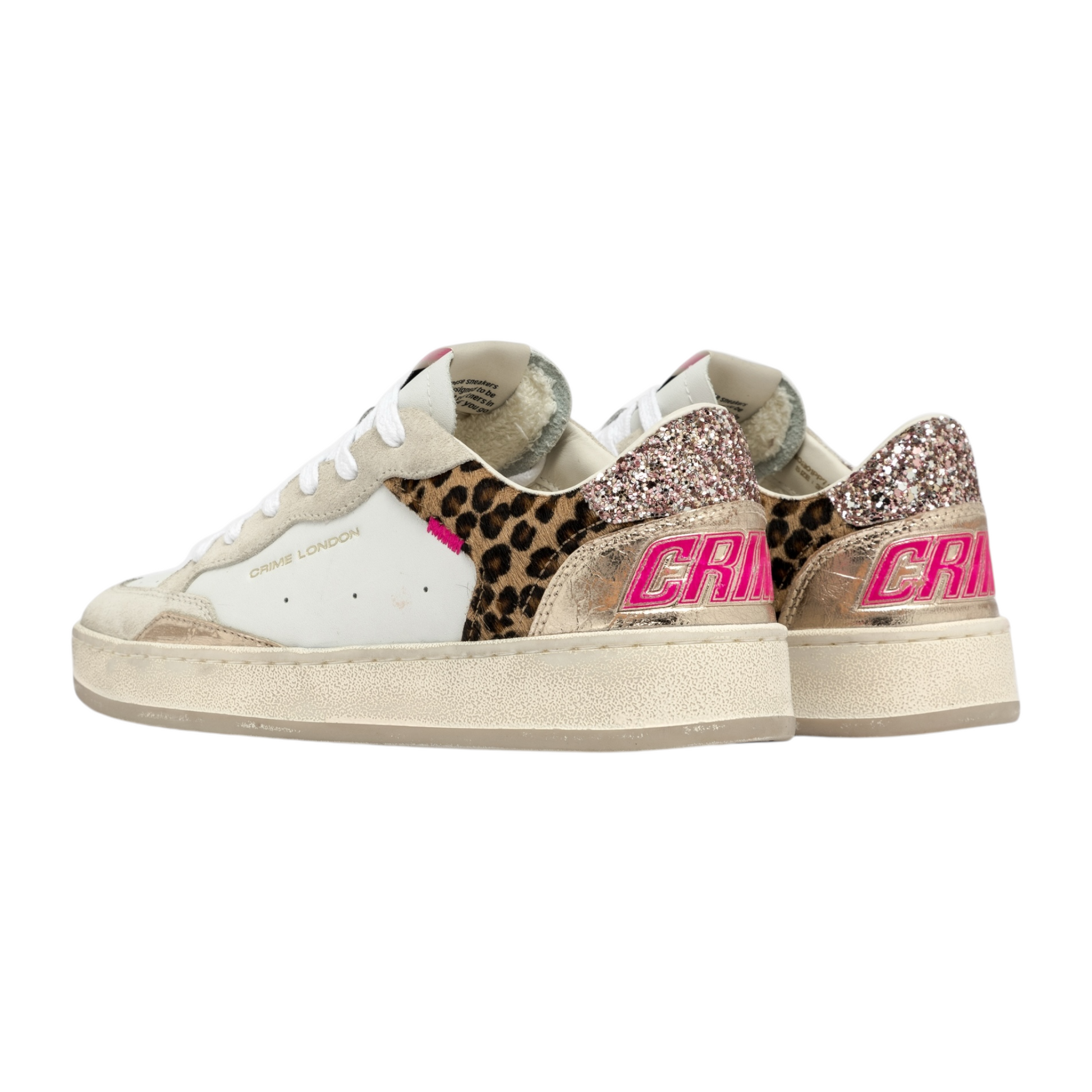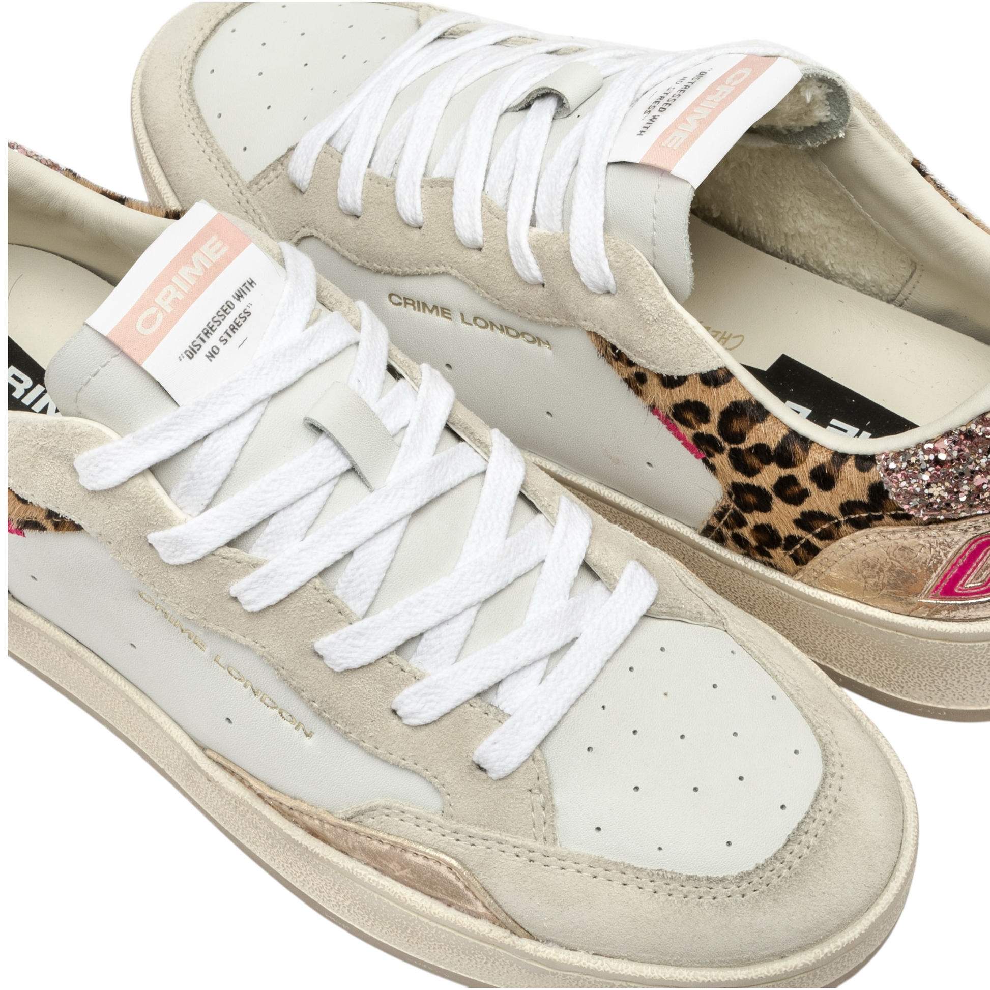 - Tomaia in pelle bianca con suede crema e cavallino leopardato, dettagli in lamina cracklé platino
