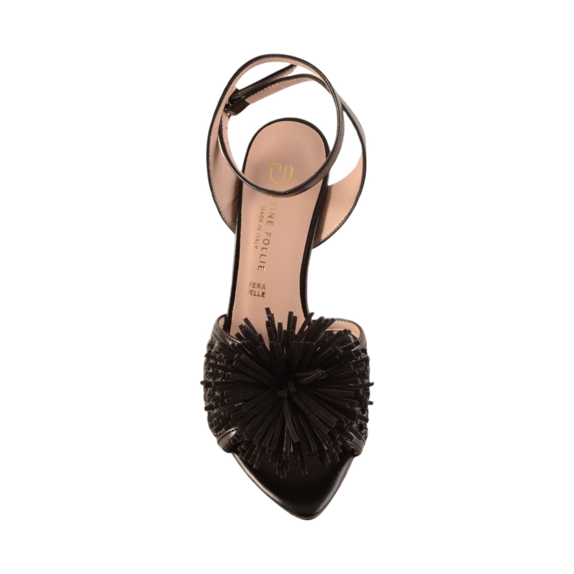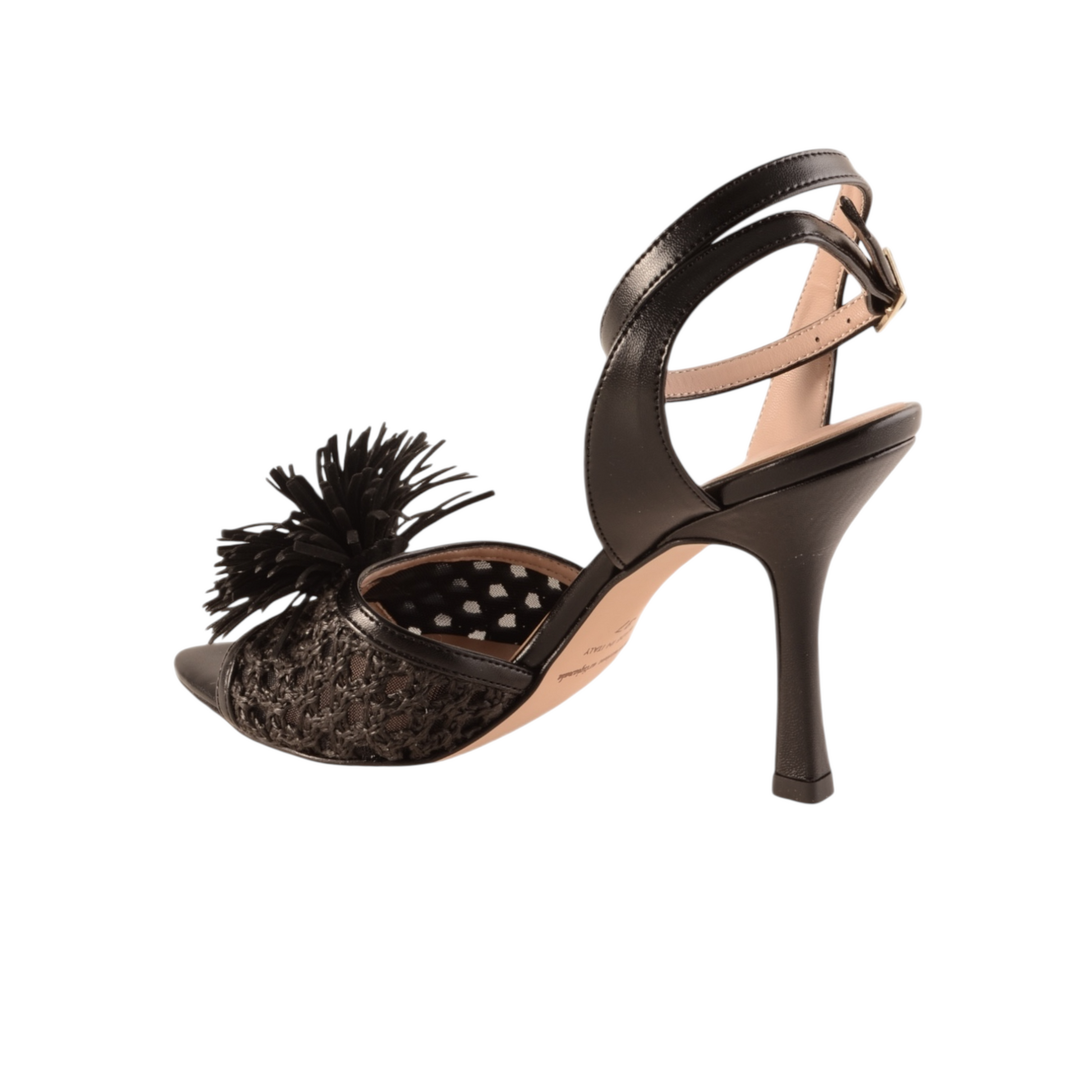 Sandalo sofisticato caratterizzato da un tacco alto che conferisce eleganza alla silhouette. Presenta un cinturino alla caviglia per una calzata sicura e una distintiva fascetta frontale in pelle e rafia intrecciata, impreziosita da un raffinato pon pon applicato. La combinazione di materiali pregiati e dettagli artigianali rende questo modello Divine Follie un accessorio versatile per completare look ricercati.
