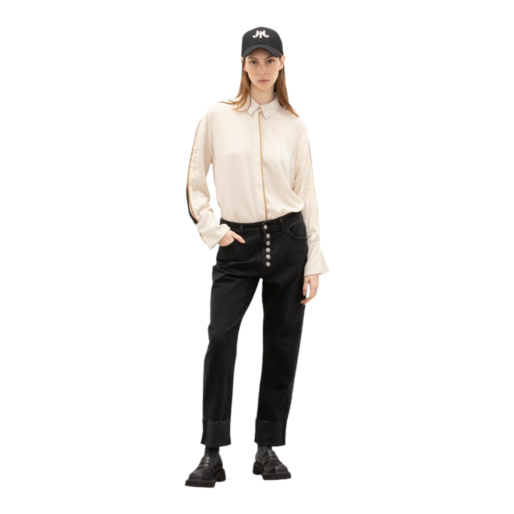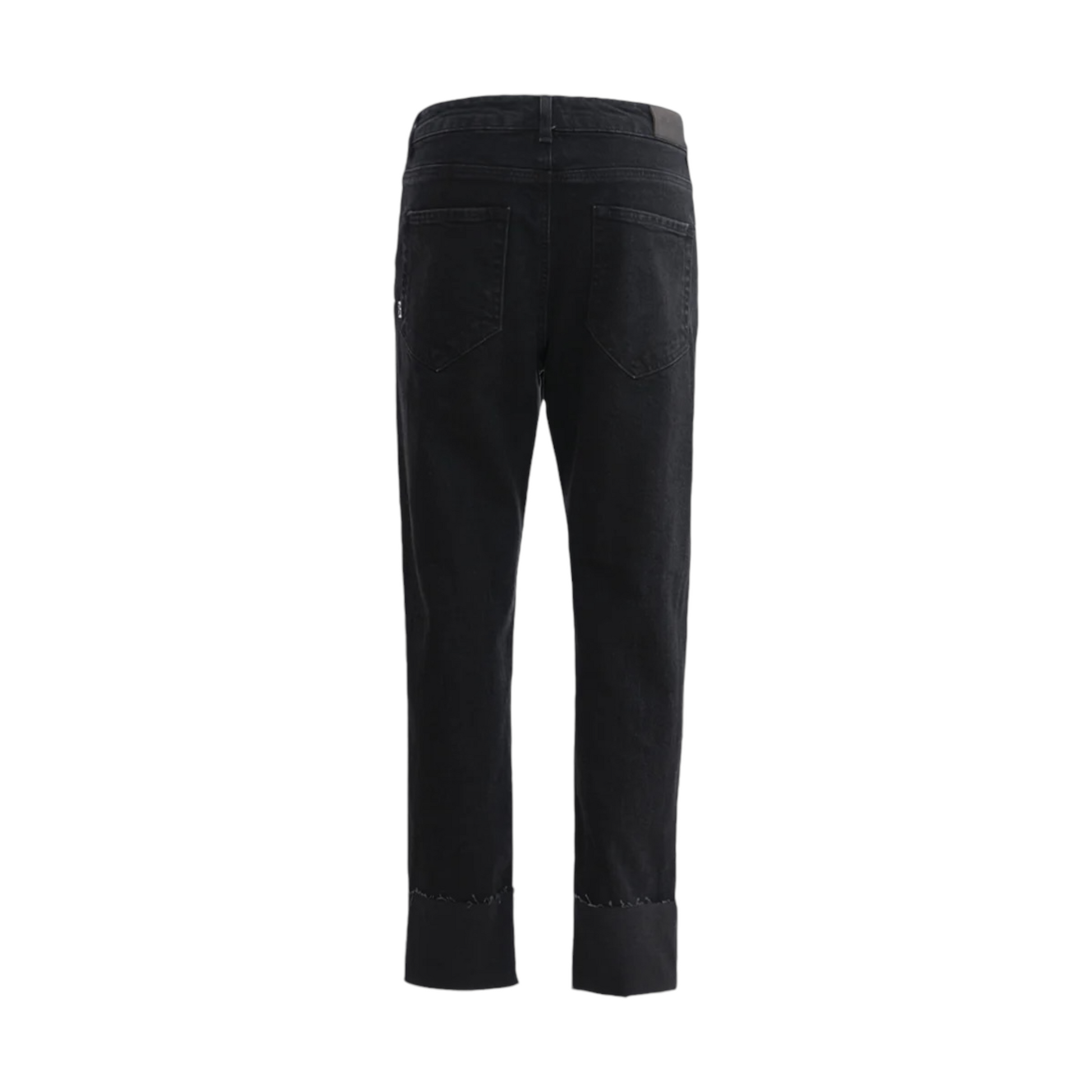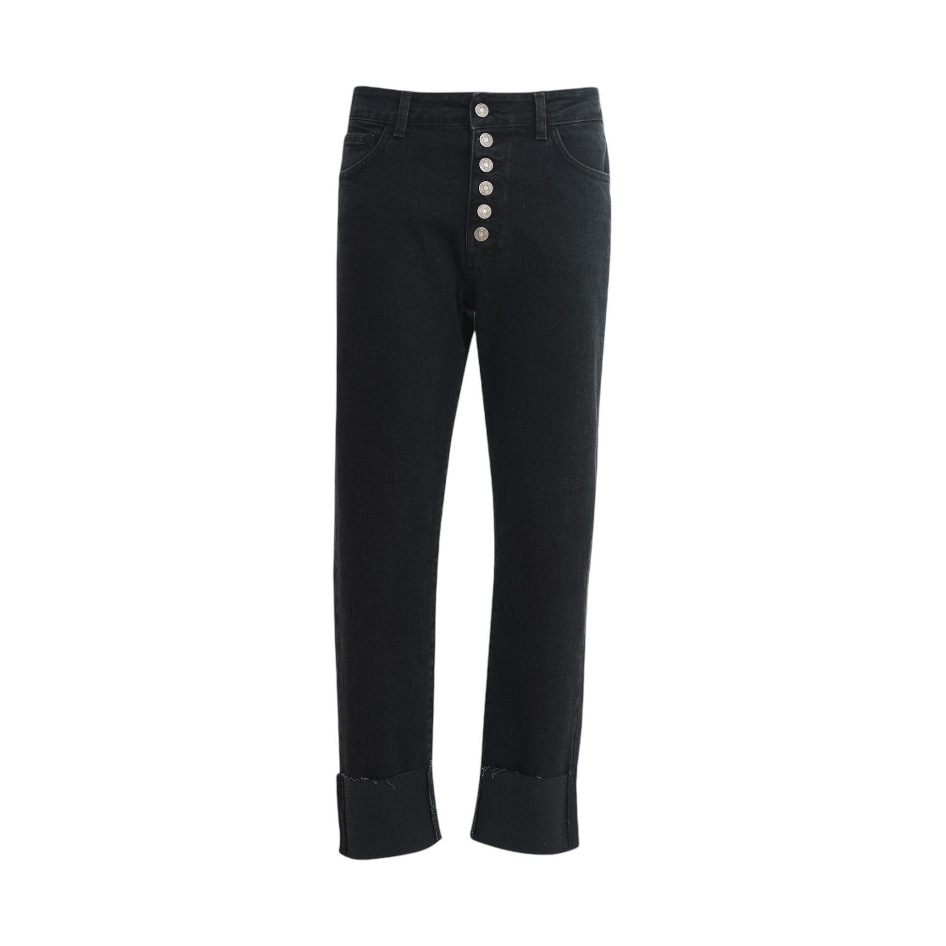Pantalone 5 tasche baggy in denim tinta unita. Vita con passanti con abbottonatura centrale alla marinara. Risvolto sul fondo. Vestibilità slim relax.