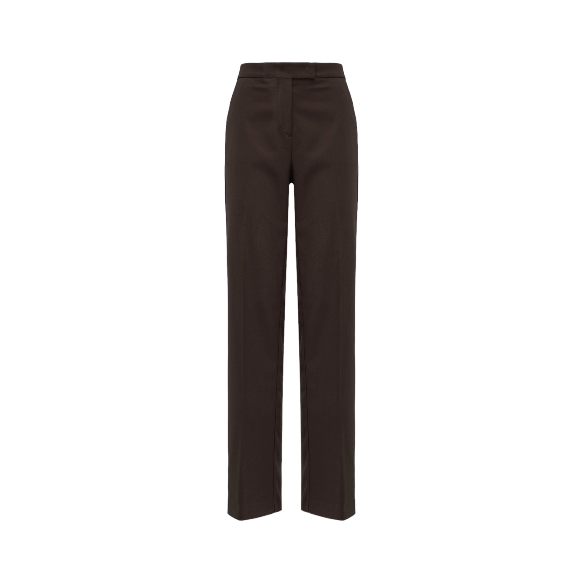Pantalone vita alta con tasche a filo, abbottonatura nascosta, gamba dritta.