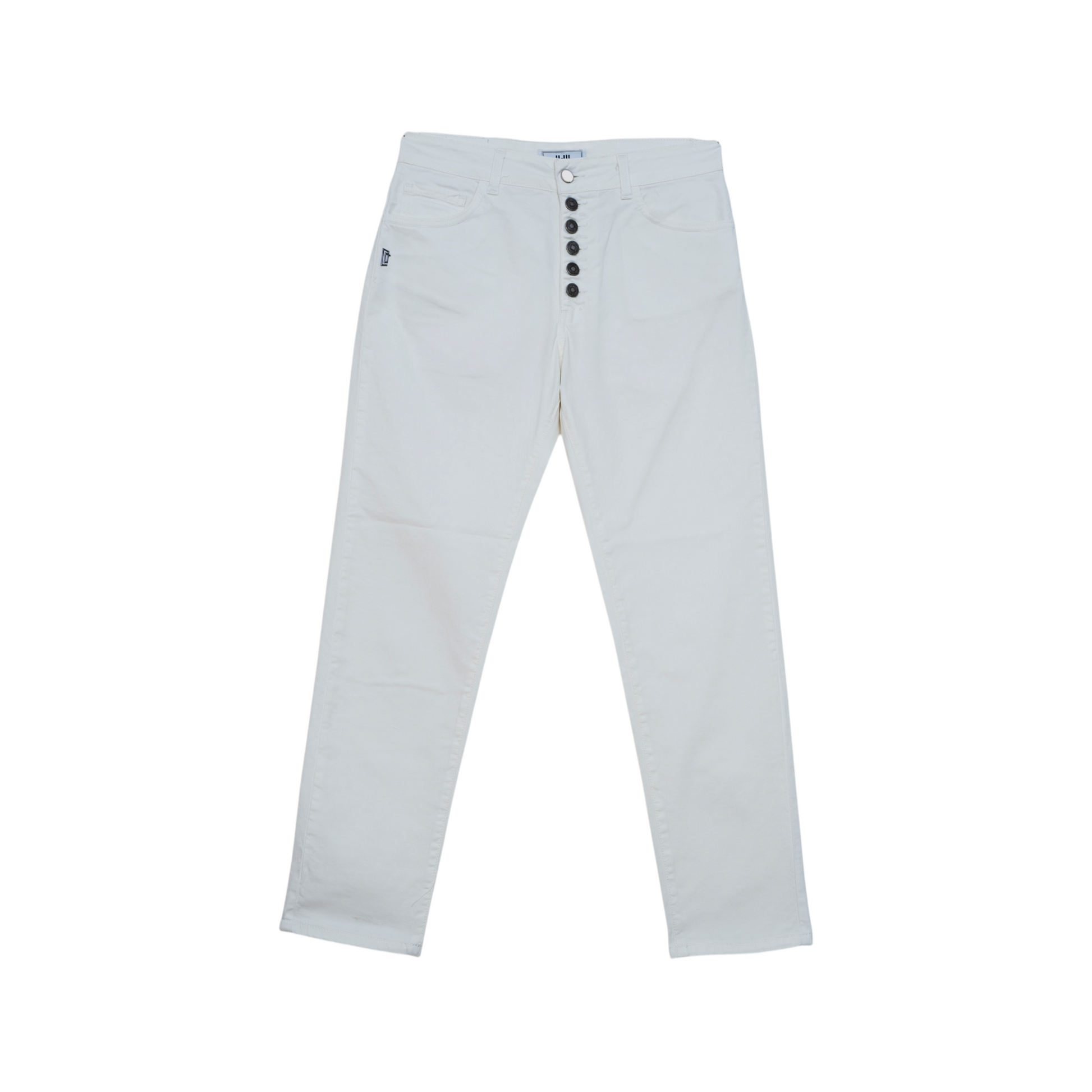 Il pantalone Jijil presenta una vestibilità mom fit e una chiusura con bottoni a vista. Realizzato in denim, è comodo e alla moda. Affronta la giornata con stile e comfort grazie a questo capo versatile. Dettaglio con pendente in metallo con logo Jijil applicato sul primo passante a sinistra colore metallo silver used.
