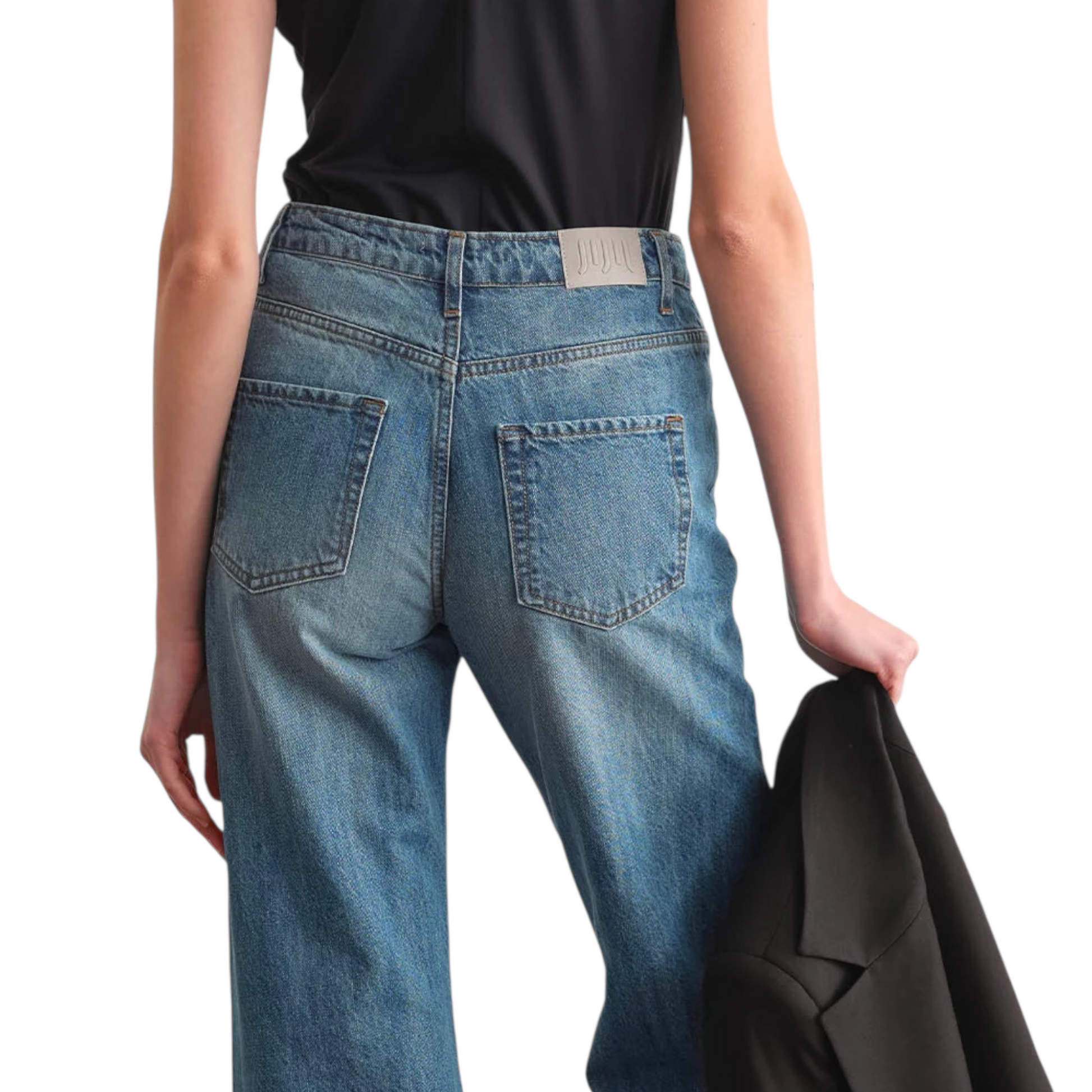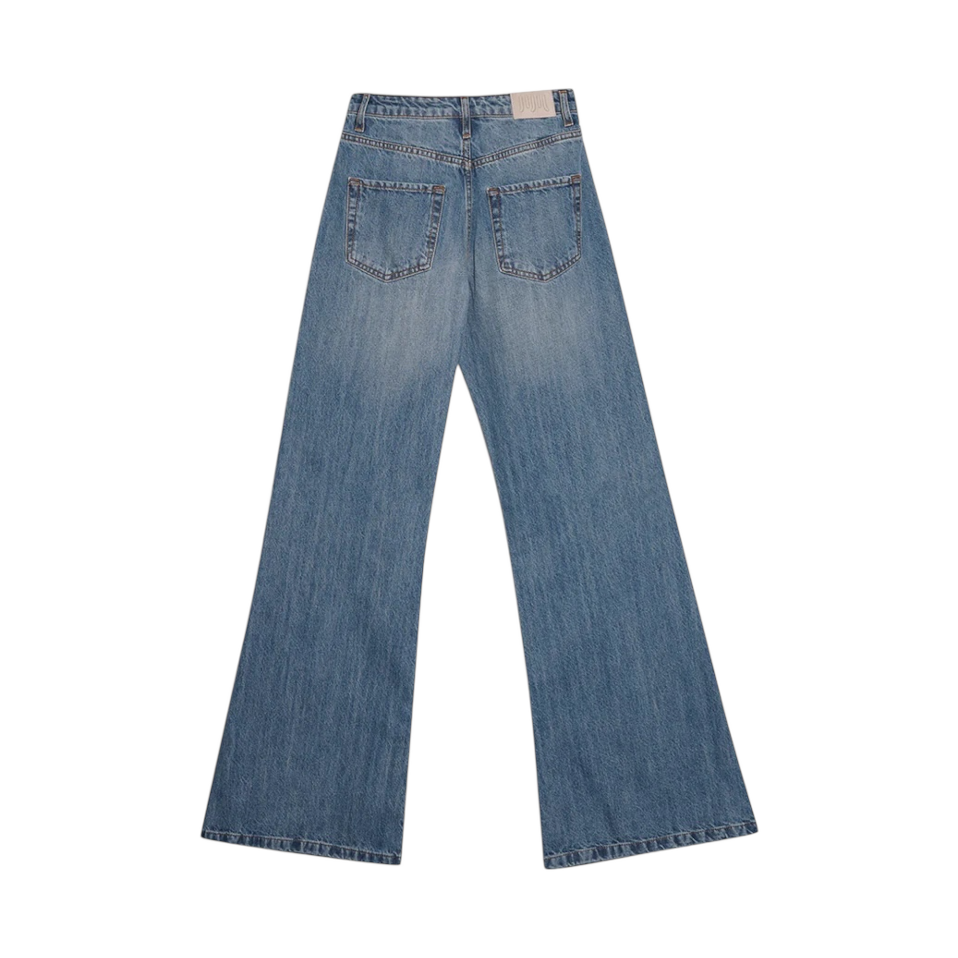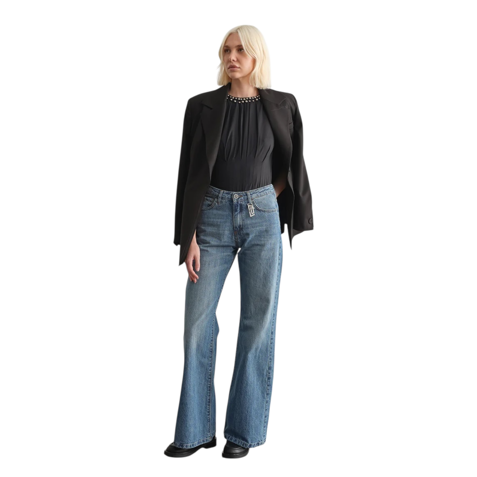 I pantaloni in denim a gamba larga presentano una linea svasata che valorizza la silhouette, offrendo comfort e movimento. La vita alta con chiusura a bottone e zip garantisce una vestibilità precisa e moderna. Il design include cinque tasche funzionali, con l’etichetta logo sul retro che aggiunge un dettaglio di riconoscibilità e stile. Perfetti per chi cerca un capo versatile dal carattere vintage, capace di coniugare tendenza e praticità.
