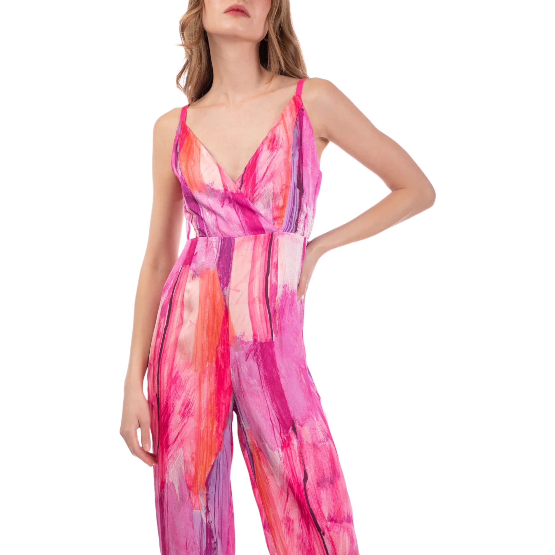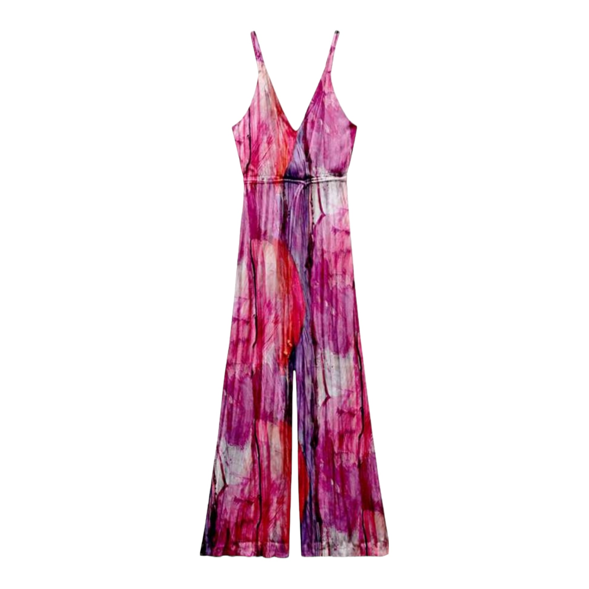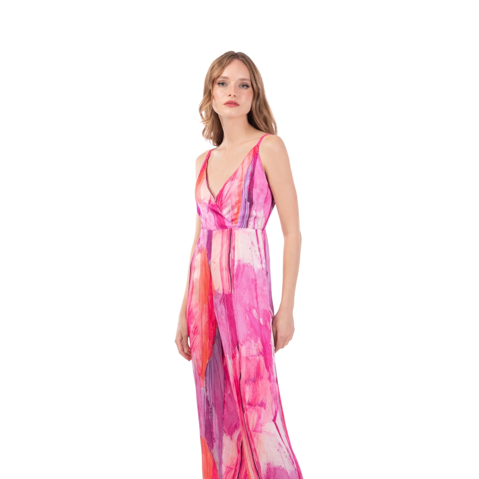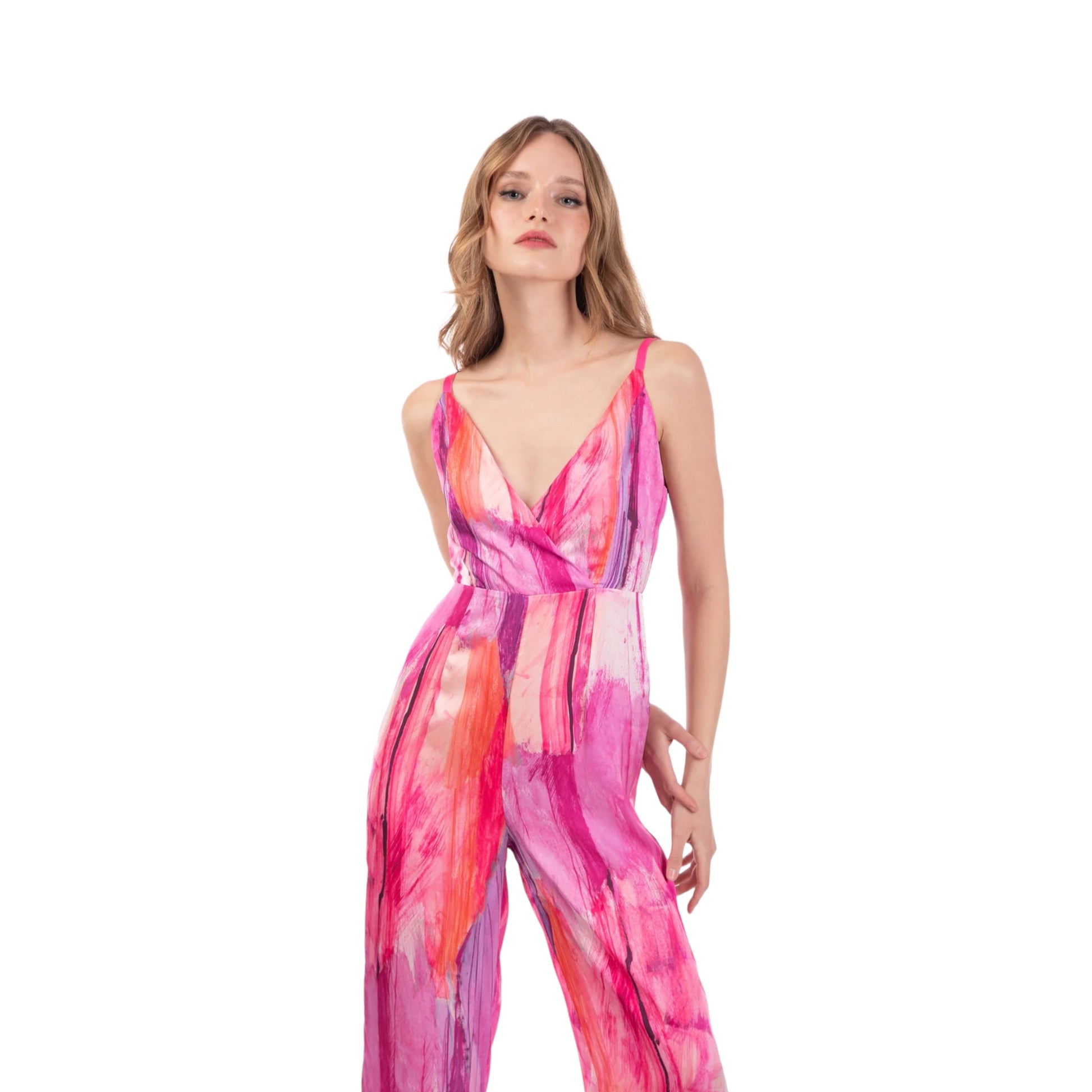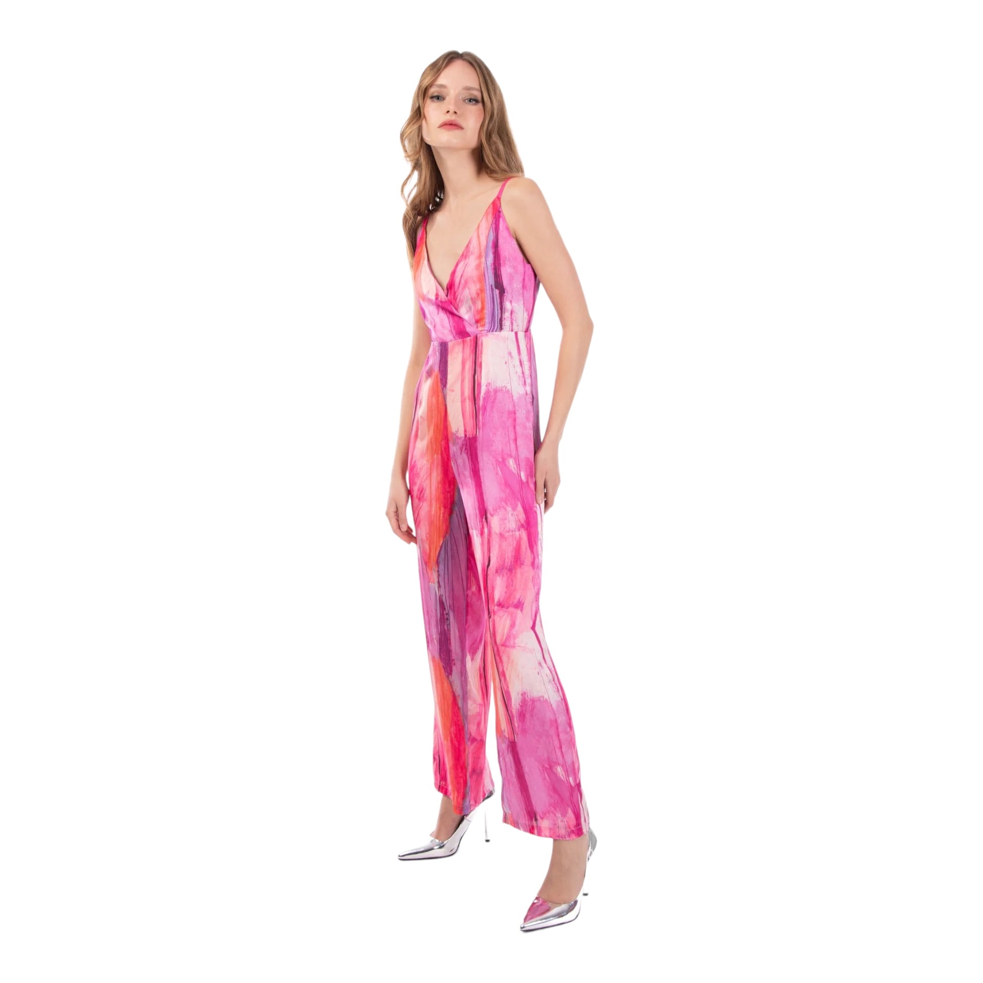 Tuta lunga con scollo ad incrocio, bretelle regolabili, gamba larga. Chiusura con zip laterale nascosta. Vestibilità ampia