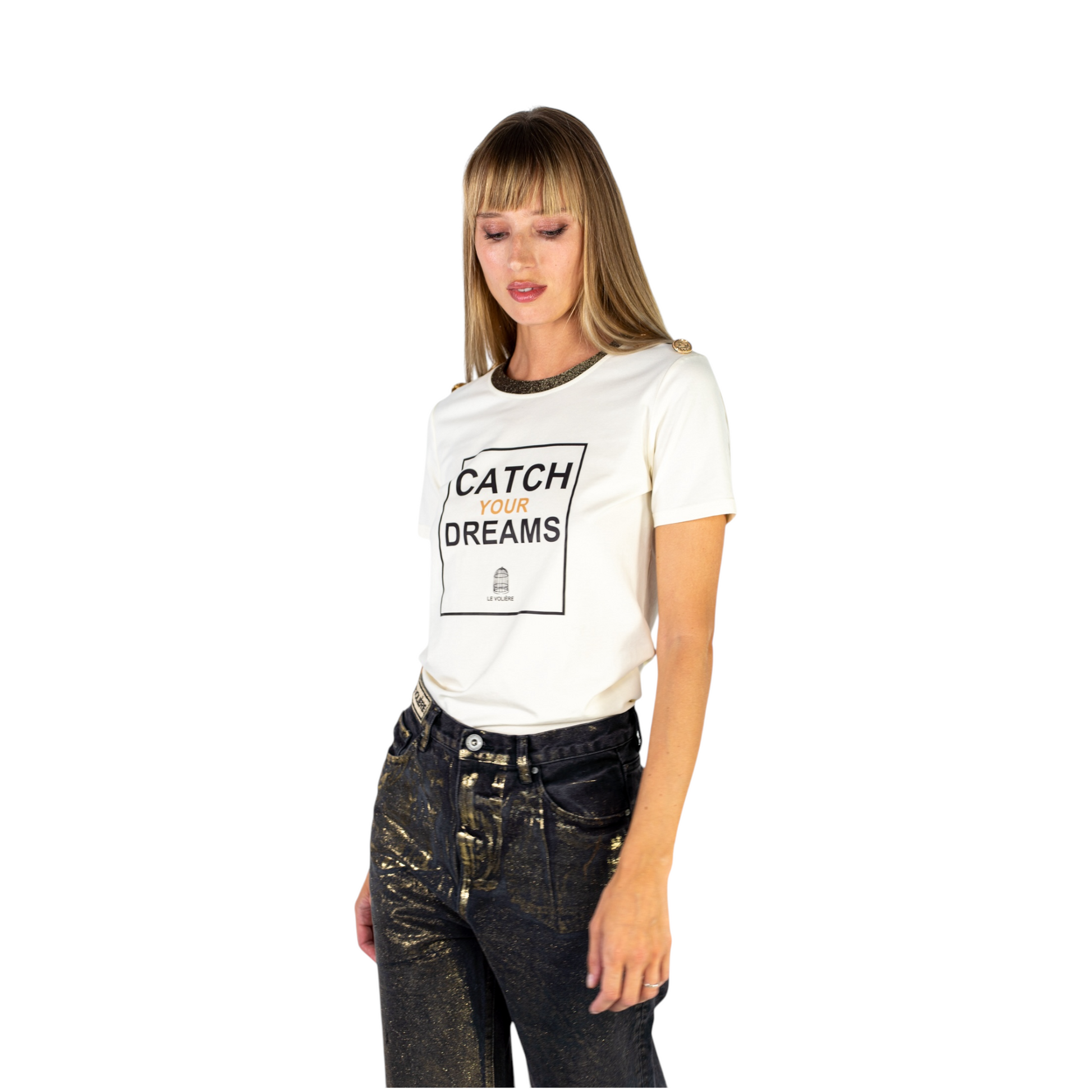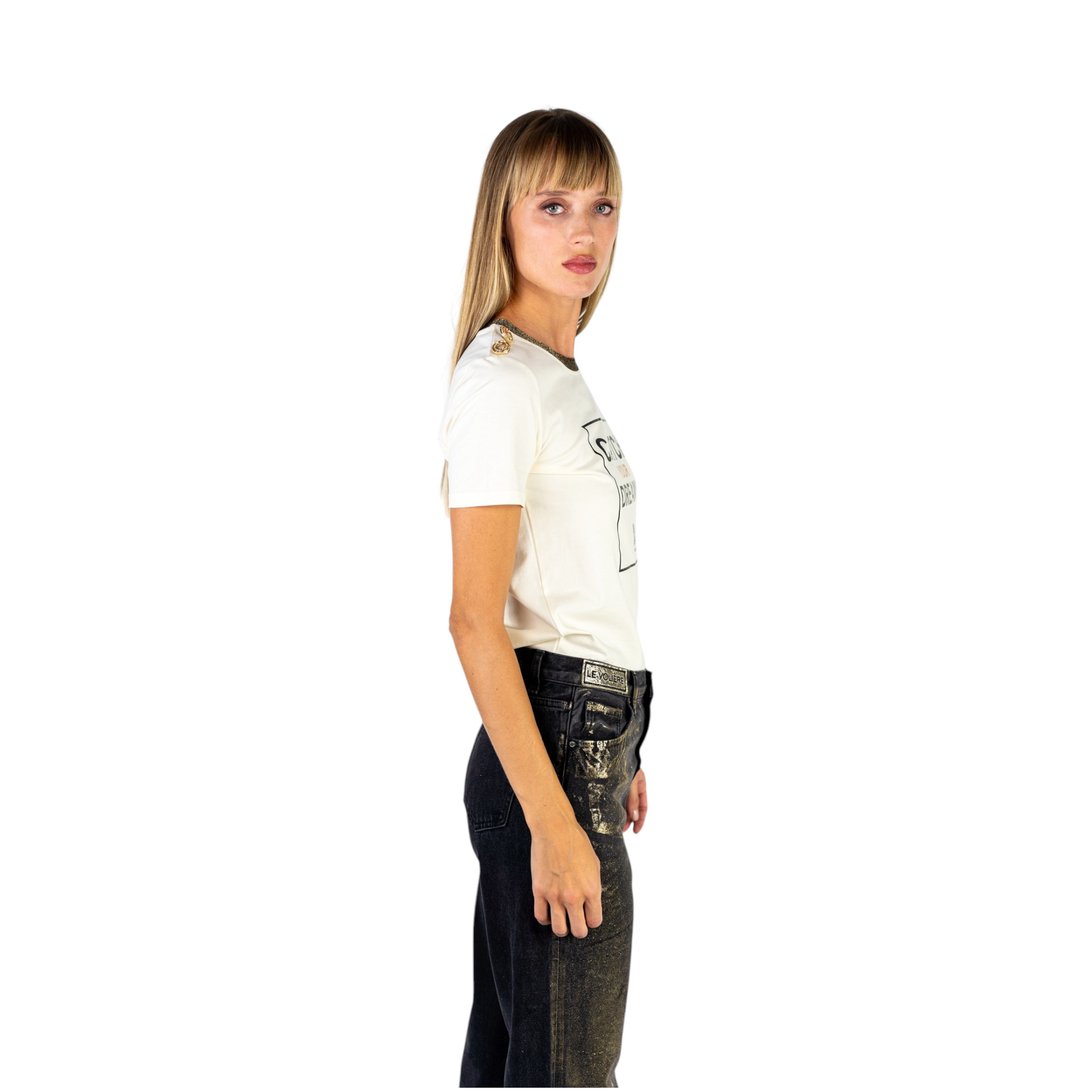 T-shirt girocollo mezza manica con stampa nera, colletto a costine in lurex oro e bottoni oro.