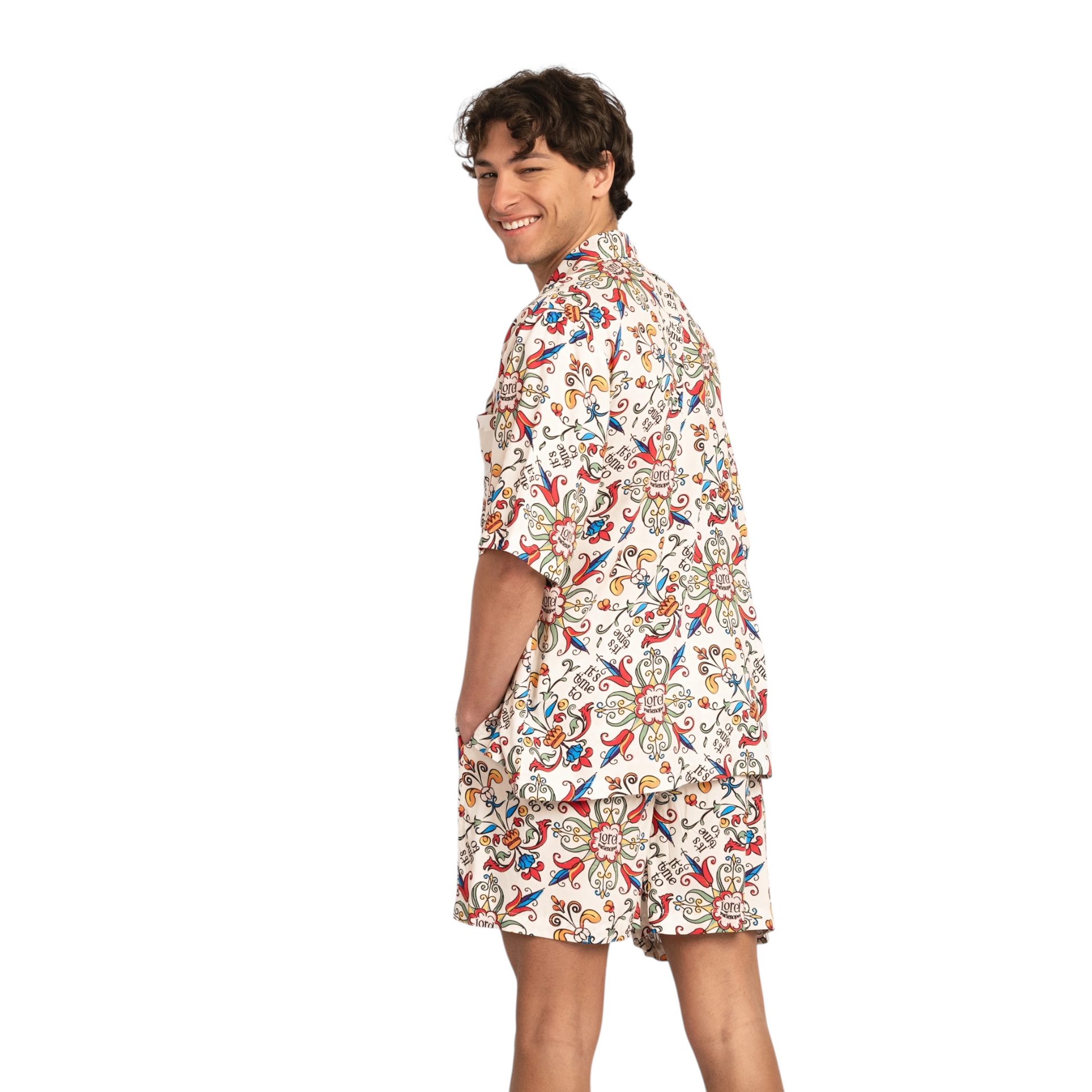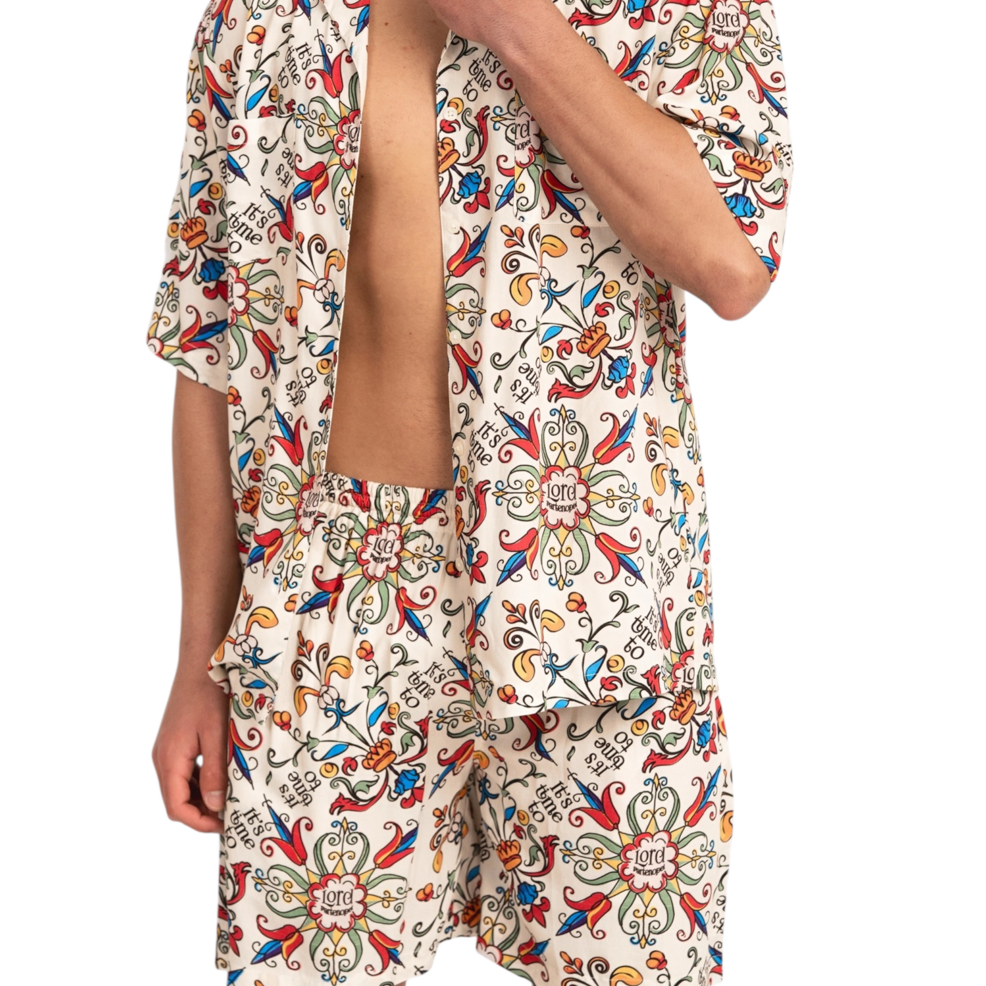 Questo set di Lord Partenopei presenta un raffinato coordinato in viscosa stampata composto da bermuda e camicia a manica corta. La base bianca con fantasia multicolor crea un'estetica distintiva, impreziosita dal logo stampato. Realizzato con vestibilità regular, questo set offre comfort e stile italiano ricercato per una clientela esigente.