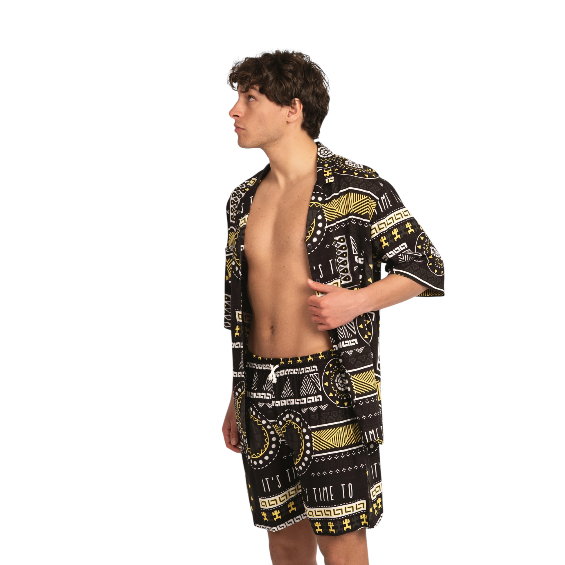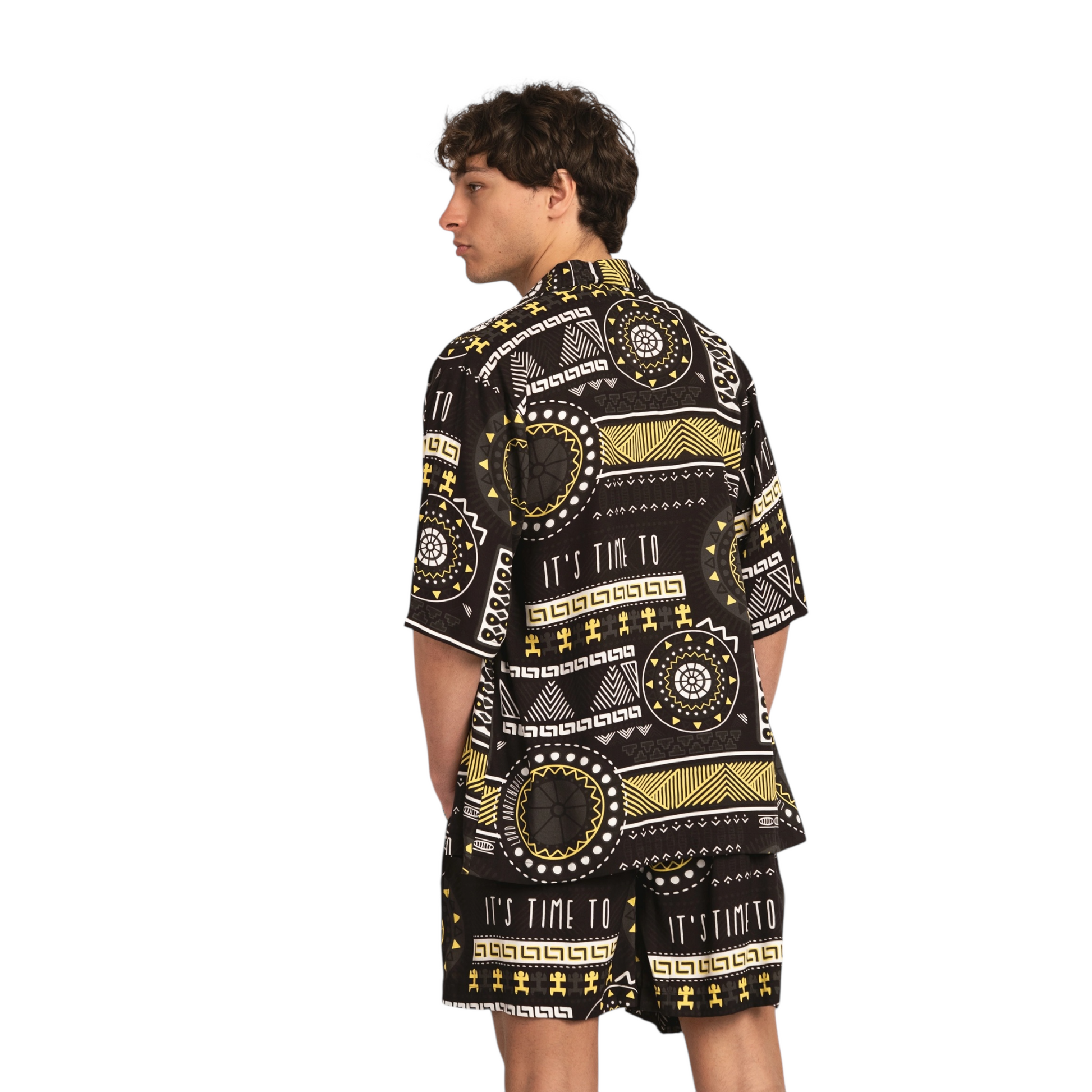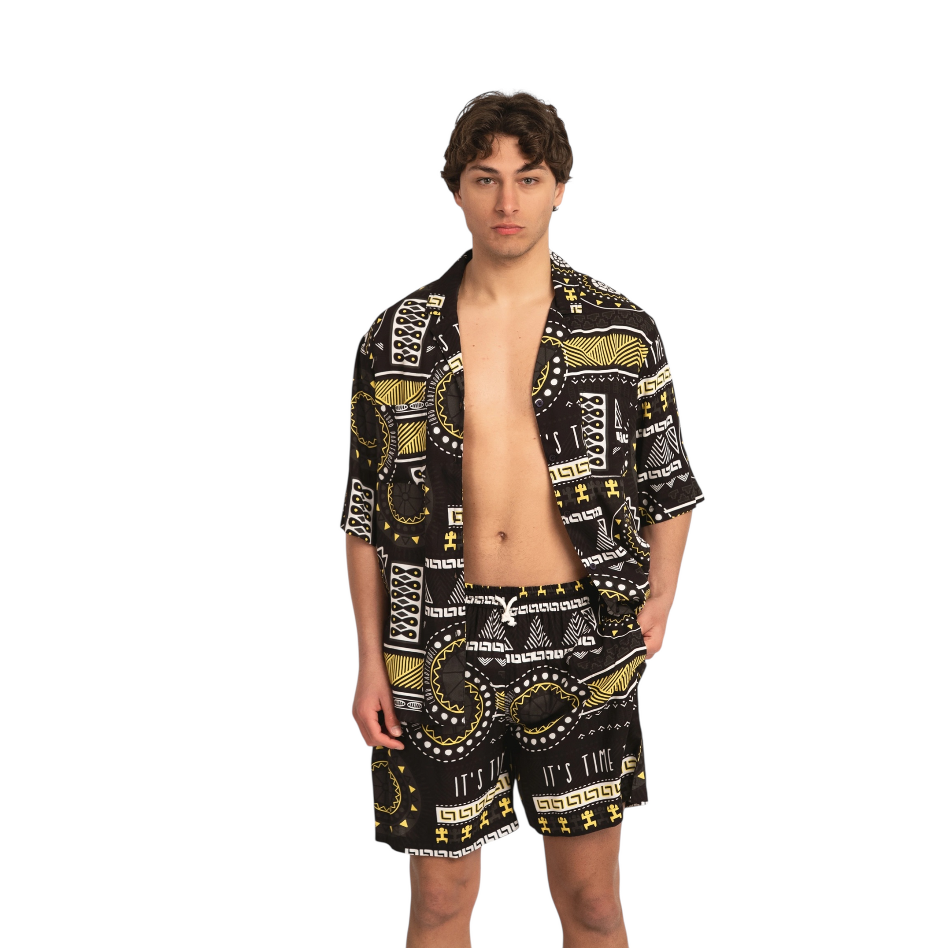 Questo set di Lord Partenopei presenta un raffinato coordinato in viscosa stampata composto da bermuda e camicia a manica corta. La base nera con fantasia tribale con colori a contrasto, crea un'estetica distintiva, impreziosita dal logo stampato. Realizzato con vestibilità regular, questo set offre comfort e stile italiano ricercato per una clientela esigente.