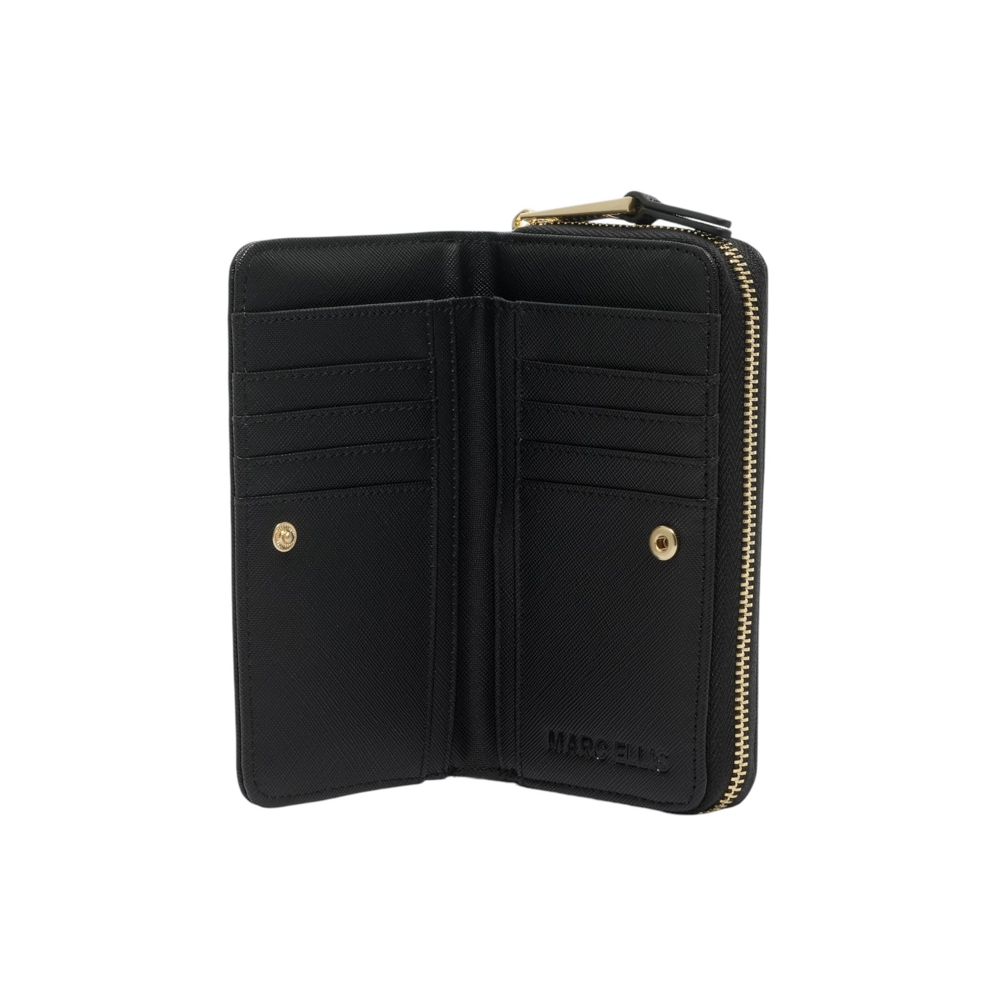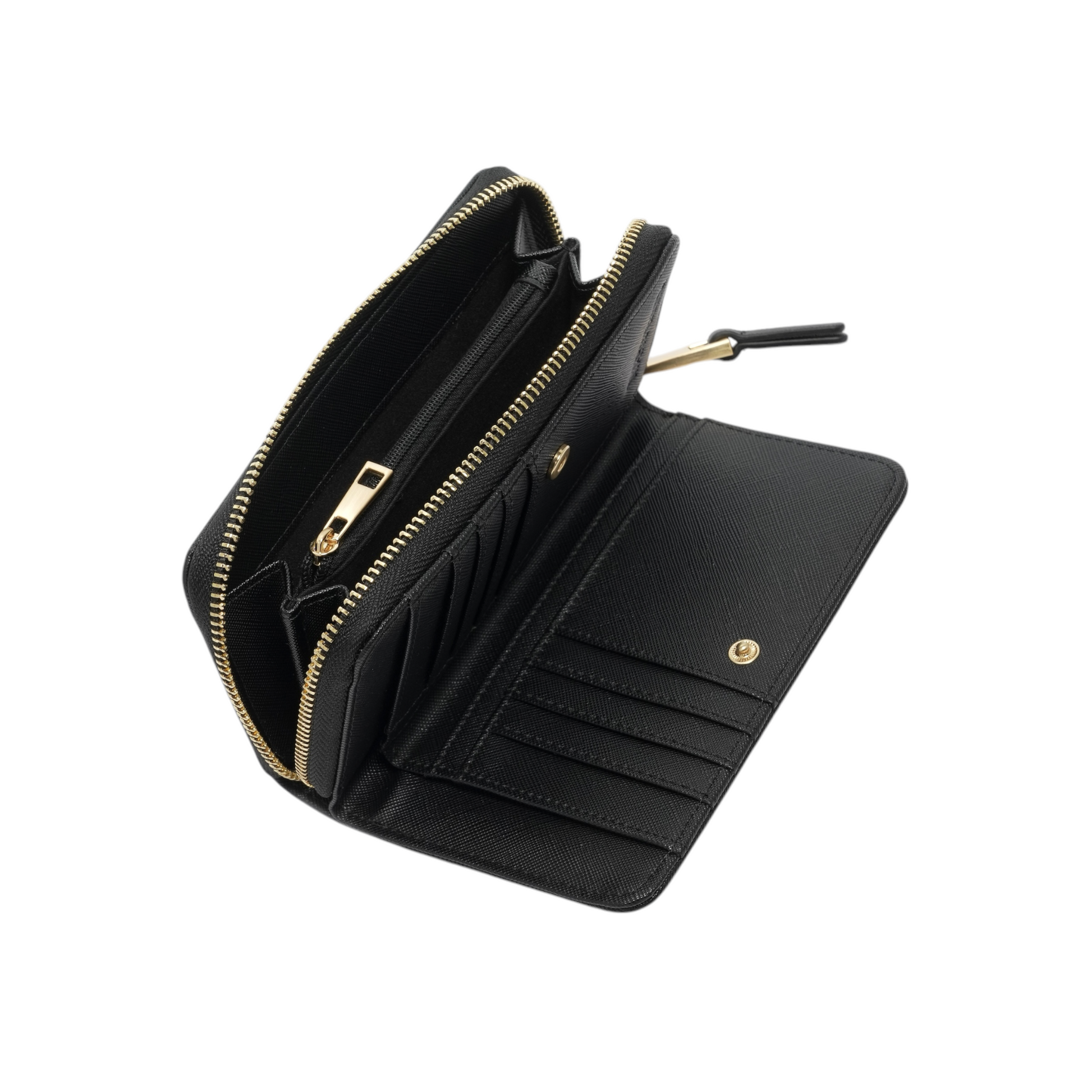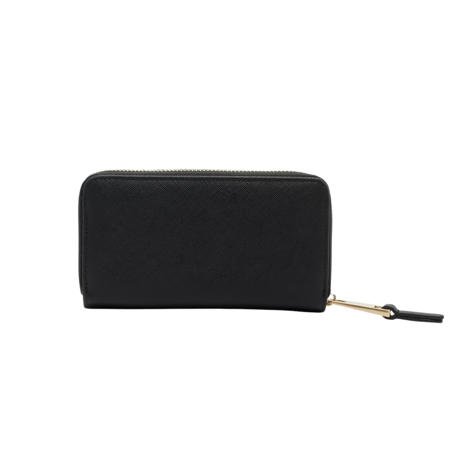 Portafoglio in ecopelle nera effetto saffiano con logo lettering in metallo sul davanti. Scomparto principale con tasca portamonete con zip, 2 scomparti per banconote e chiusura con zip all around. Organizer anteriore con scomparto per banconote, 8 slot per card e chiusura con bottone a pressione. Galvaniche oro.