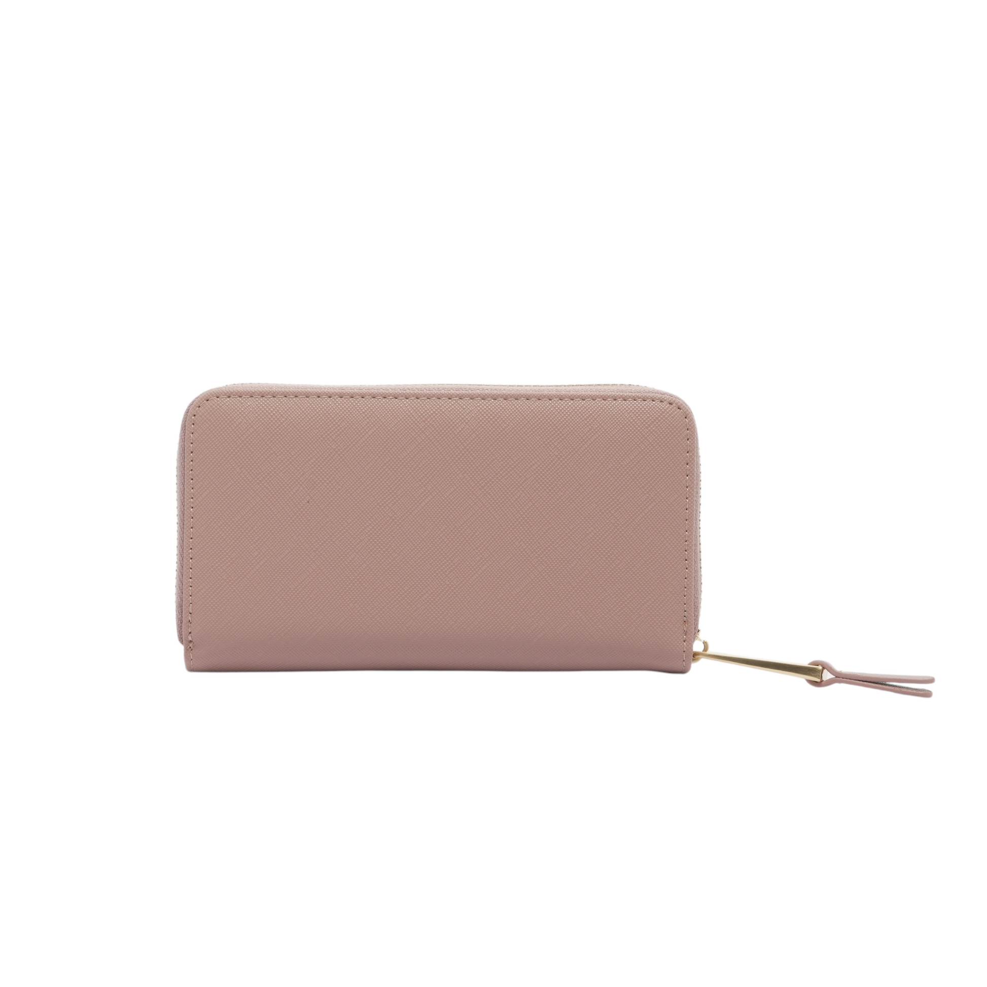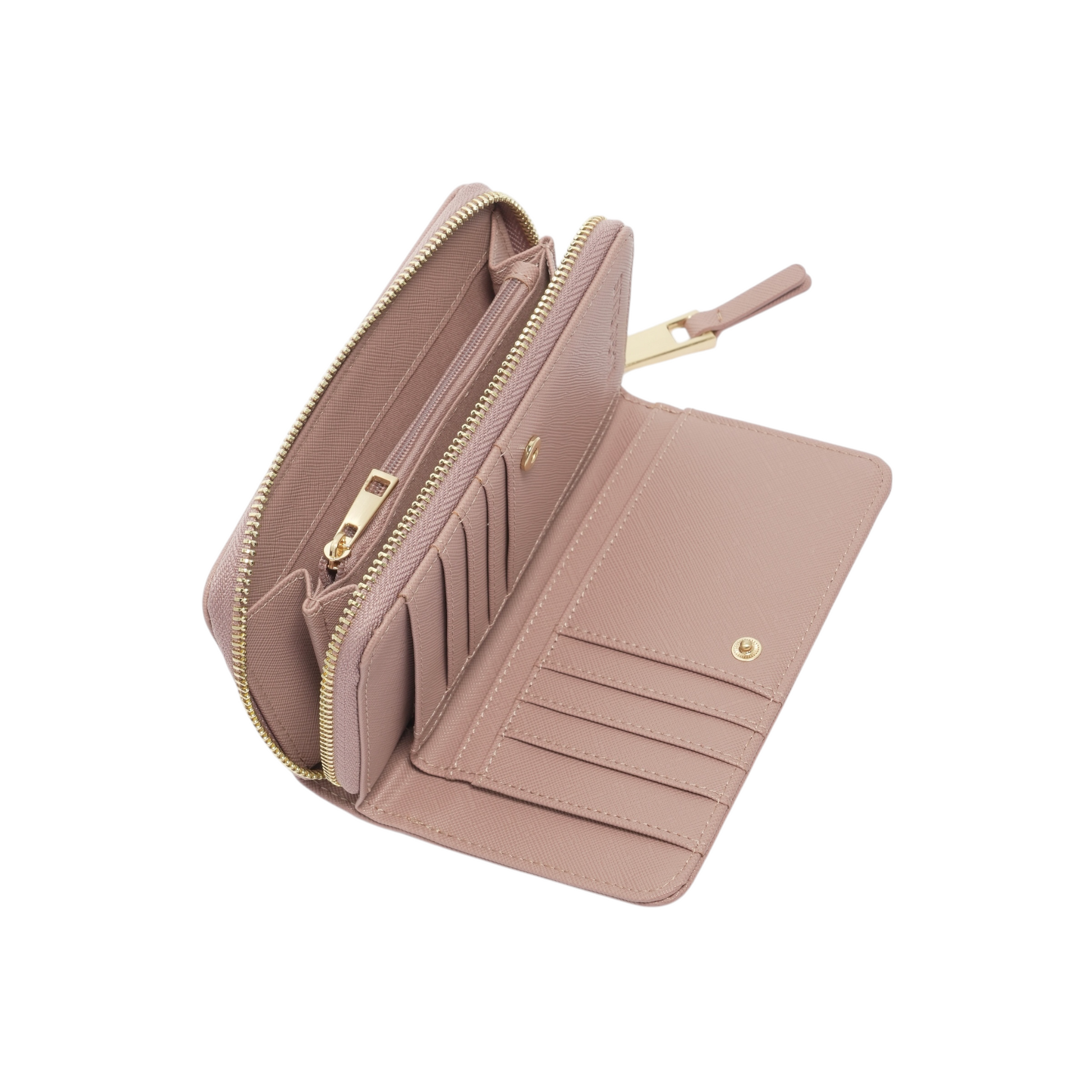 Portafoglio in ecopelle nera effetto saffiano con logo lettering in metallo sul davanti. Scomparto principale con tasca portamonete con zip, 2 scomparti per banconote e chiusura con zip all around. Organizer anteriore con scomparto per banconote, 8 slot per card e chiusura con bottone a pressione. Galvaniche oro.