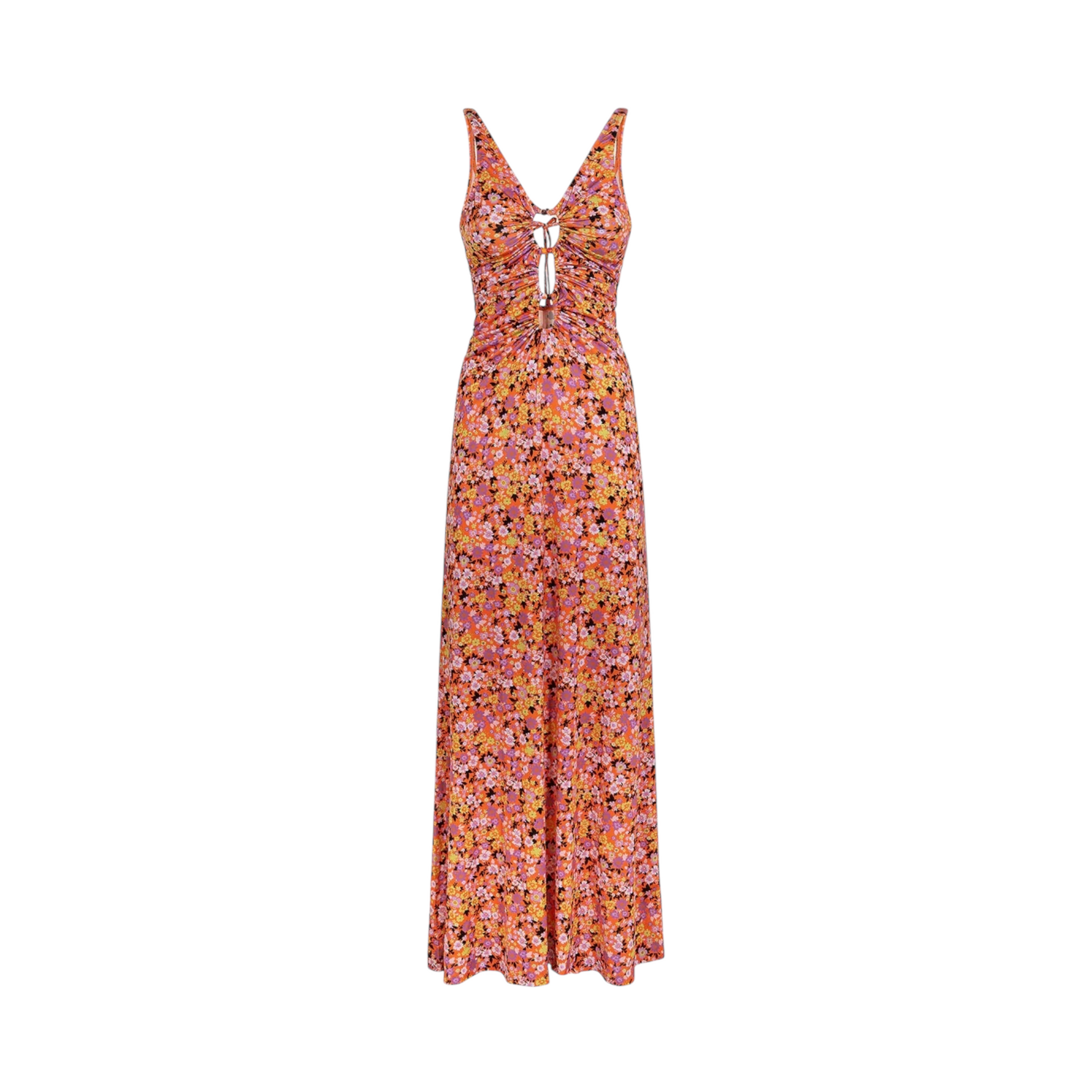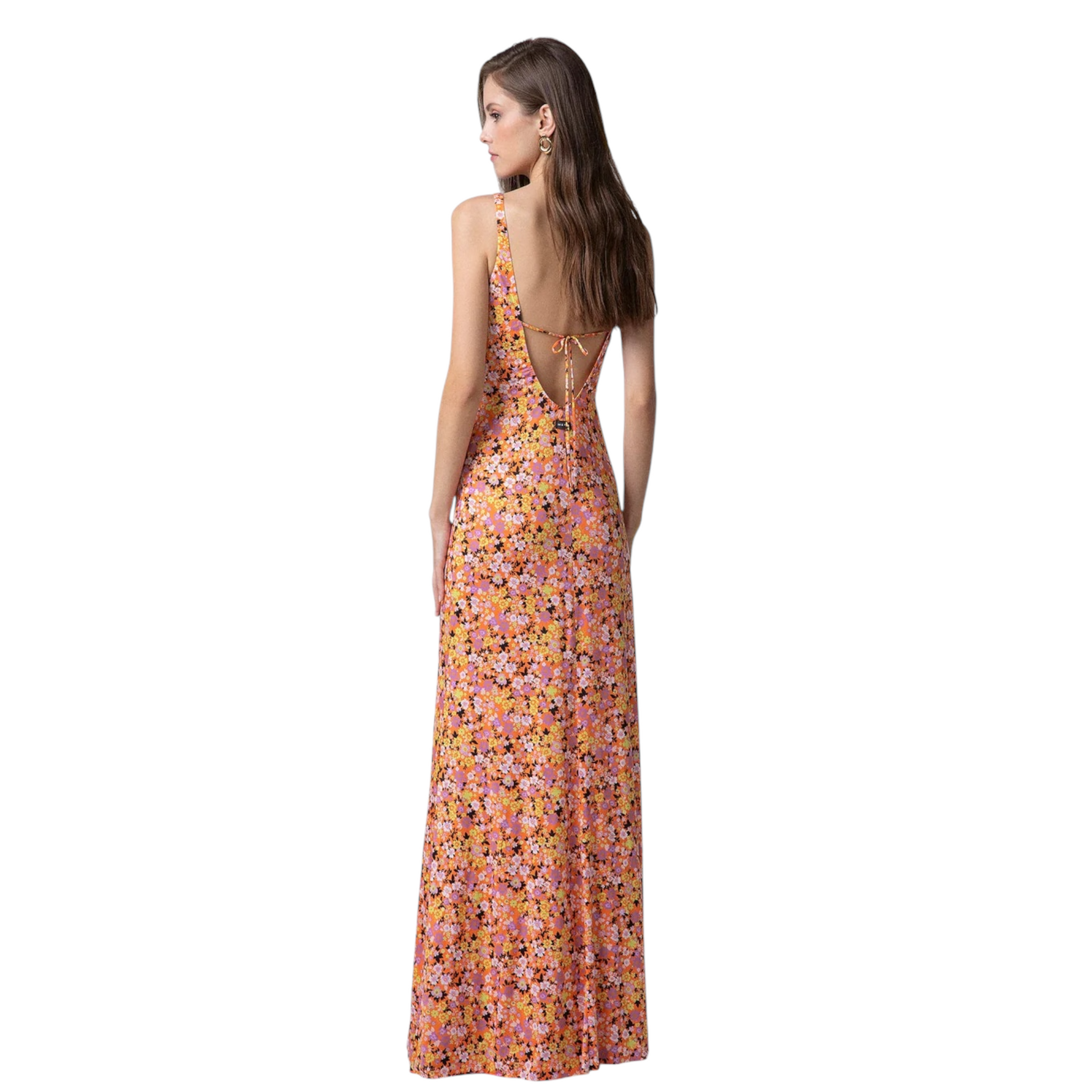 Questo elegante vestito lungo Me Fui presenta una delicata fantasia floreale, bretelle sottili e un raffinato oblò sul davanti. Con dettagli di perline e allacciatura sulla schiena, il vestito è abbinato al Monokini in coordinato per un look da spiaggia completo e di tendenza.