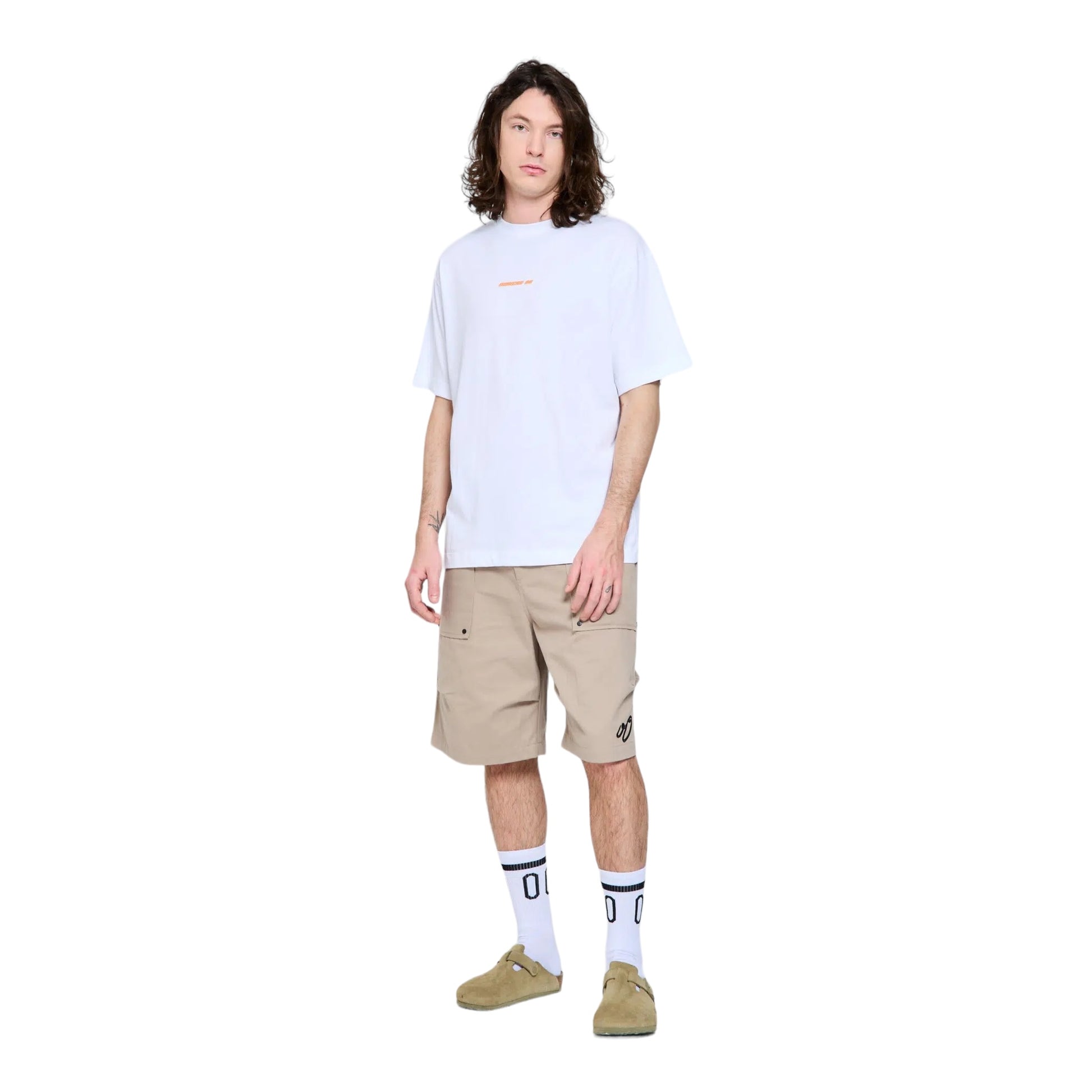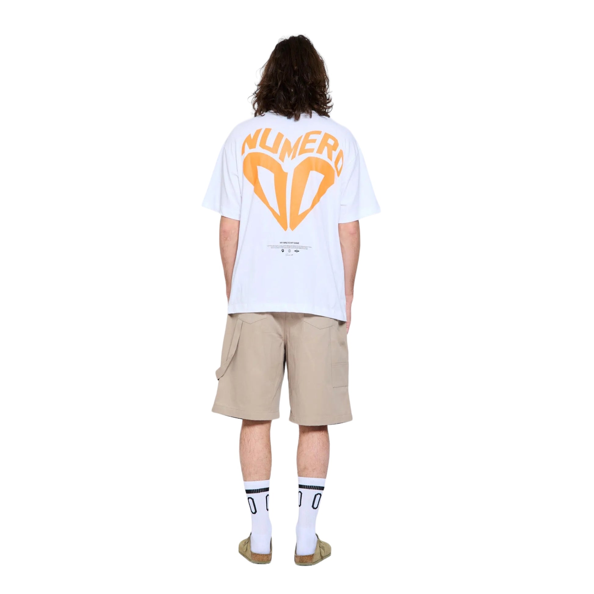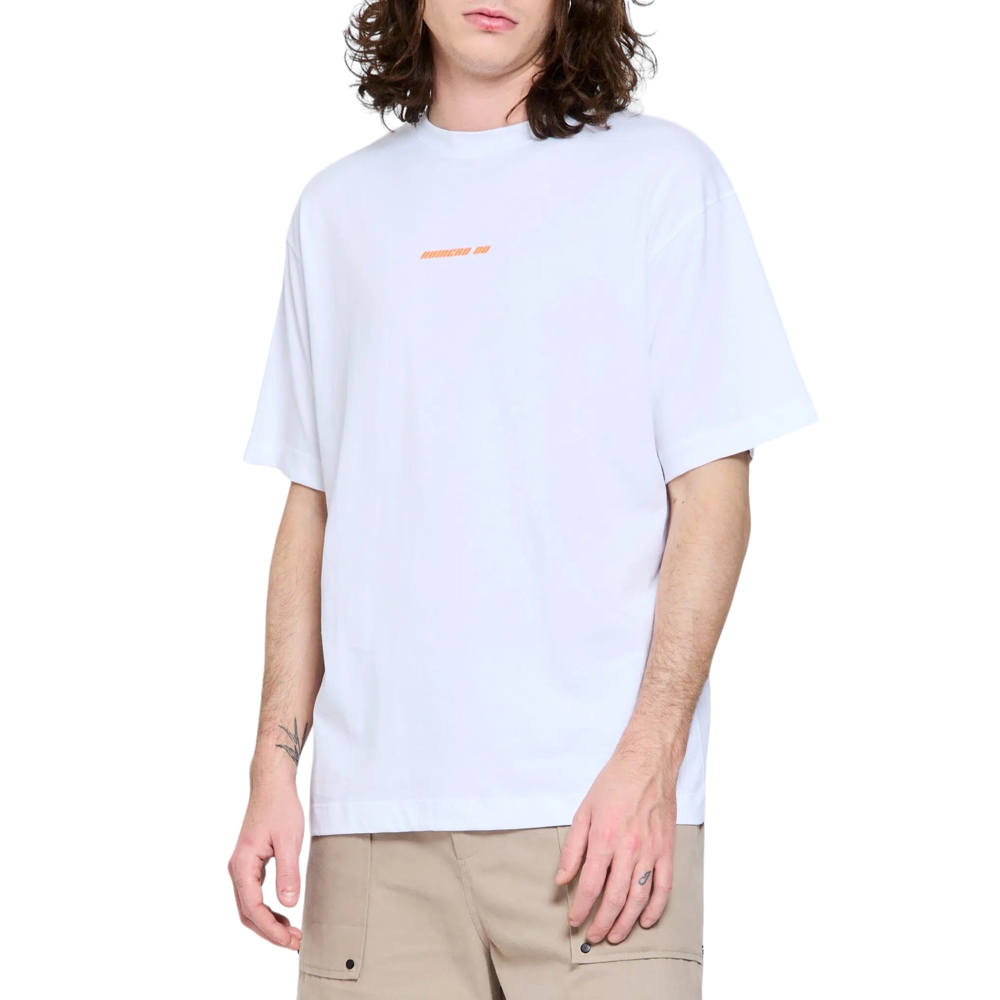 T-shirtt girocollo, mezza manica con stampa arancione NUMERO 00 sul retro. Vestibilità over size. Modello 186 cm - Taglia XL.