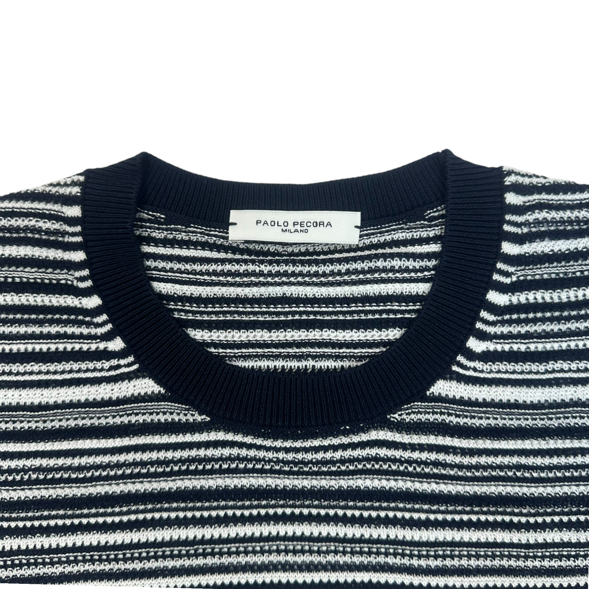Maglia girocollo fantasia Paolo Pecora è perfetta per le giornate estive. Realizzata in filato di cotone con lavorazione a righe, offre un look moderno e alla moda. I dettagli a costine sul fondo, collo e polsini garantiscono una vestibilità comoda e confortevole. Aggiungi un tocco di stile al tuo guardaroba con questa maglia versatile.