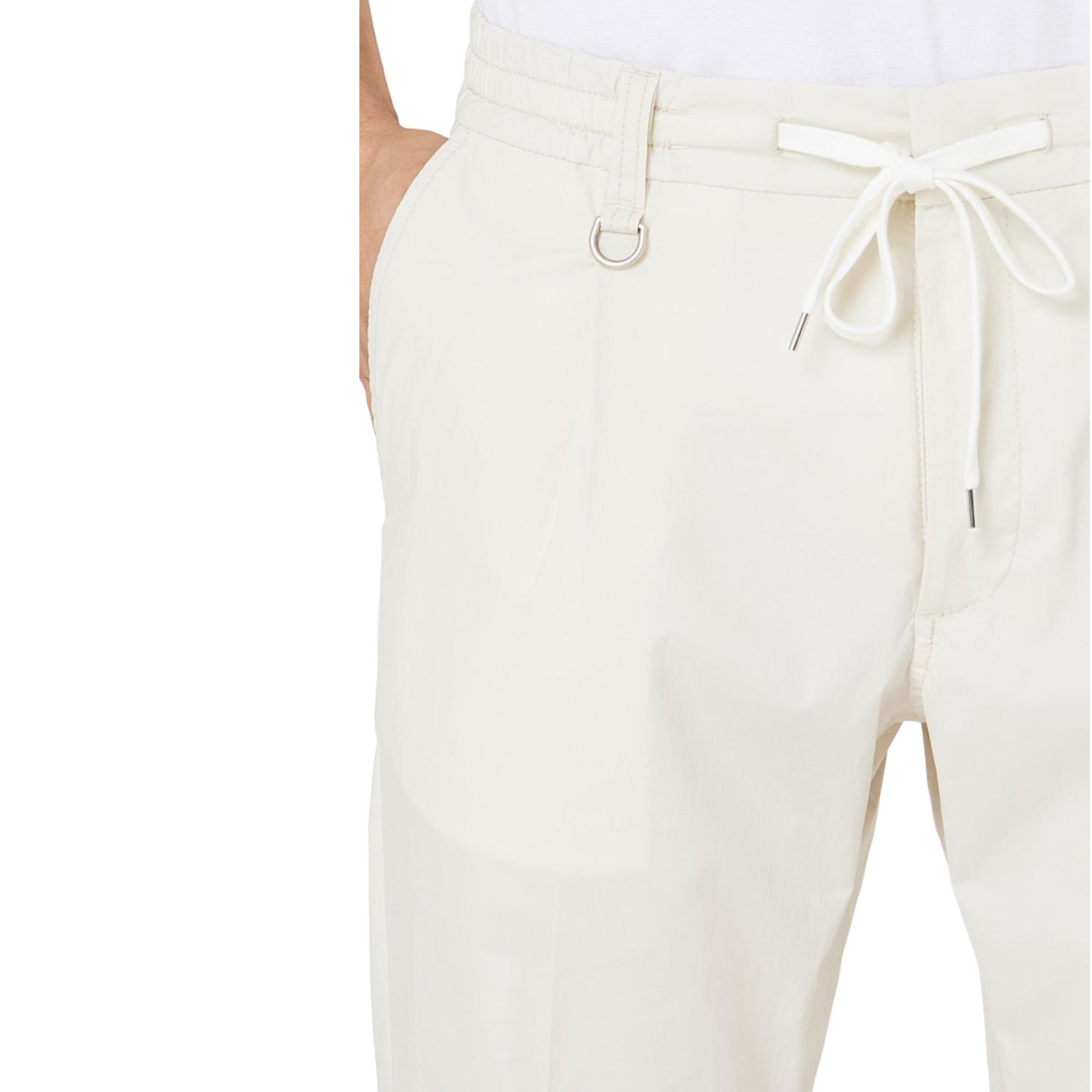 Pantalone con pinces e tasche a filo. Vita elasticizzata, regolabile con laccio.