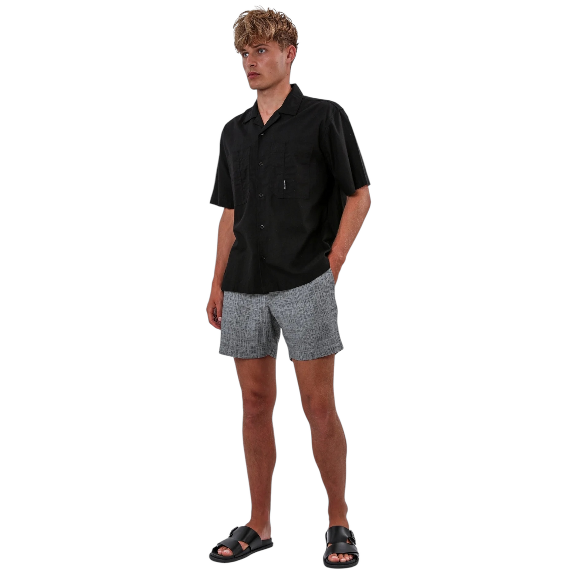 La Corps Shirt nera ha una vestibilità regolare ed è realizzata in un pregiato misto lino per un comfort leggero. Questo modello a maniche corte con colletto classico e abbottonatura è estremamente versatile e può essere indossato da solo o aperto su un gilet o una t-shirt per un look rilassato e stratificato.