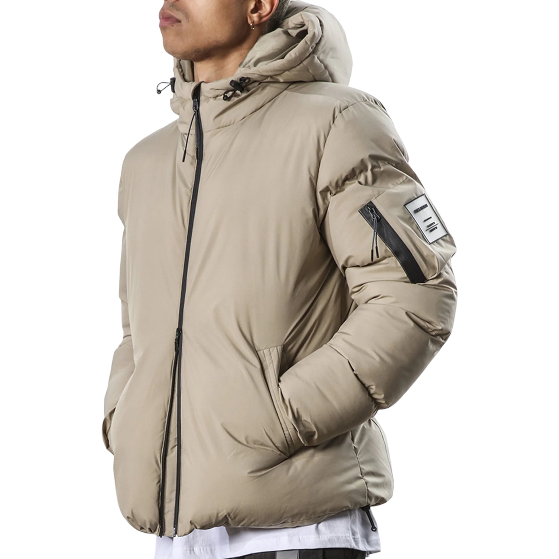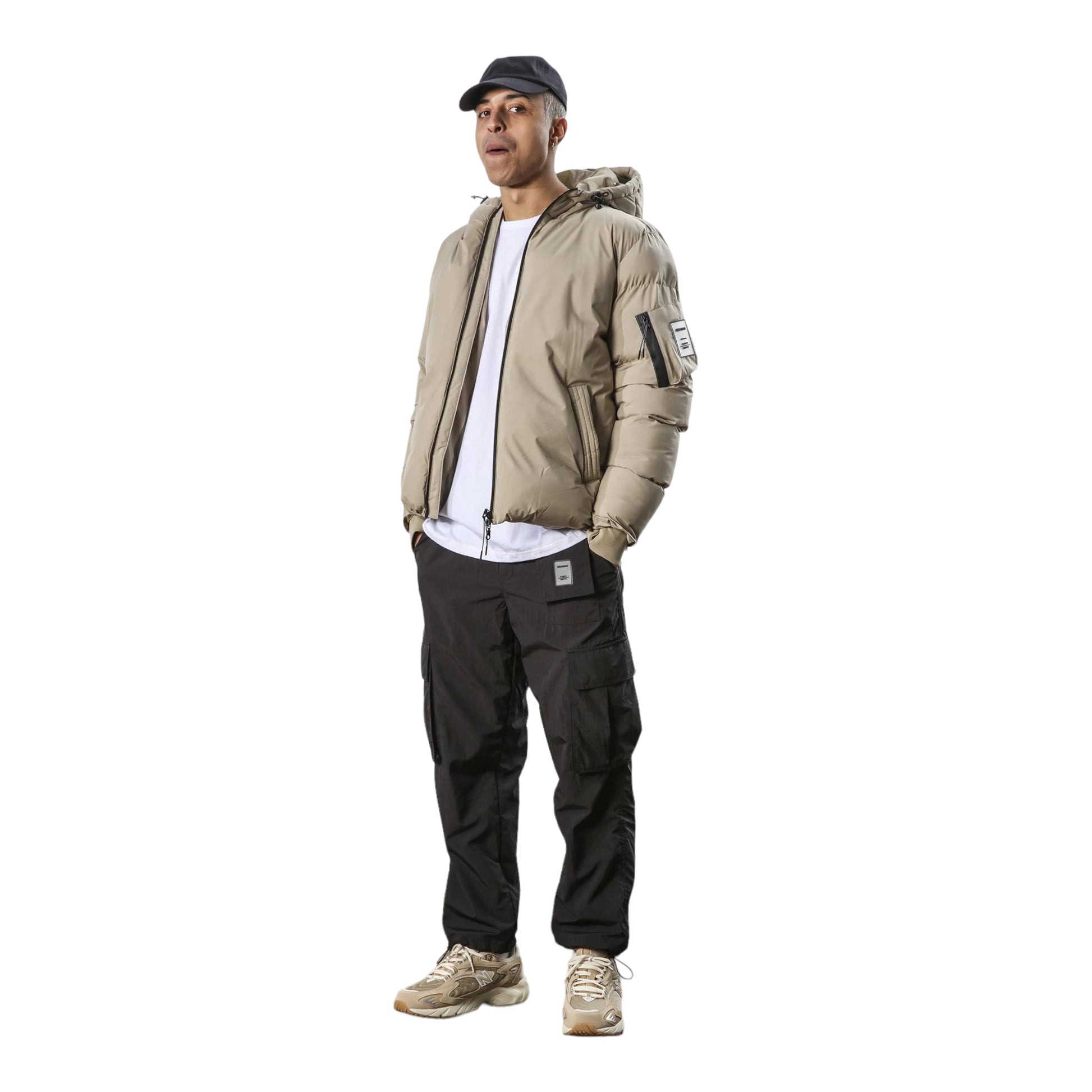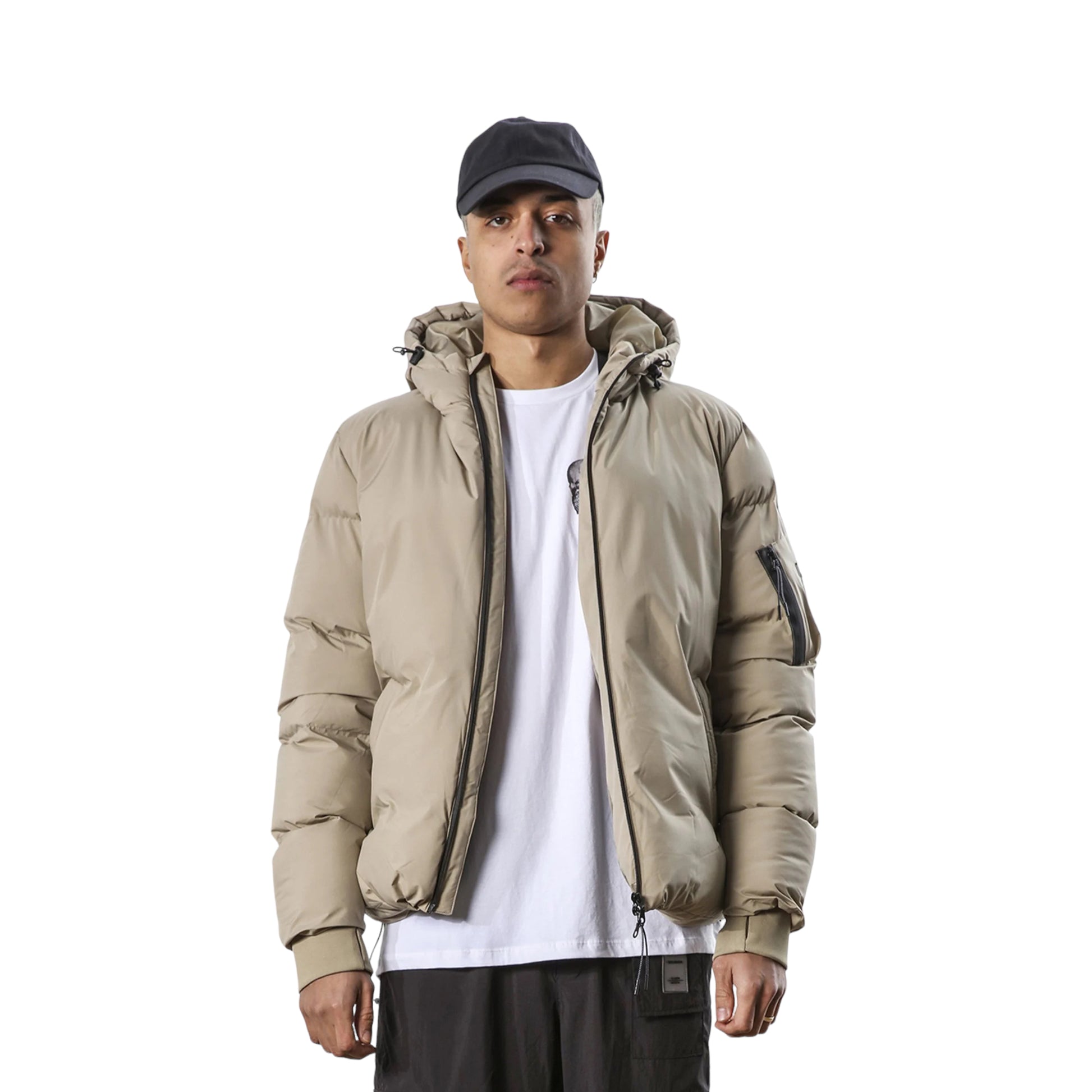 Giubbotto imbottito in tessuto, con cappuccio regolabile con elastico. Tasche frontali e chiusura con zip.