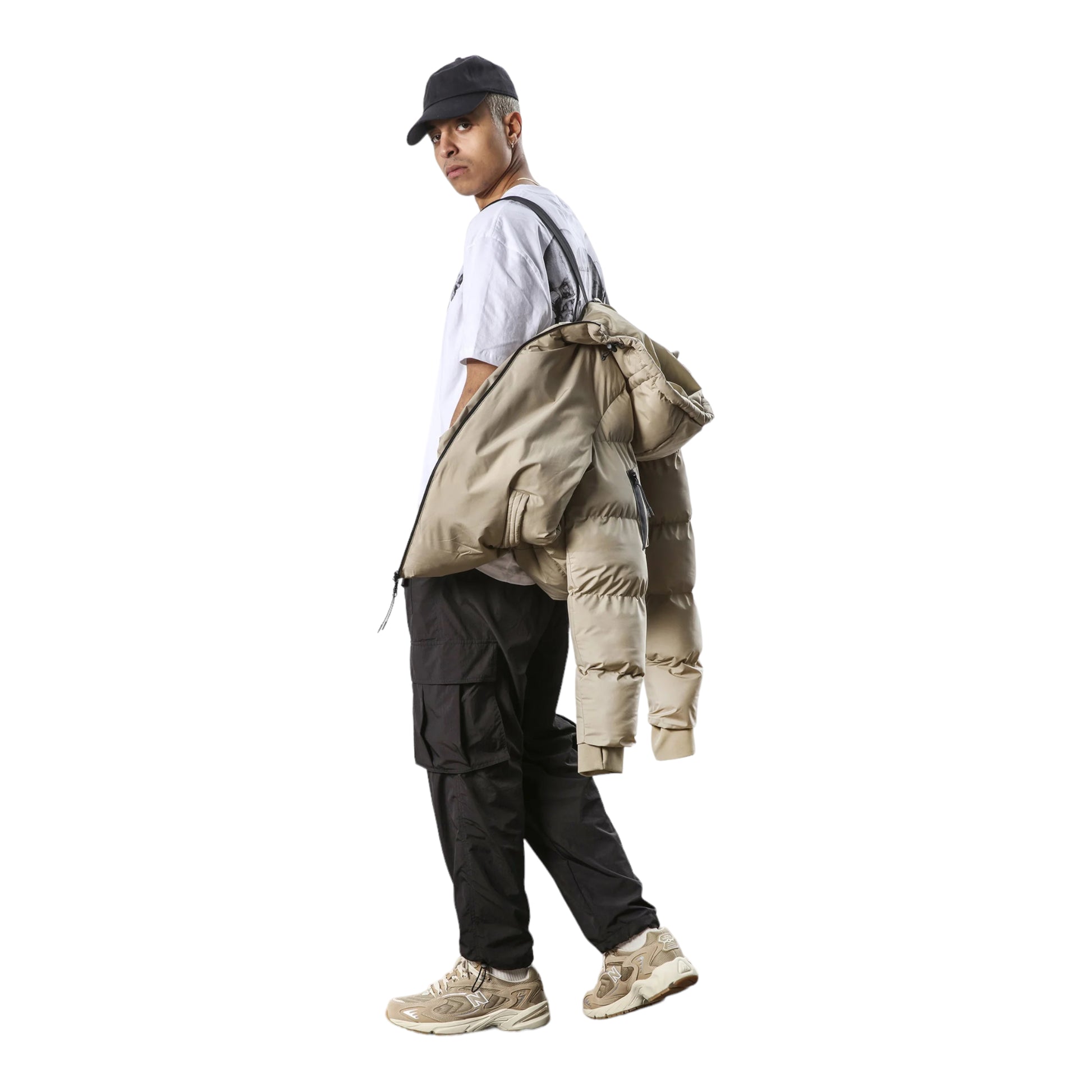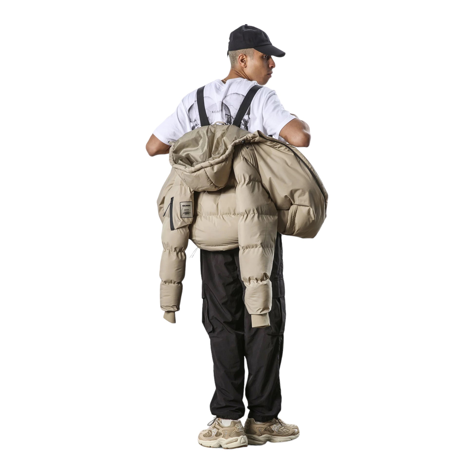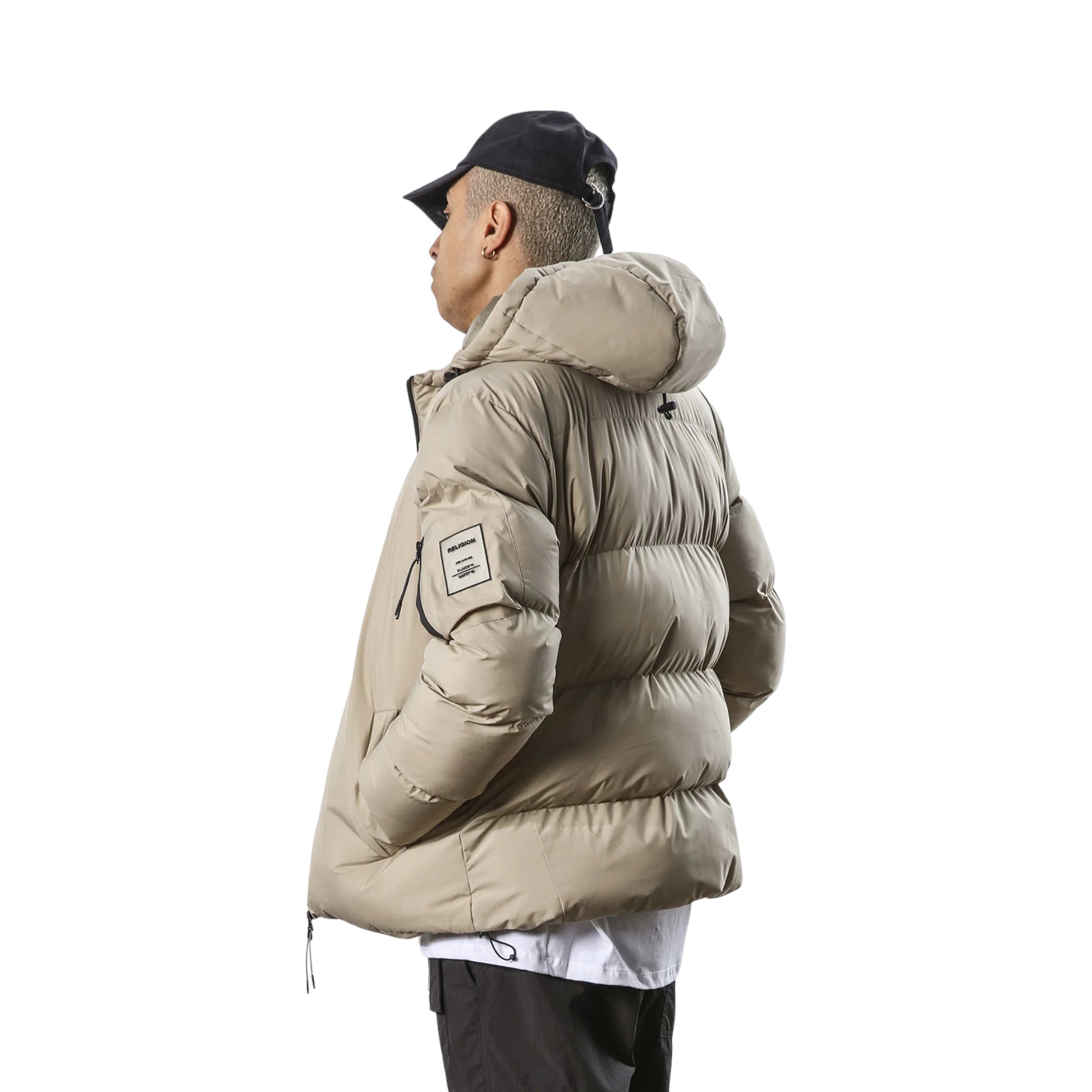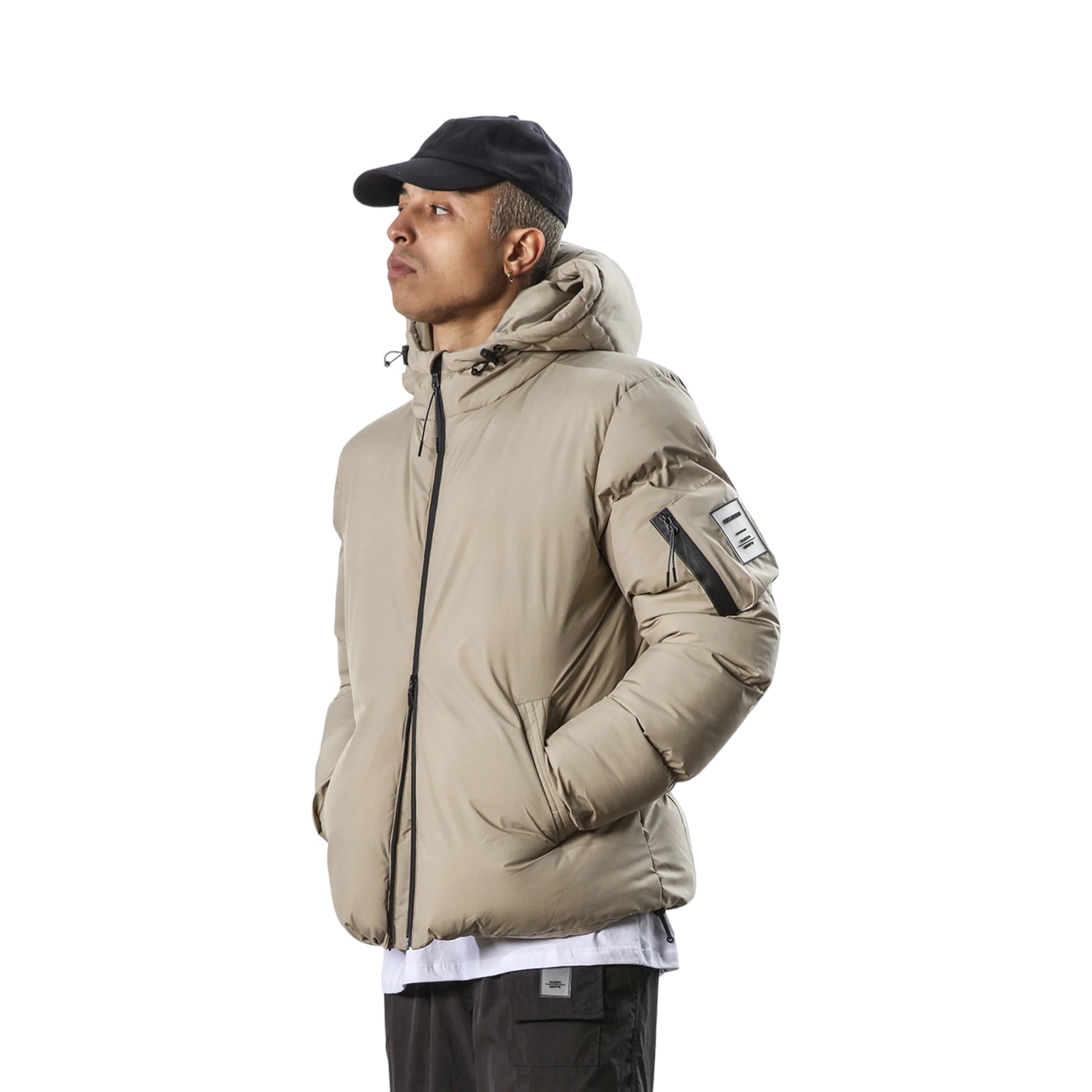 Giubbotto imbottito in tessuto, con cappuccio regolabile con elastico. Tasche frontali e chiusura con zip.
