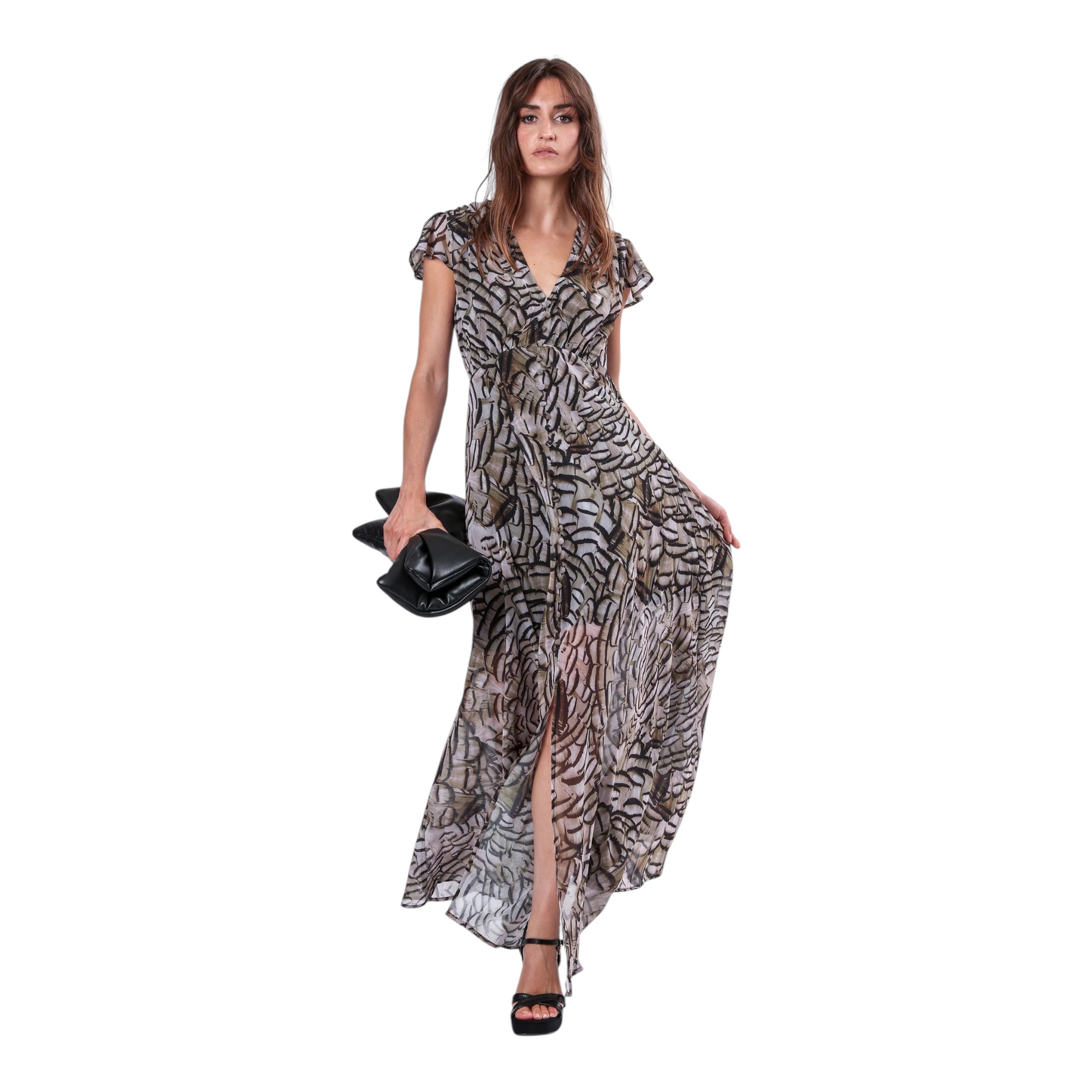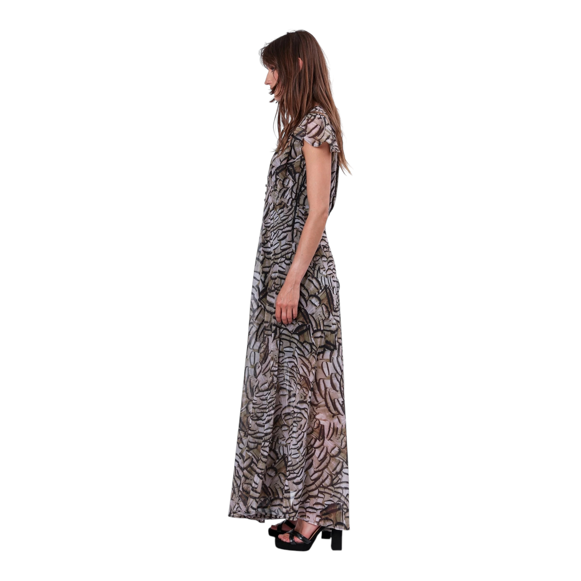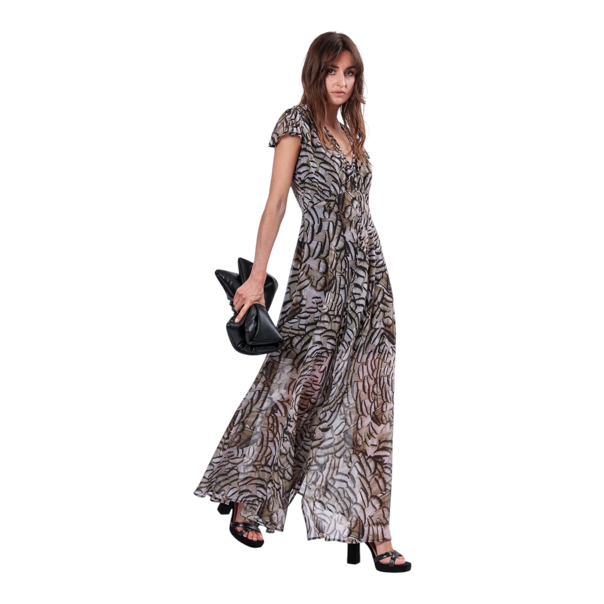 Il maxi abito Indium è una splendida miscela di eleganza e raffinatezza nella nostra stampa Plume in tonalità seppia. Questo abito dal taglio sbieco è caratterizzato da una scollatura a V e da maniche corte, per una silhouette aggraziata e senza tempo. La lunghezza maxi e lo spacco centrale sul davanti aggiungono un tocco di fascino, mentre i dettagli con finti bottoni ne esaltano il fascino classico. Perfetto per ogni occasione speciale, il maxi abito Indium emana stile e raffinatezza senza sforzo, assicurandovi di apparire e sentirvi al meglio ovunque andiate. Il tessuto è realizzato con il 55% di poliestere riciclato, il che lo rende una scelta ecologica. La modella indossa una taglia S. Lunghezza dall'alto: 145 cm