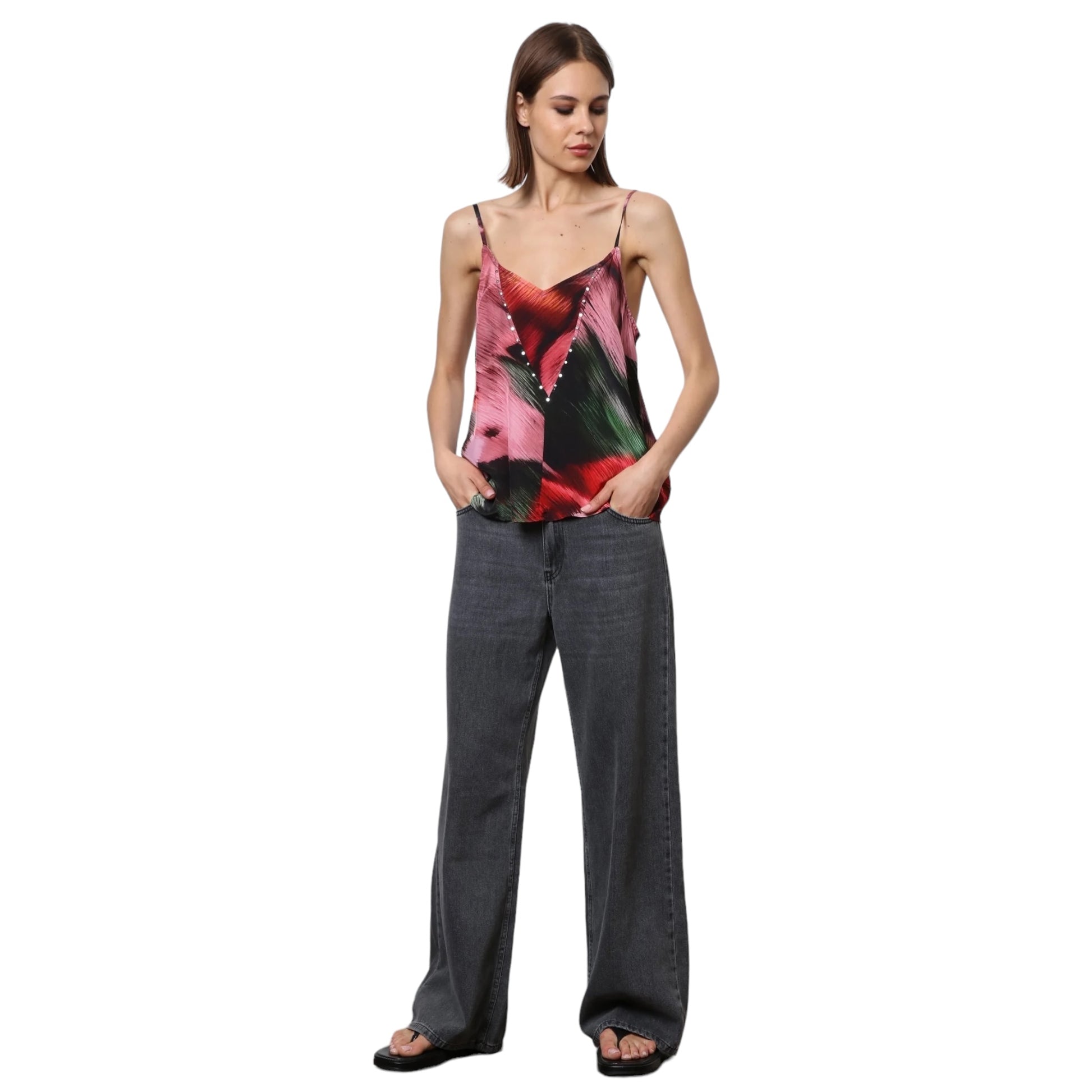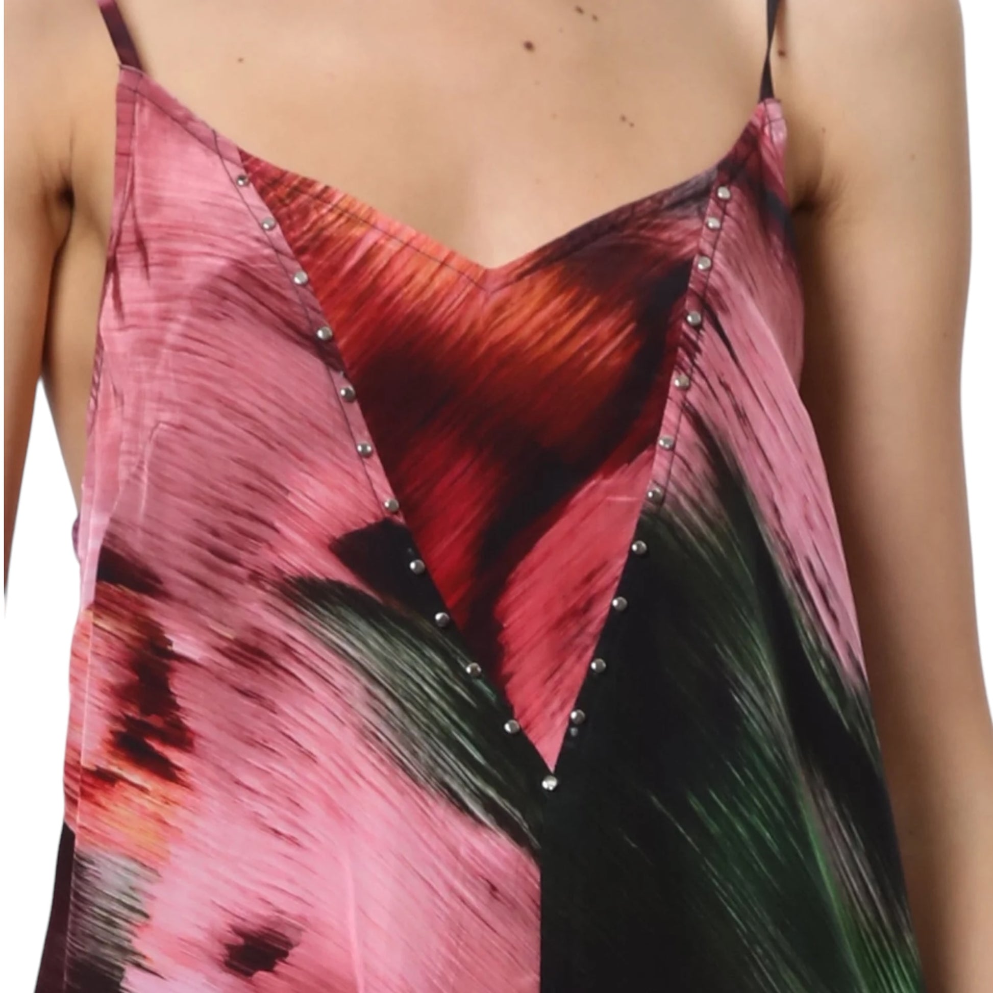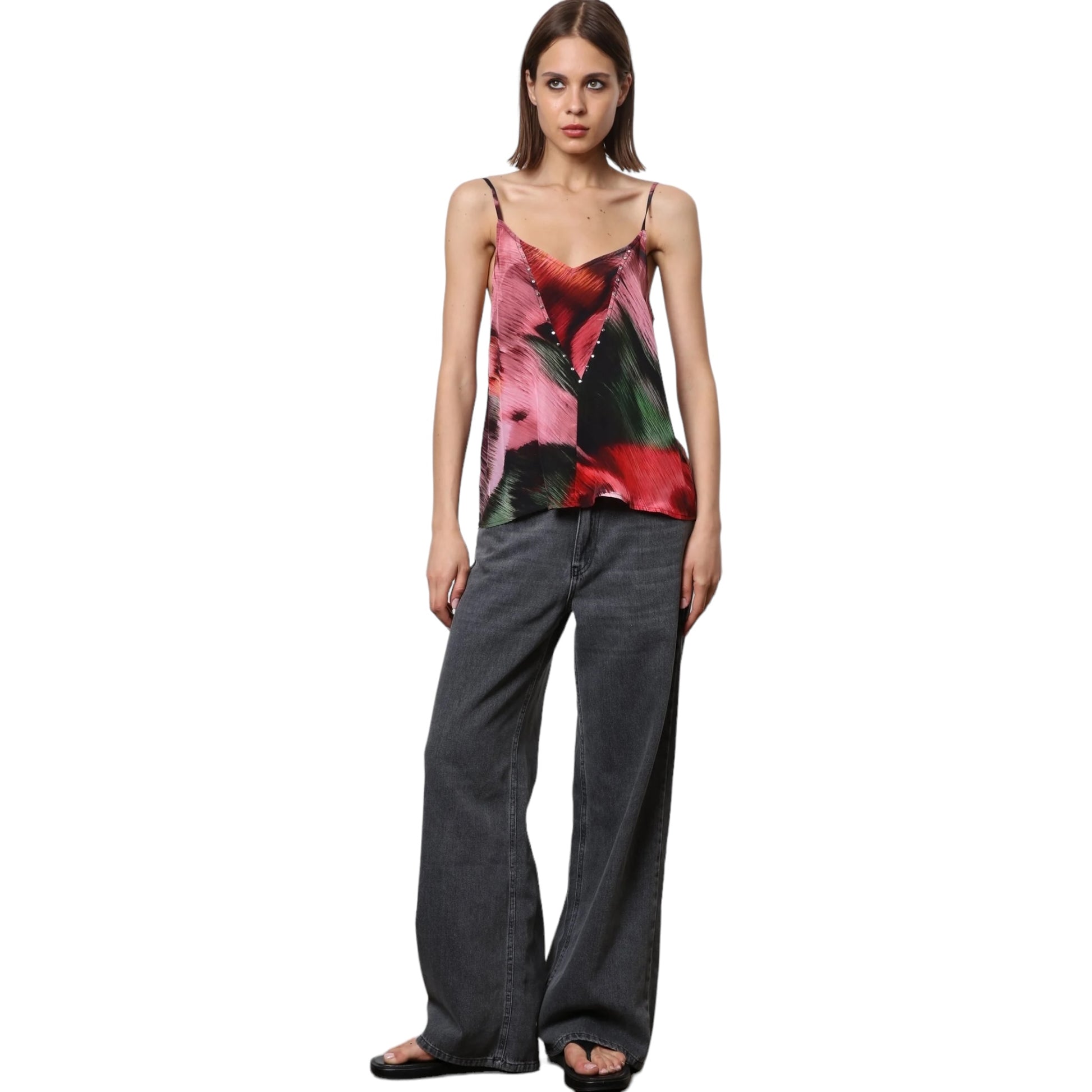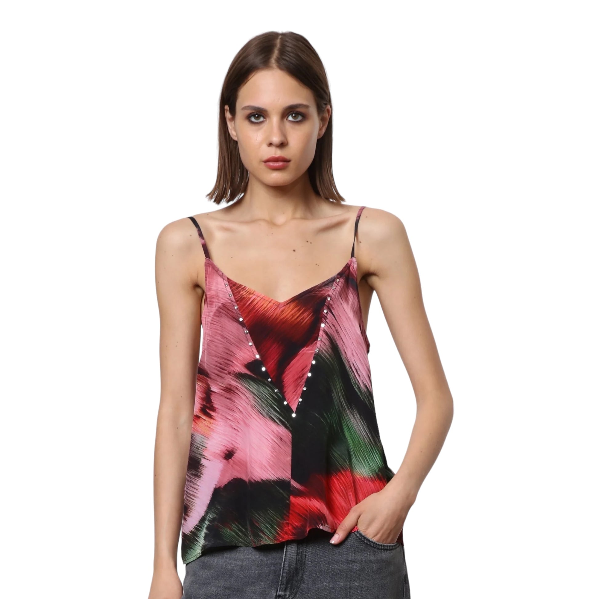 The Luster Camisole is a captivating camisole top crafted from vegan silk. Embrace the abstract Obscure print in coral and khaki, designed to turn heads. With a regular fit and a stylish V-neckline, this camisole offers adjustable straps for the perfect fit. Adorned with stud detailing at the front, it exudes a touch of elegance. Wear it with jeans or shorts for a relaxed summer look. Model wears size S, chest circumference: 89 cm. Lightly steam this style before trying it on as the fabric might crease during shipping.
