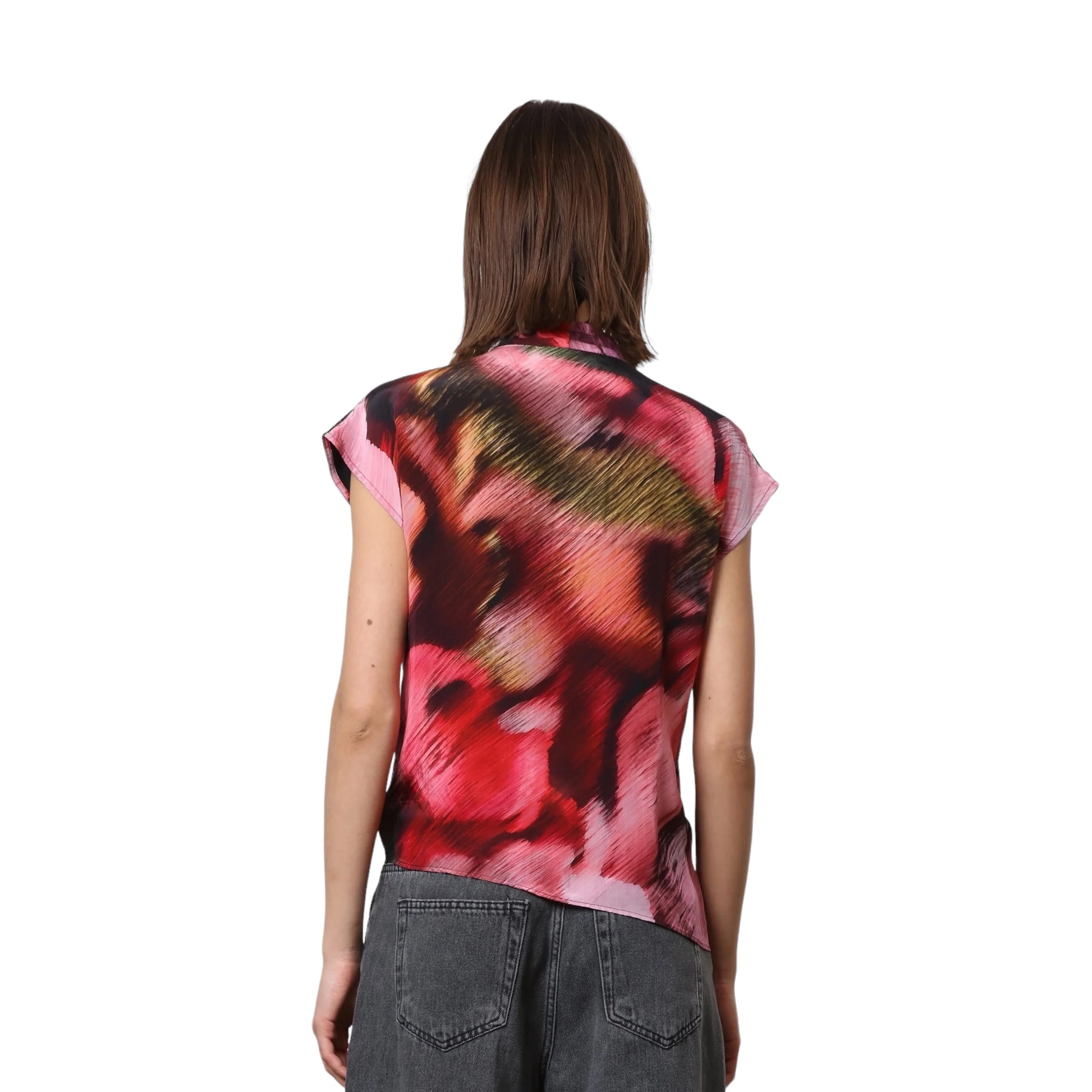 The Luster Top is a versatile desk-to-dinner must-have, crafted from vegan silk with a jersey lining in our abstract Obscure print in coral and khaki. This hip-length, cap-sleeve top features a V-neckline and a tie waist for a flattering silhouette. Turn heads this summer in the Luster top, no matter the occasion. Model wears size S, length: 58 cm, chest circumference: 96 cm. Lightly steam this style before trying it on as the shipping might have creased the fabric.